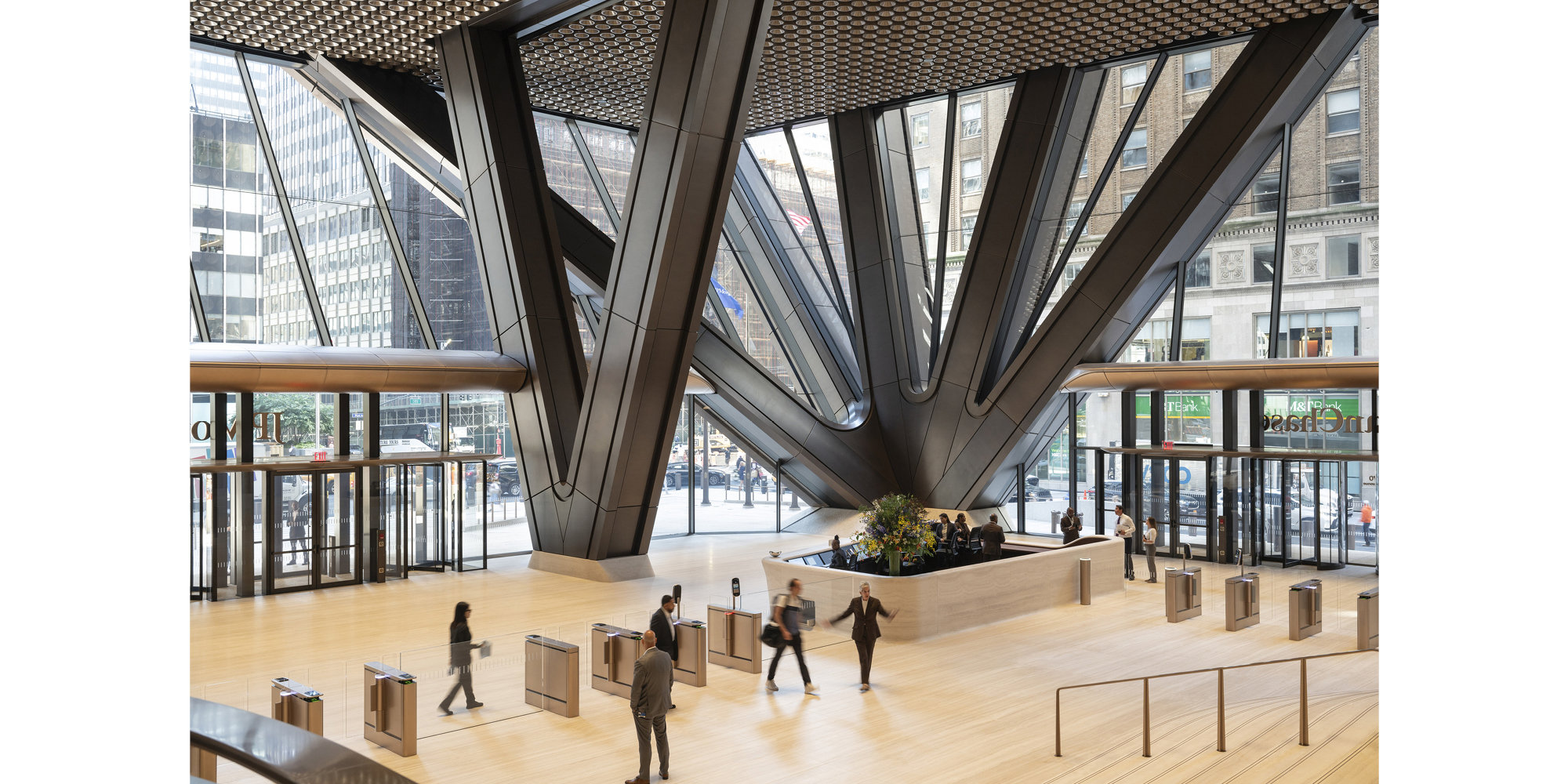 In 2018, Foster + Partners won the competition to design JPMorganChase’s new home for 10,000 employees and thousands of daily guests. The practice established an overall vision for the project and developed a state-of-the-art structural system to negotiate the site constraints below and at ground level. The innovative fan-column structure and triangular bracing allow the building to touch the ground lightly across the entire block, underpinning the essence of the design where the structure is the architecture and the architecture is the structure. By lifting the building approximately 80 feet (24 meters) off the ground, it extends the viewpoint from the Park Avenue entrance through to Madison Avenue.