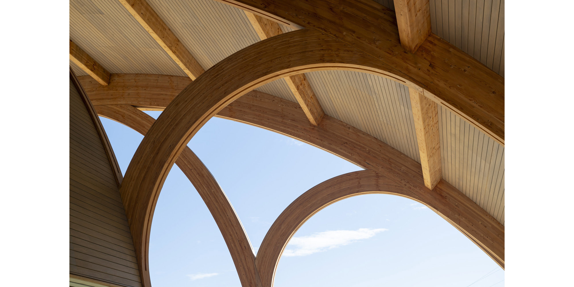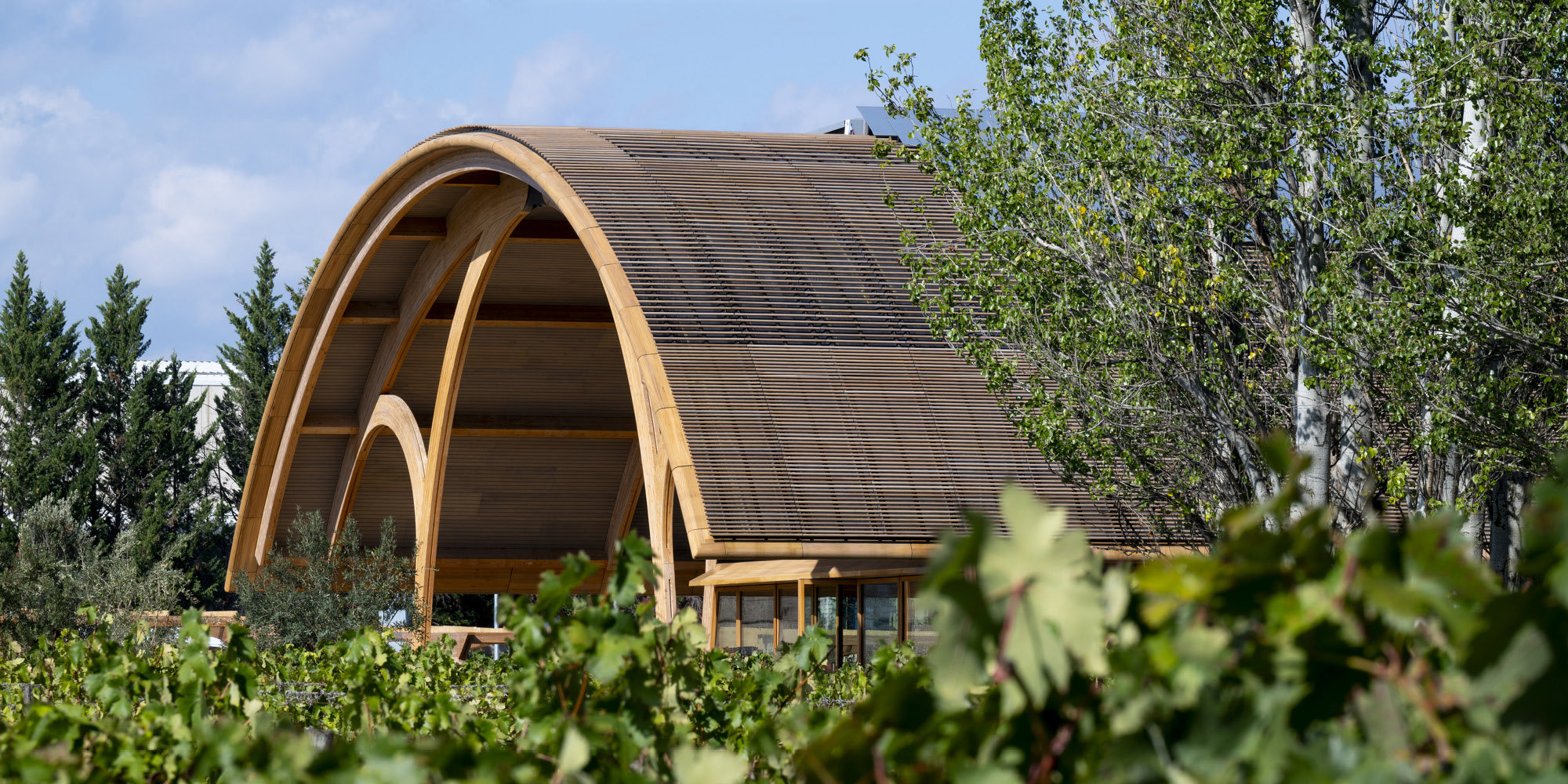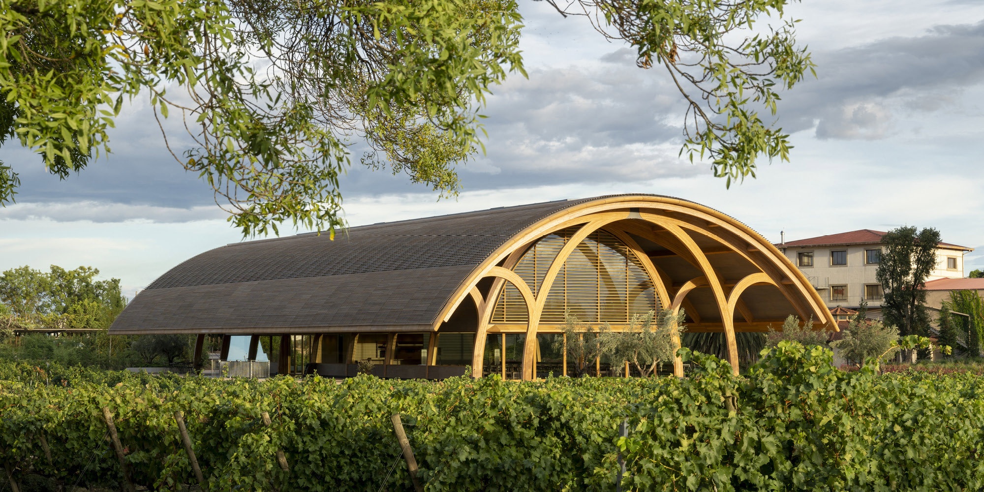 A gentle path leads to the new visitor centre, the main protagonist of the project. It is designed as a vaulted and column-free hall to create a spacious and flexible volume. The vaulted roof is inspired by the industrial heritage of the winery, reinterpreted as a lightweight structure is made from timber arches. The anti-funicular profile enhances structural performance with minimal materials, while its earthy colour palette allows the building to blend seamlessly with the landscape. An asymmetrical core connects with the mezzanine above, while creating two distinctive zones at the lower level, each with a different character. The upper level overlooks the entire visitor centre and the beautiful vineyard landscape beyond.