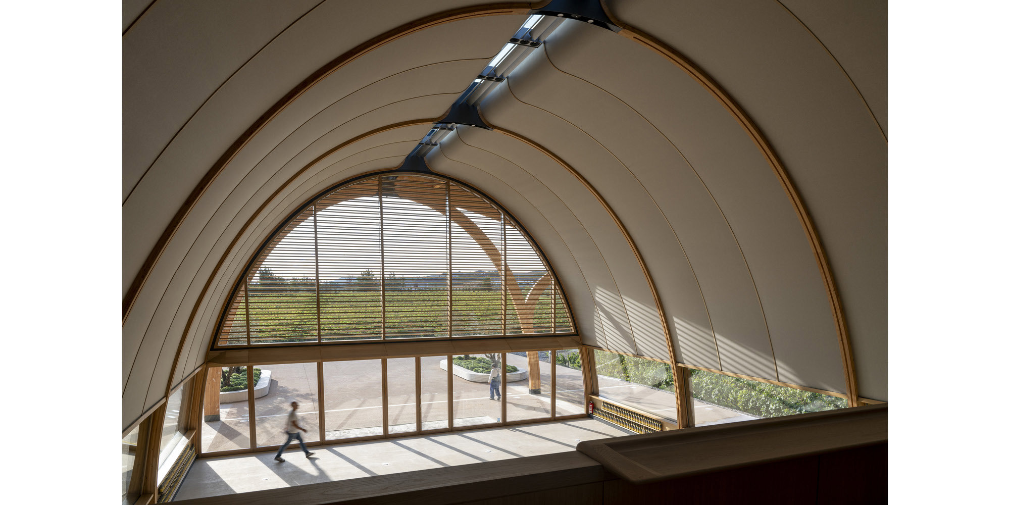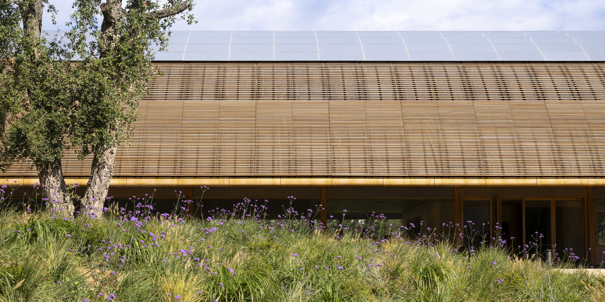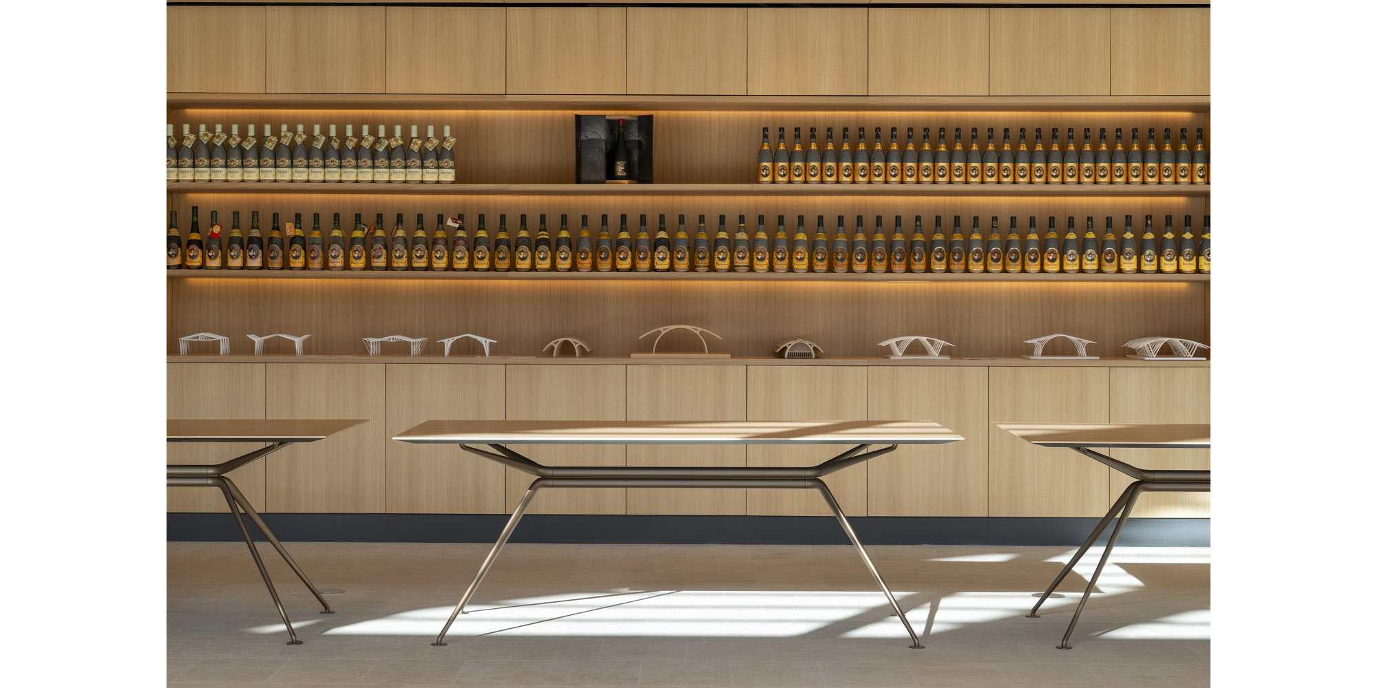 The new visitor centre is designated as a ‘Planet 1.0’ building – as its carbon emissions can easily be absorbed by the Earth’s green cover – making it a true sustainable exemplar. The building also adopts an Energy Plus strategy led by the photovoltaic panels on the roof that produce more energy than required for building operations. The excess energy is diverted to the existing winery buildings. The building features large overhangs on all four sides to reduce heat gain from the sun while blurring the boundaries between inside and outside. A central skylight and carefully integrated glazed facades bring natural light into the interior spaces, reducing the need for artificial lighting. Natural building materials contribute to a biophilic environment and enhance wellbeing for visitors and employees. The new landscape features local species that enhance biodiversity and a discreet change in topography that is designed to protect the winery from the increasingly frequent heavy rainfall.