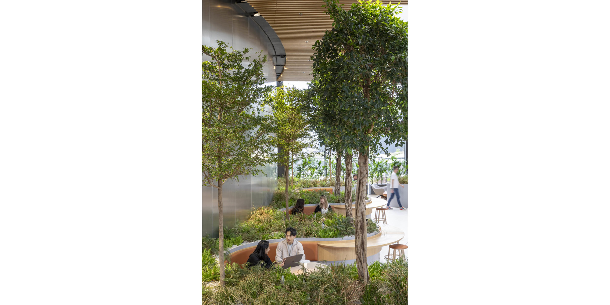 Floor-to-ceiling windows and cantilevered balconies create a permeable and healthy working environment, while the use of greenery and natural materials throughout the space enhances wellbeing. The building is naturally ventilated and has its own roof terrace, for exercise classes and office events.
