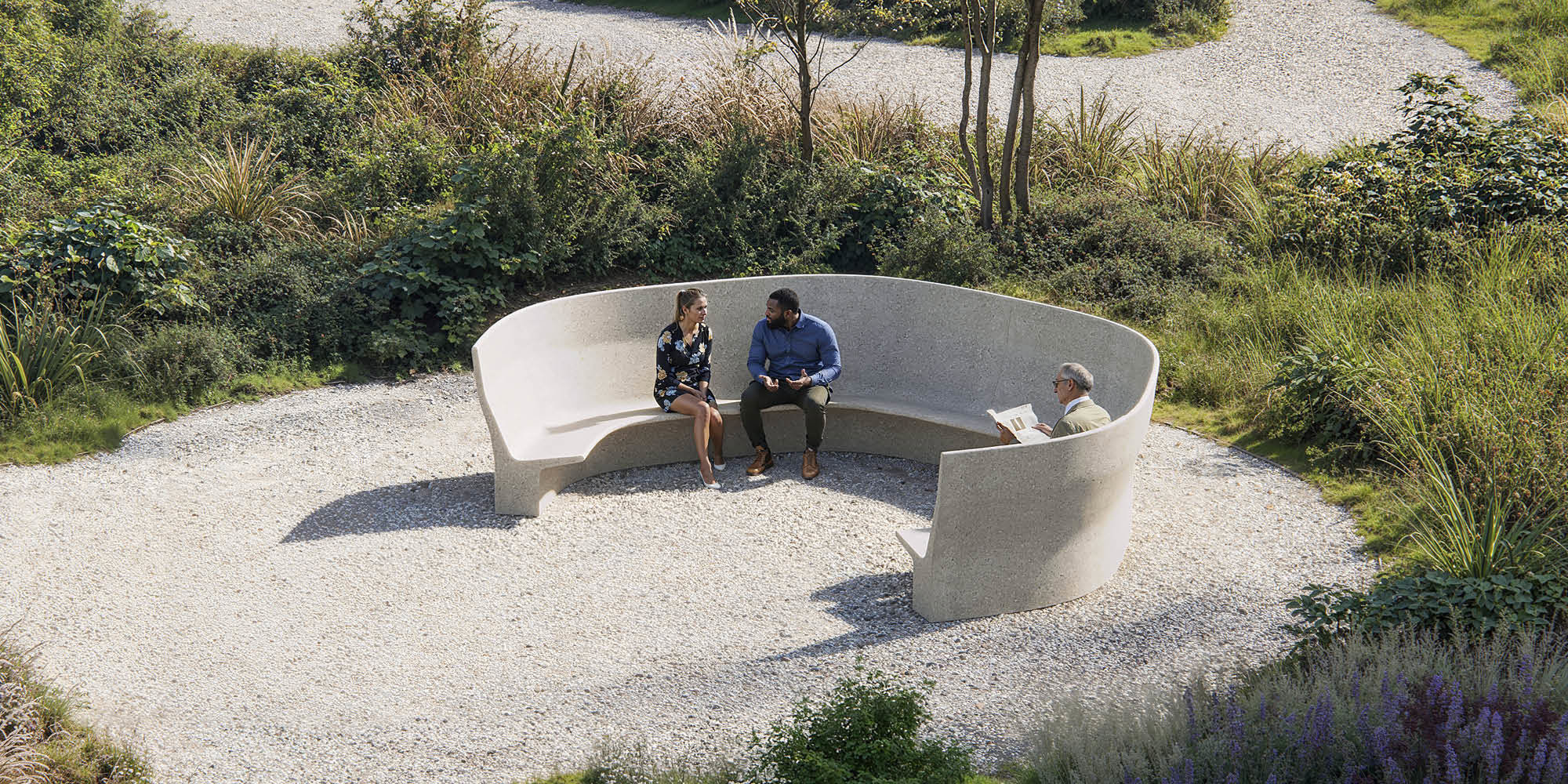 Rooted in the idea of creating more private and relaxed outdoor areas, Gather is a modular seating system that can take many forms. A range of linear, concave, convex, and end modules are combined to create different configurations, including enclosed pocket spaces, straight benches, or seating around green islands. A branch-like spine forms the backrest, gradually tapering to a thickness of just 40 millimetres. Gather is available in four different concrete colours – grey, black, white and beige – with a bespoke aluminium armrest.