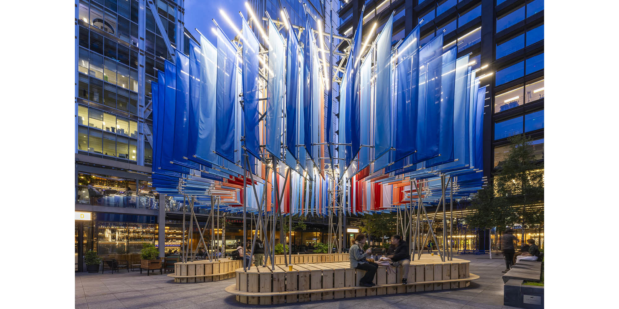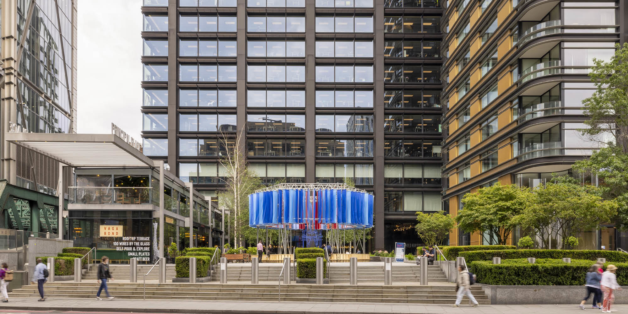 Last week, a launch party was held to celebrate the opening of a new summer pavilion at Principal Place. Created in collaboration with Brookfield Properties for the London Festival of Architecture (LFA), ‘Radial’ is built from readily available and reusable materials to ensure its sustainable legacy. The pavilion activates the plaza and offers a welcoming space for rest and contemplation.