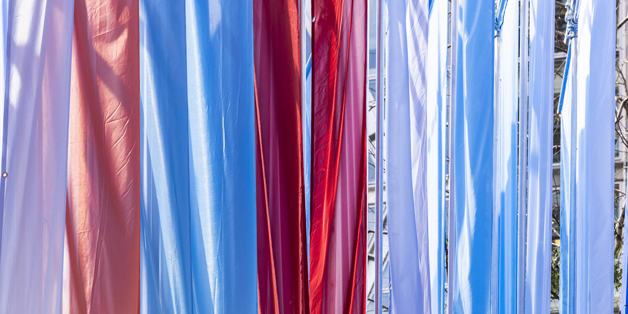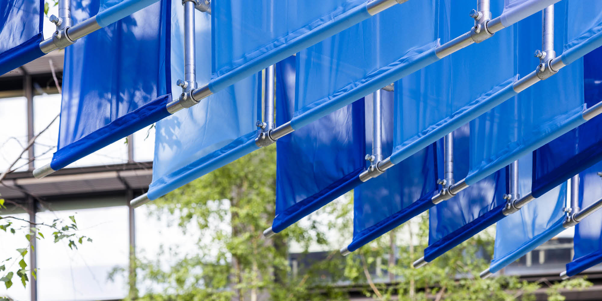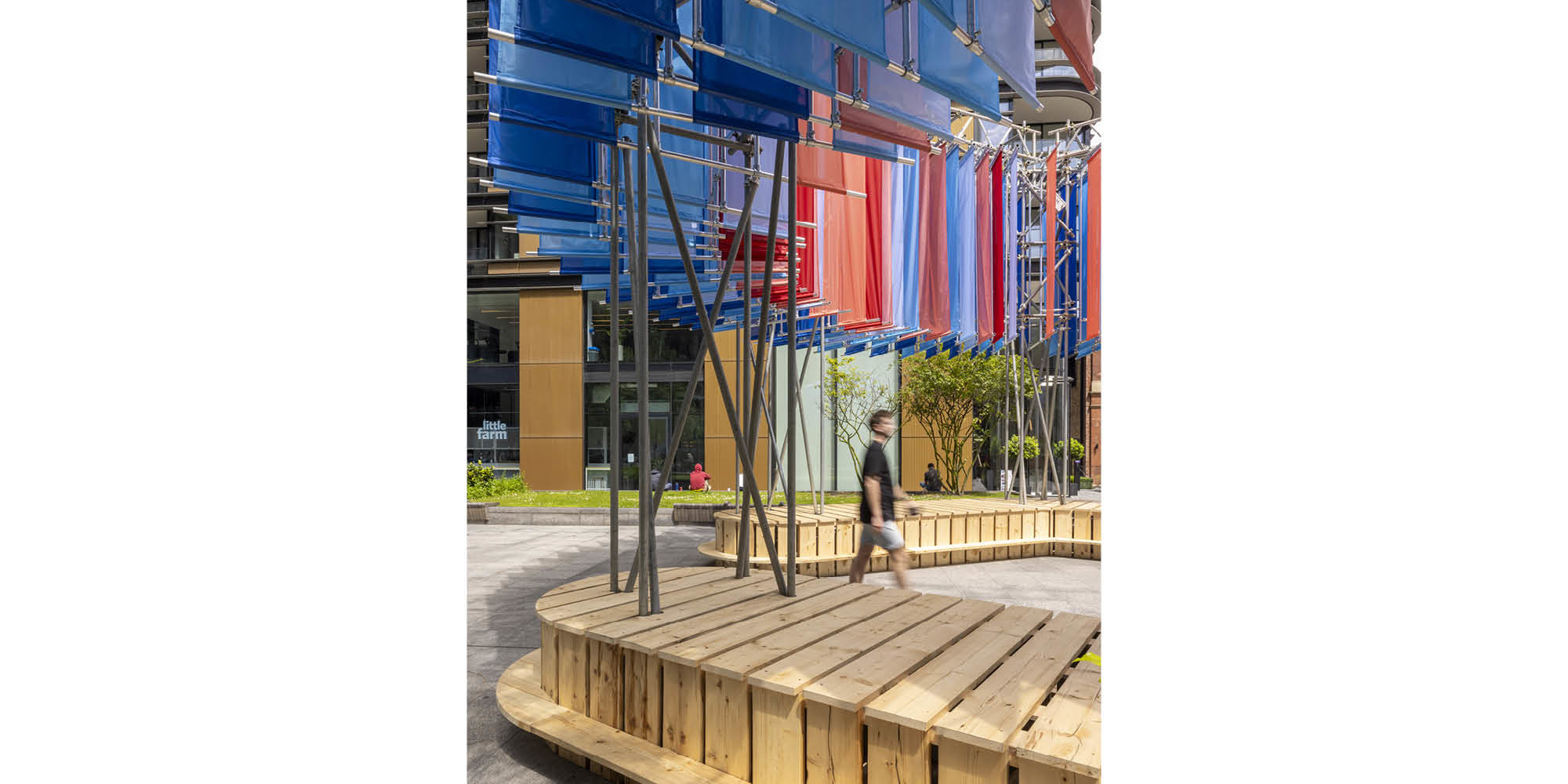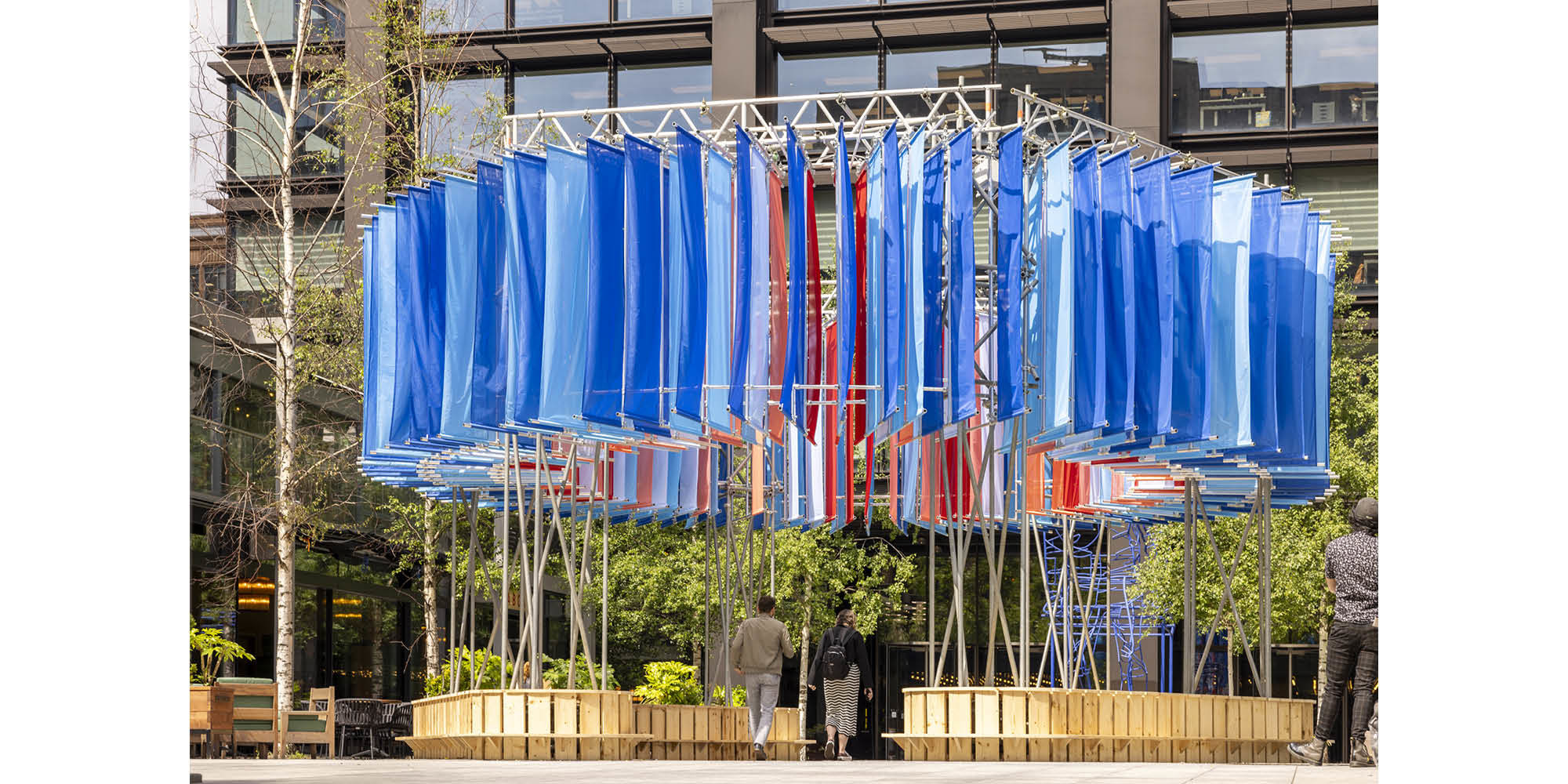 Scaffolding forms the pavilion’s primary structure and can be reused at various sites across London. Additionally, the timber used for the curved wooden benches will be donated to community workshops for local projects. The pavilion also features a radial pattern of white, blue and red flags that provide shade and are made from 100% recycled waste. These are arranged according to a colour grading system developed by the climate scientist, Ed Hawkins, which reflects the earth’s rising temperature over the past 100 years. The flags will be repurposed into tote bags for distribution within the local neighbourhood at the end of the pavilion’s life.