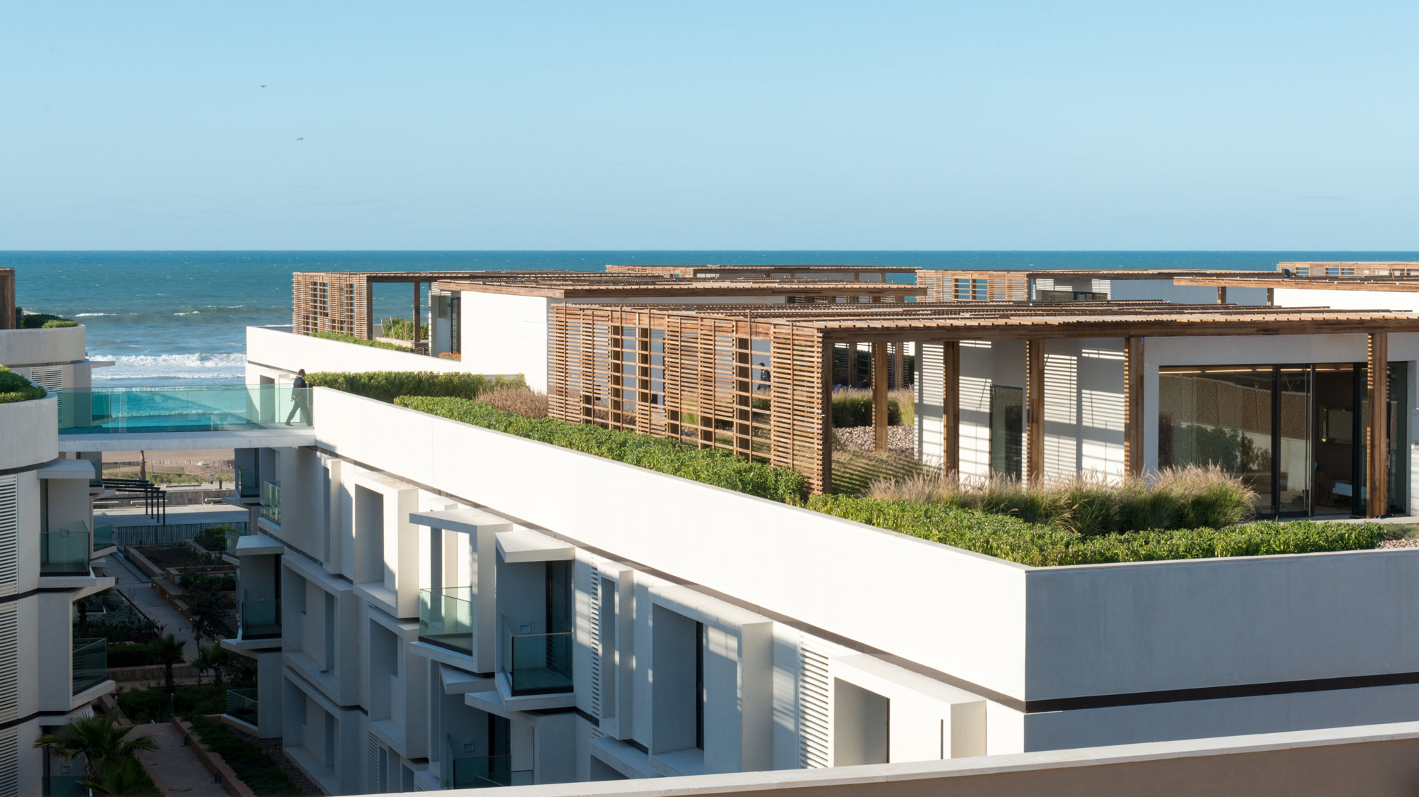 Using local materials and construction techniques, the design responds to the architectural vernacular. The buildings are interspersed with private courtyards and trees, offering natural shade, while protecting against the strong sea breezes. The facades are designed to promote natural ventilation, control solar gain and exploit the cooling properties of thermal mass and, for privacy, the hotel balconies are shaded by delicate filigree screens.