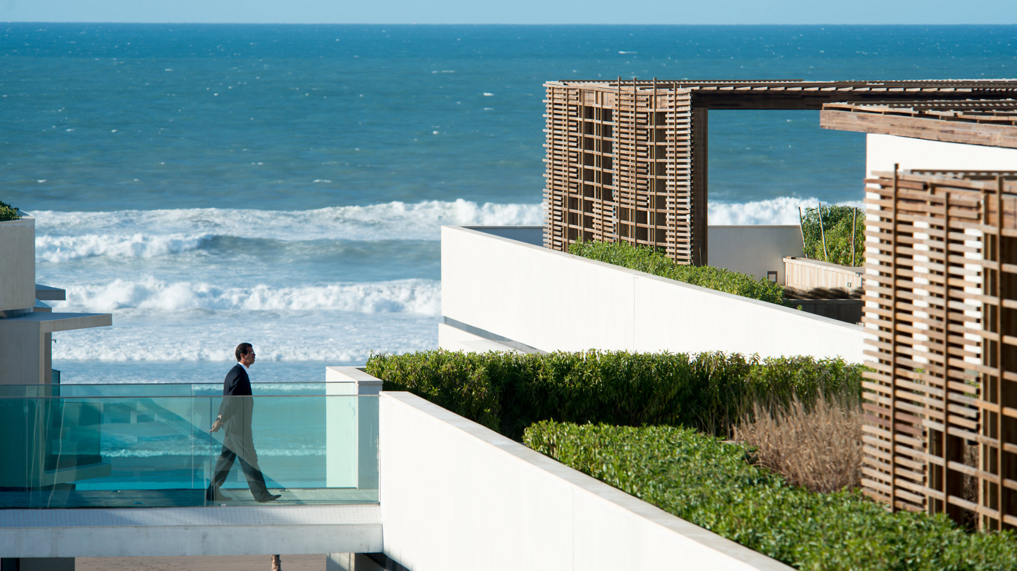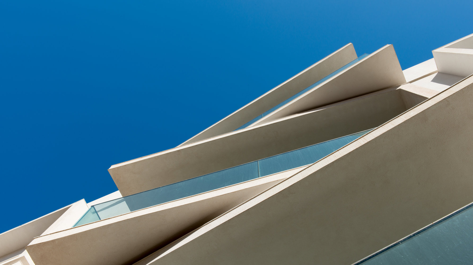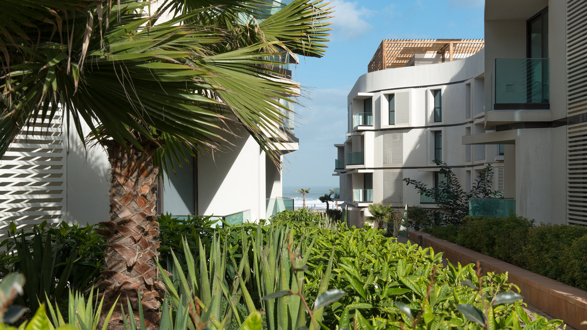 The spaces are carved into the cliff-side beneath the existing corniche, drawing the city towards the sea with a series of stepped terraces. An elevated promenade leads to a plaza with cafes, restaurants and bars and breaks down the barrier that previously existed between the road and the beach. Pedestrians access the apartments at roof-level, via gardens and bridges, and discreet ramps lead cars to underground parking. The buildings then extend along the corniche: there is a hotel, swimming pool, courtyard and spa facilities at the north eastern tip, and offices and a ‘business club’ – comprising shared conference facilities and office space, a pool and serviced apartments – towards the south west of the site. The centre of the development is arranged as seven ‘fingers’ containing 260 private apartments. These extend towards the ocean and are staggered to allow even those furthest from the beach to have sea views.