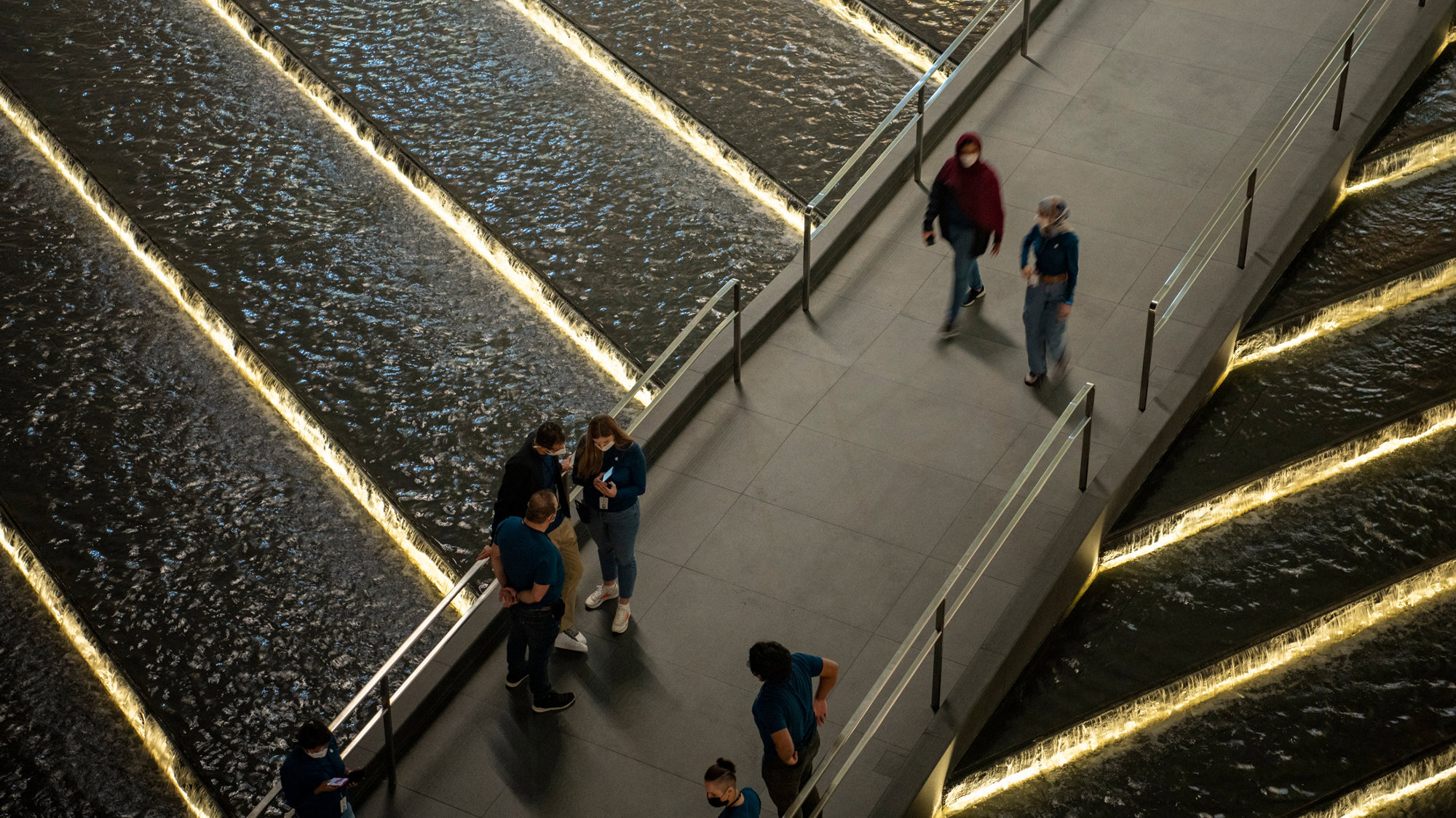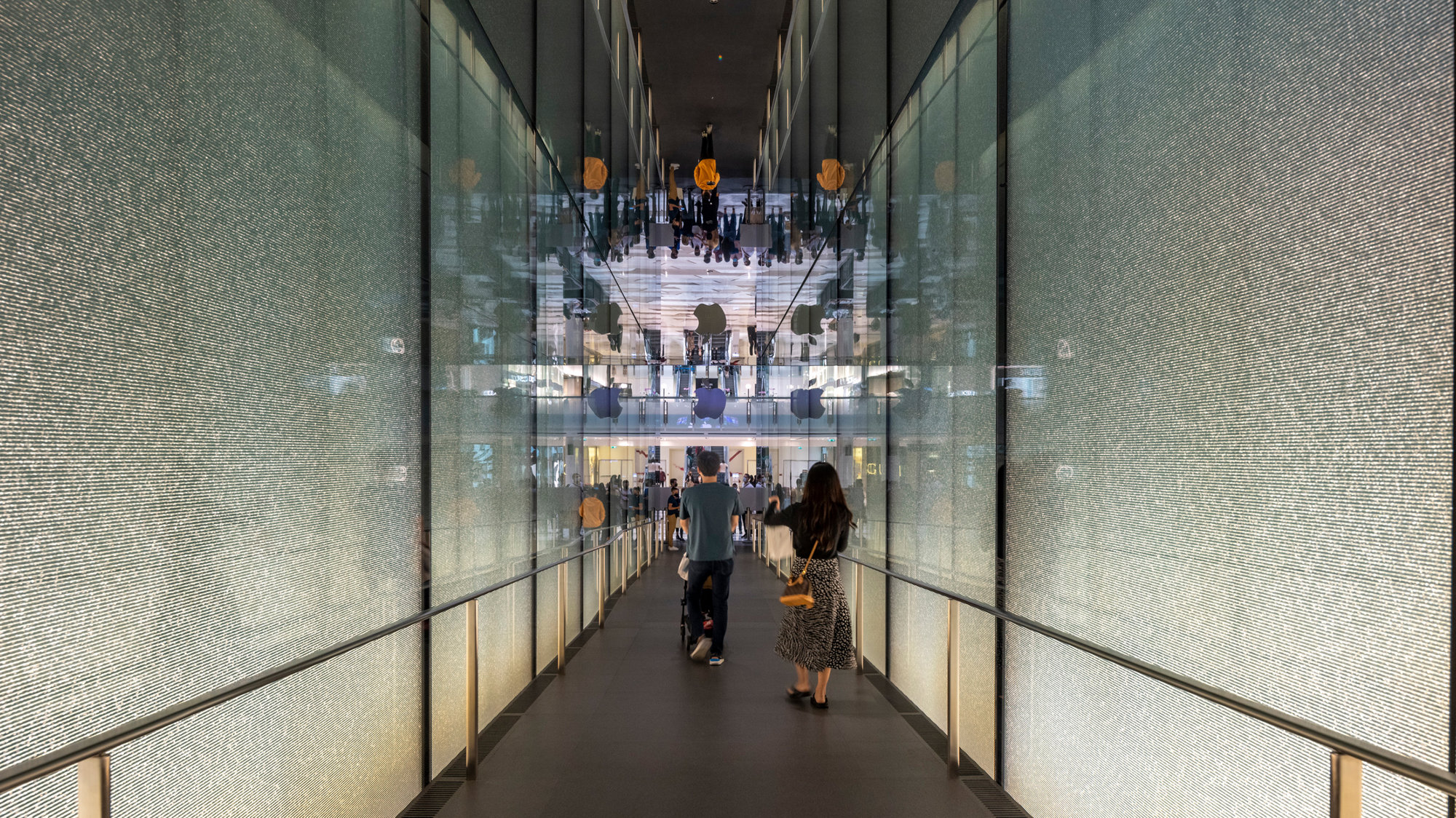 Visitors from the mall enter through a mirrored stainless-steel portal, enveloped by the sights and sounds of the water jets that cascade down over the exterior glass walls. The water droplets catch the light and shimmer as they run over the milled glass surface. A 72-foot-long (22-metre) jointless stretched mirror foil ceiling adds drama to the space – a single uninterrupted plane that creates a kaleidoscopic effect, with the water falling down the walls, and reflections travelling infinitely up towards the sky.