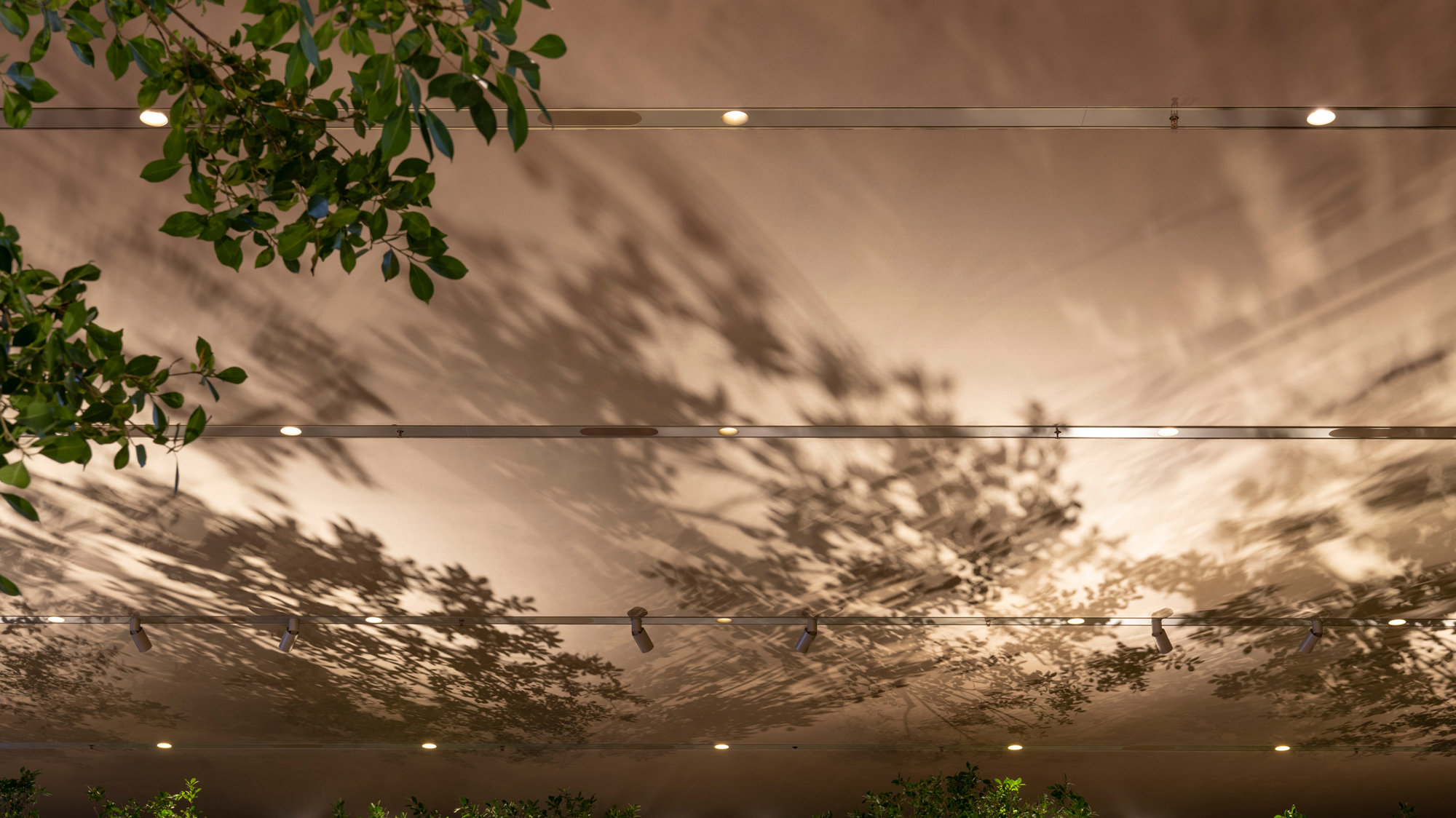 The generous 19-foot (5.75-metre) floor-to-ceiling height lends a sense of spaciousness, with the stretched gold fabric ceiling enhancing the acoustics of the space. Lighting is subtly incorporated into the avenues to illuminate the metallic ceiling at night, filtering through the leaves of the Ficus trees and casting theatrical, dappled shadows on the surface above. Both avenues act as freestanding pieces of furniture, while simultaneously functioning as the vertical walls of the two staircases behind them. Their timber panelling travels down the staircases to the Boardroom below, creating a unified language across both levels.