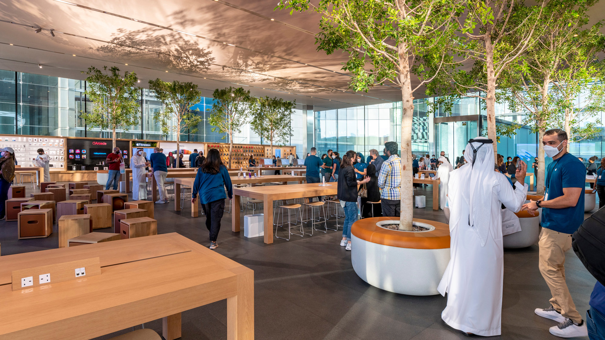The light-filled glazed interior boasts panoramic views of the coastline and the city of Abu Dhabi beyond. Internally, the store is laid out on a single level. The Forum is located towards the east, with Apple Avenues flanking the northern and southern ends of the store. Display tables are nestled amongst the Ficus trees, adding greenery to the interior.