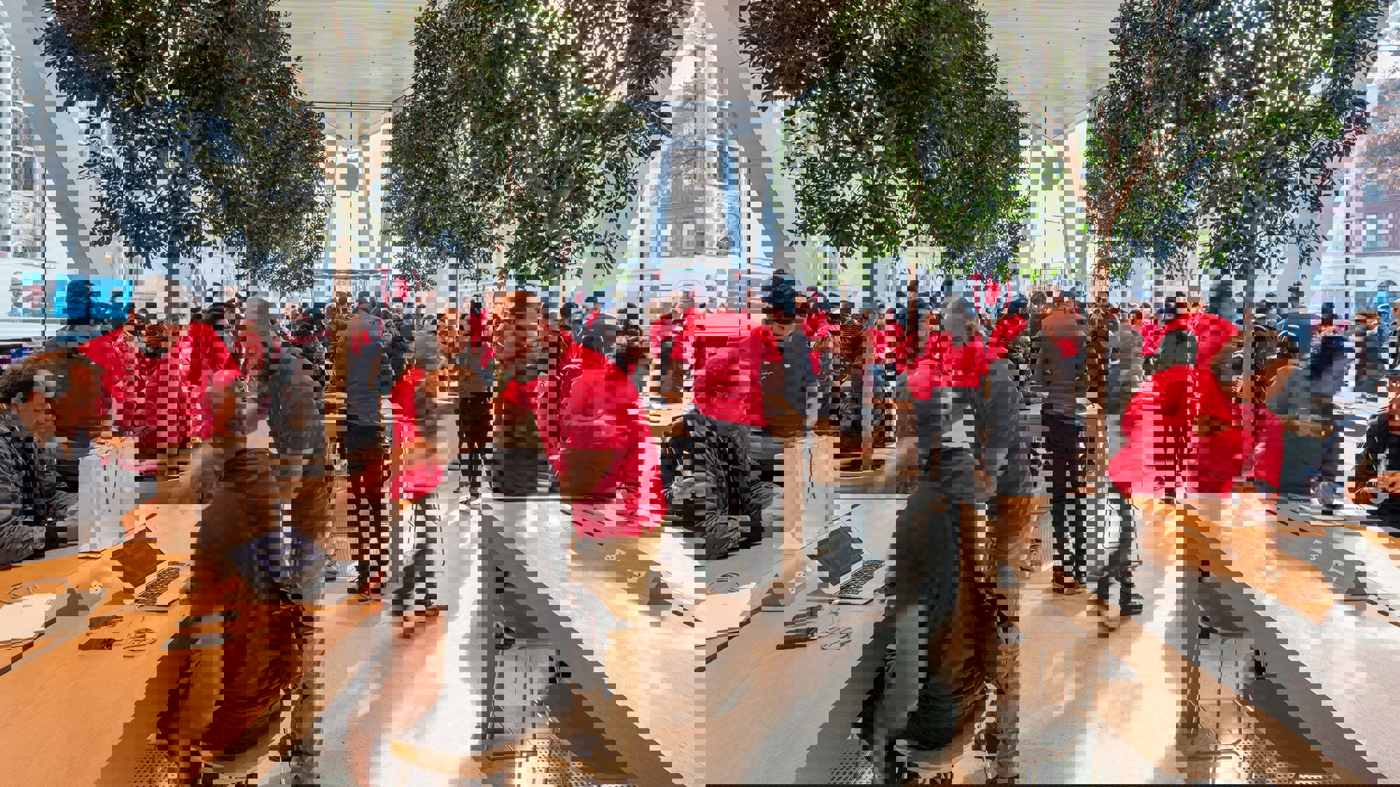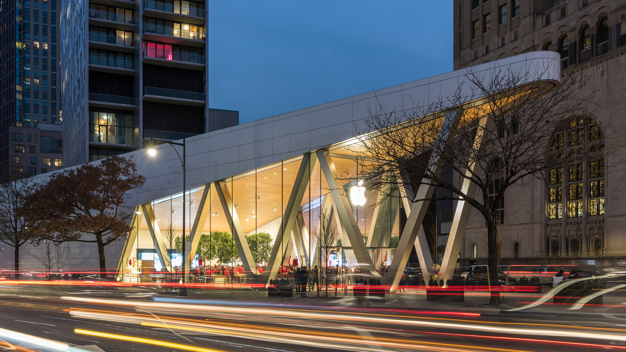 The transparency of the facade floods the interior with natural light. A grove of trees in the store’s center filters the sun through greenery, creating an animated place for people to explore Apple, get inspired and find support from staff.