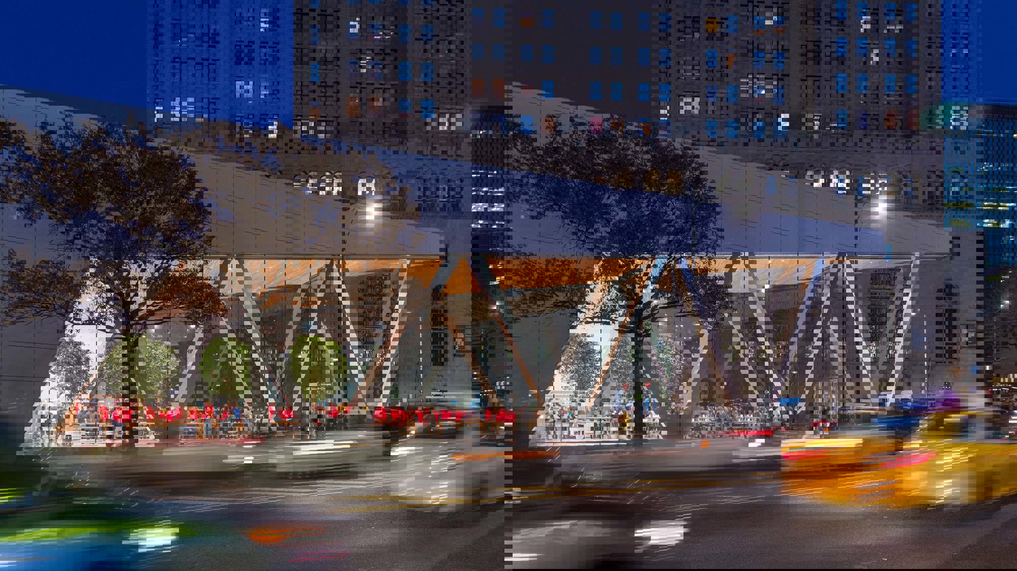 A dramatic sloping timber canopy – rising to over 30 feet above street level – marks the store’s entrance, shading an open public plaza at the apex of Flatbush Avenue and Ashland Place. The canopy’s timber ceiling continues inside the store, interrupted only by an imperceptibly thin glass facade.