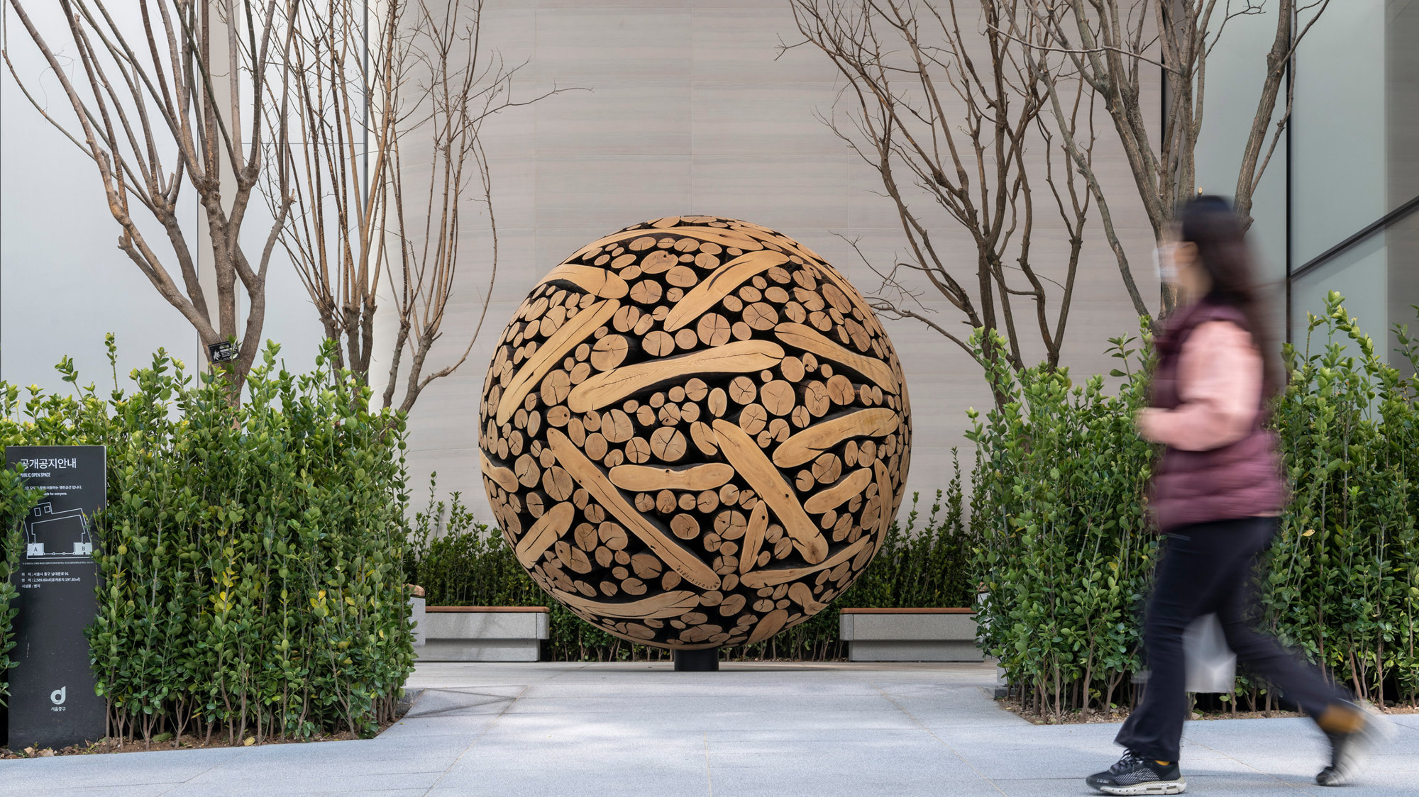 The landscape also flows into the store through with a shaded grove of trees within the grand atrium. In addition, the pocket parks create small tranquil havens that offer an escape from the busy street. Sculpture by South Korean artists Jaehyo Lee and Vakki add focal points to create a tranquil setting.