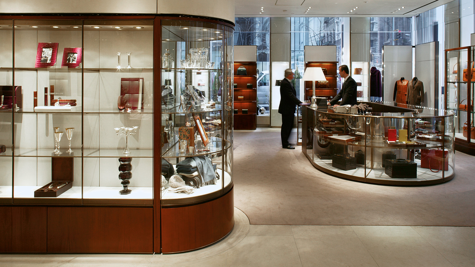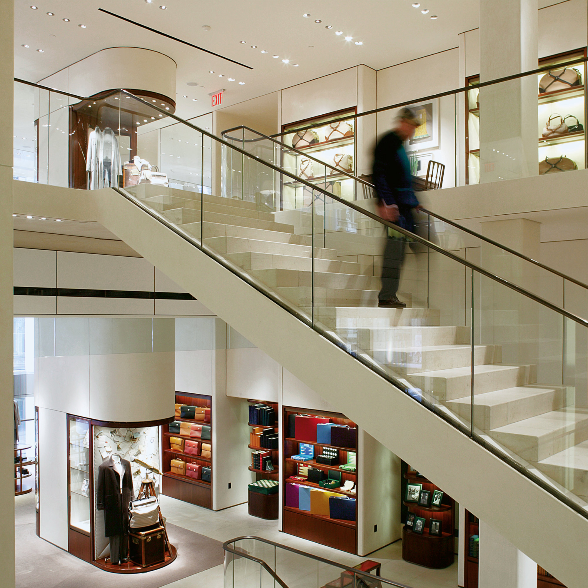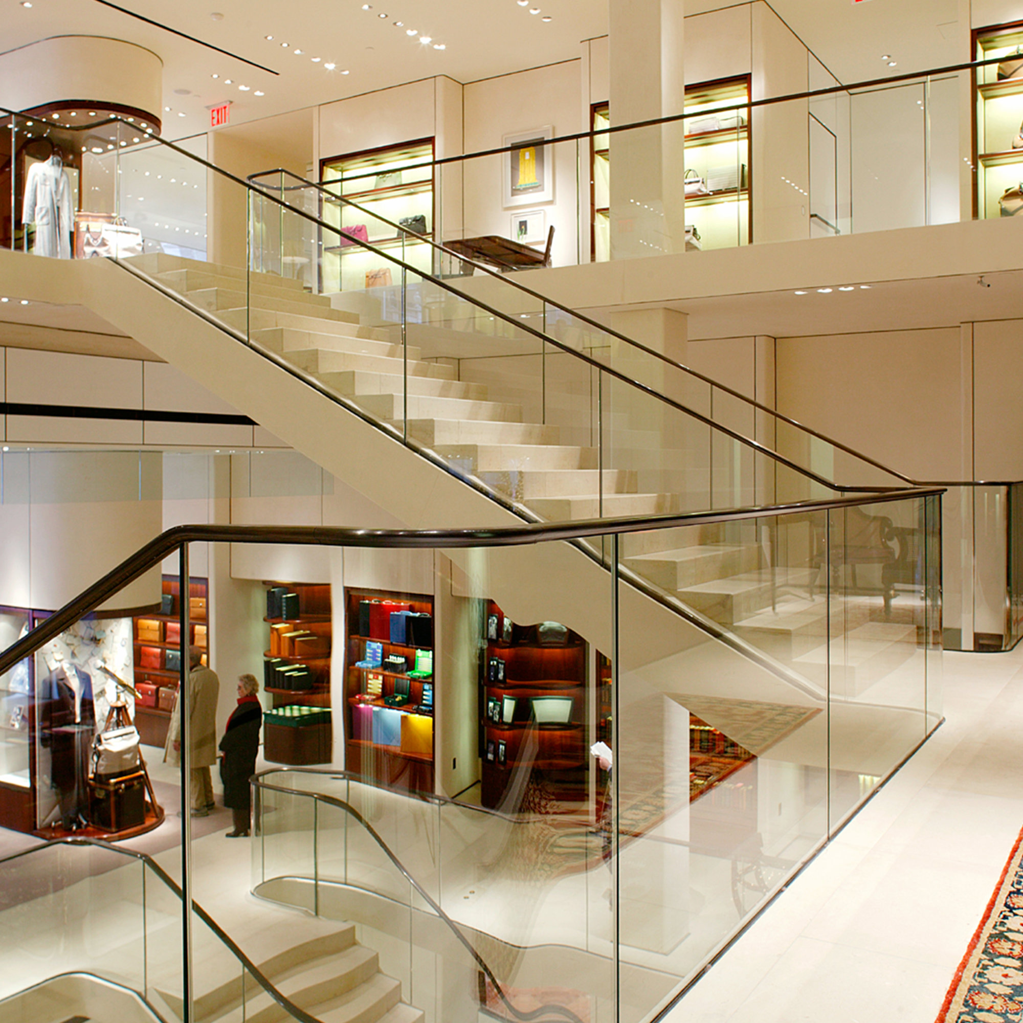 At 20,000 sq ft, the interior provides an unusuallly generous retail area in which to display products ranging from jewellery, silver, watches, pens, leather goods and china, to luxury ready-to-wear and fashion accessories. Some of the display cases are inserted into the building’s columns. Others, designed for Foster + Partners by the Italian firm Molteni, are made of traditional materials – mahogany, bronze and glass – and refer to the original Asprey display cases. However, they look seamlessly contemporary, and are subtly lit with fibre-optics. The mezzanines between the floors are used to showcase Asprey’s collection of rare books, and the store’s antique furniture and carpets have been selected for Asprey by interior designer David Mlinaric.