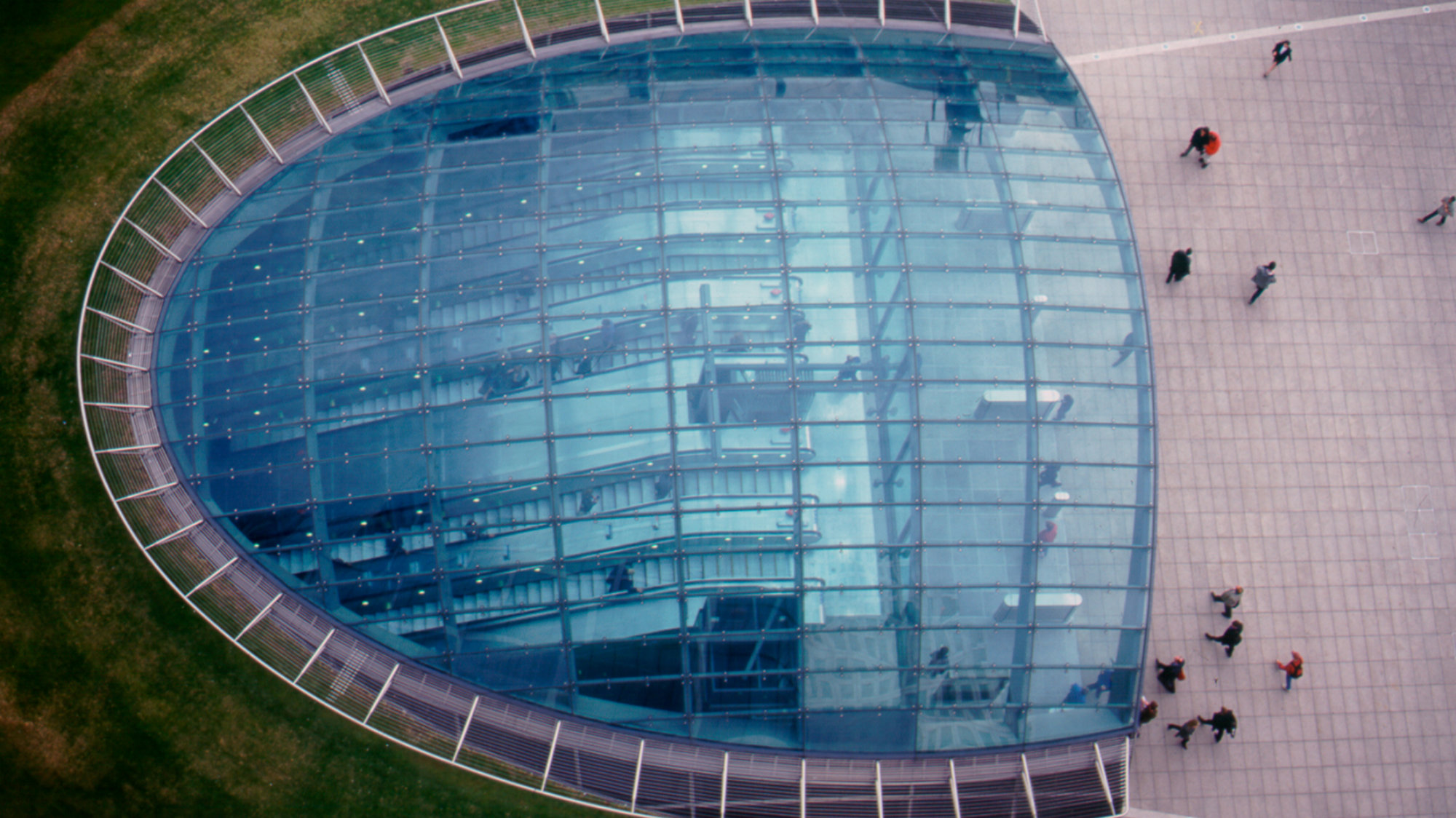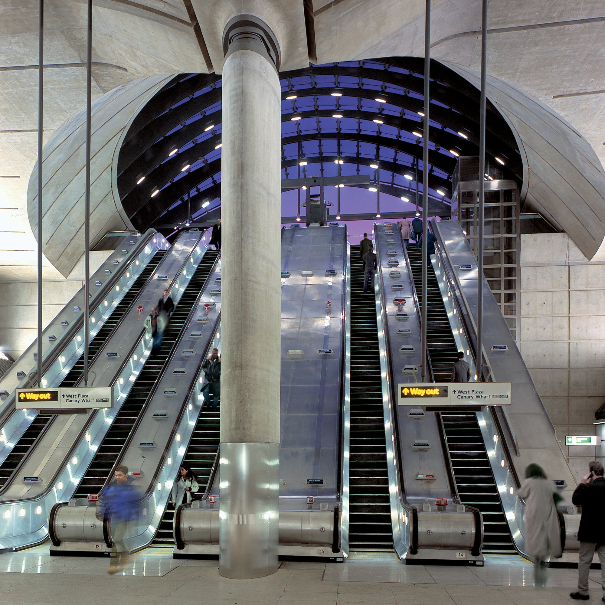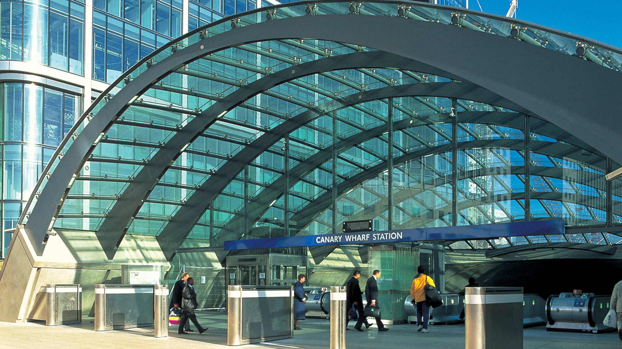 The 300-metre-long station is built within the hollow of the former West India Dock using cut-and-cover construction techniques. At ground level, the station roof is laid out as a landscaped park, creating Canary Wharf's principal recreation space. The only visible station elements are the arcing glass canopies that cover its three entrances and draw daylight deep into the concourse. By concentrating natural light dramatically at these points, orientation is enhanced, minimising the need for directional signage. Twenty banks of escalators move passengers in and out of the station, while administrative offices, kiosks and other amenities are sited along the flanks of the ticket hall, leaving the main concourse free and creating a sense of clarity and calm.