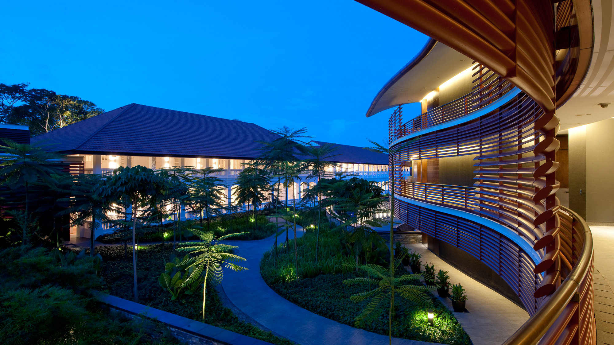 Sentosa lies close to the southern coast of Singapore Island and has a rainforest climate, with high levels of humidity and rainfall. Reinterpreting elements of the colonial vernacular, the scheme’s design offers a similarly climatic response: deep, sheltered walkways resonate with the nineteenth-century colonnades; the roof canopy extends to provide protection from the rain; and the facade is enclosed by a unifying skin of horizontal brises soleils, which take the form of large earth-toned screens. The original white stone structures have been restored and form the gateway to the resort.