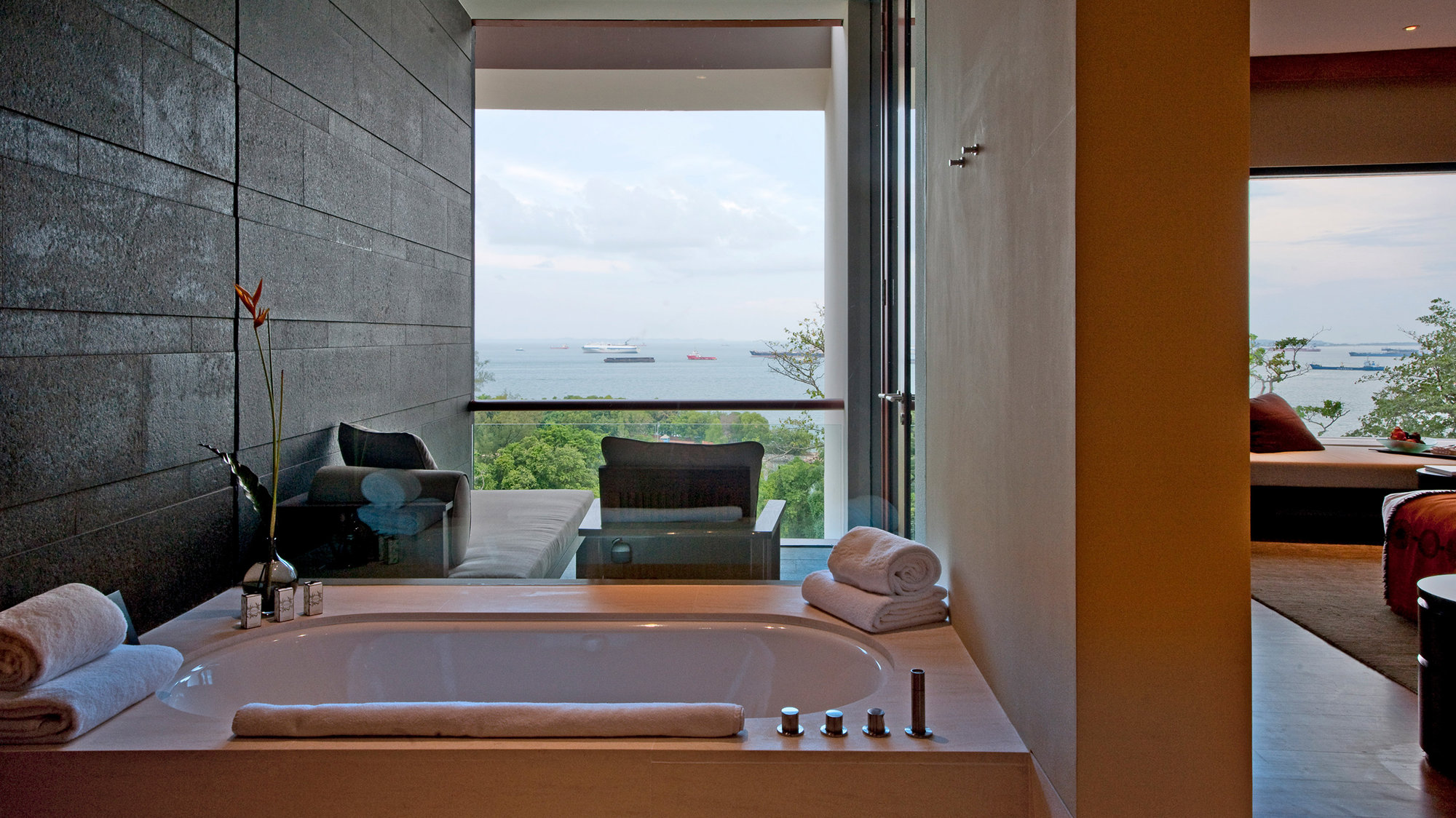 The hotel extends from each side of the existing buildings in an unbroken plan that curves around a garden courtyard. The top of the new building is level with the tall pitched roof of the Tanah Merah, yet its canopy has a shallow curve to encompass an additional storey and drain rainwater. Concentric rows of villas and pools follow the contours in three waves, stepping down the sloping site. They are screened within the resort’s dense gardens, which are planted with more than 5,000 trees. While the exterior treatment of the villas is restrained, they feature dramatic double-height spaces with glazed walls that frame sea views.