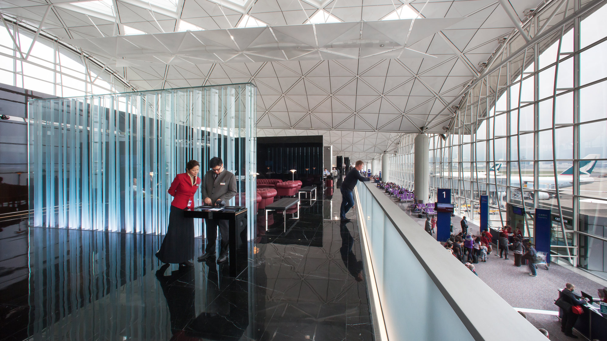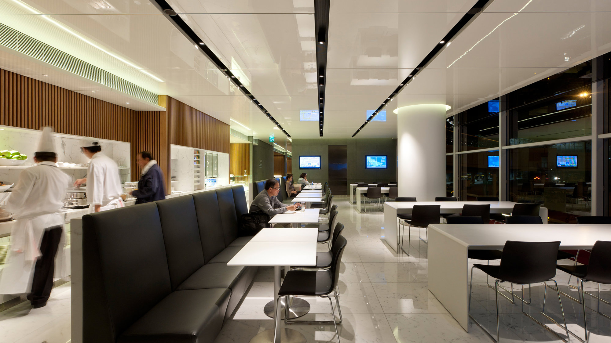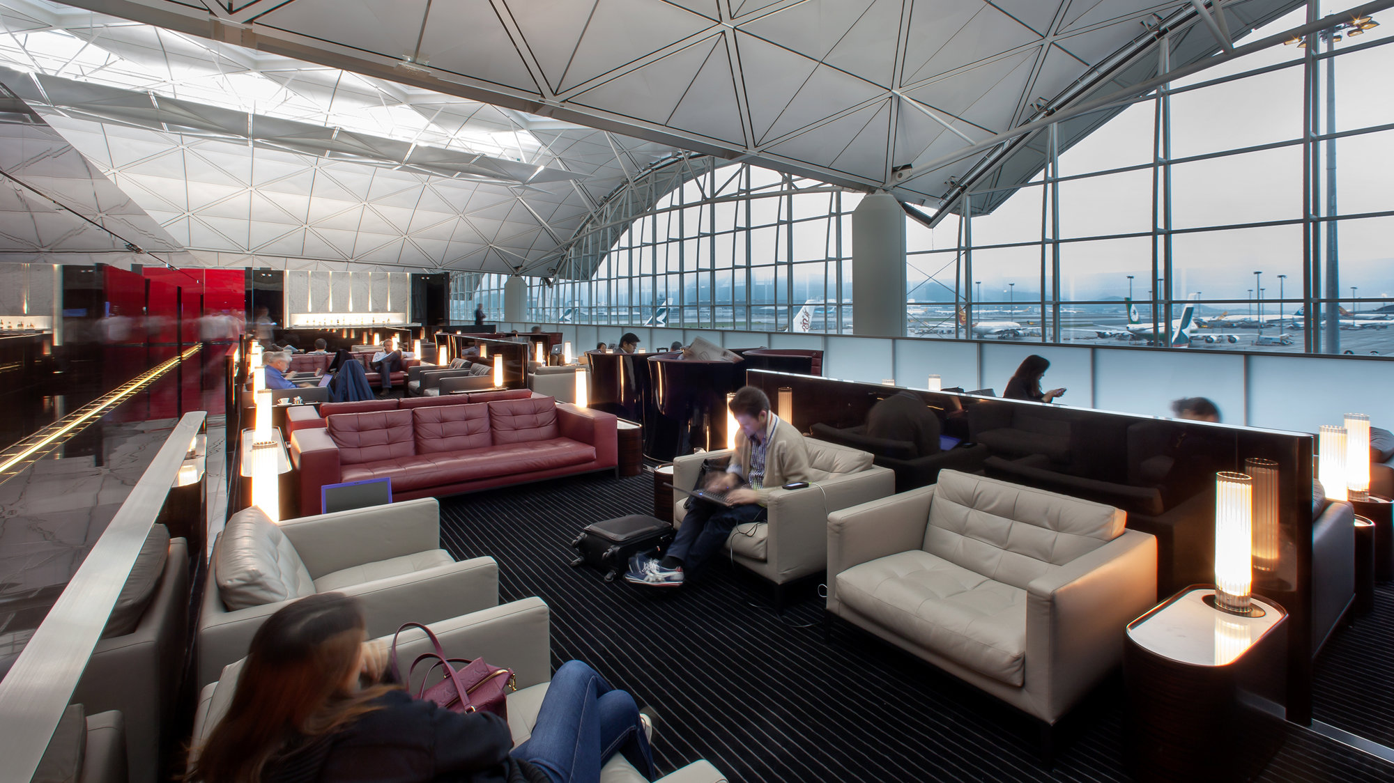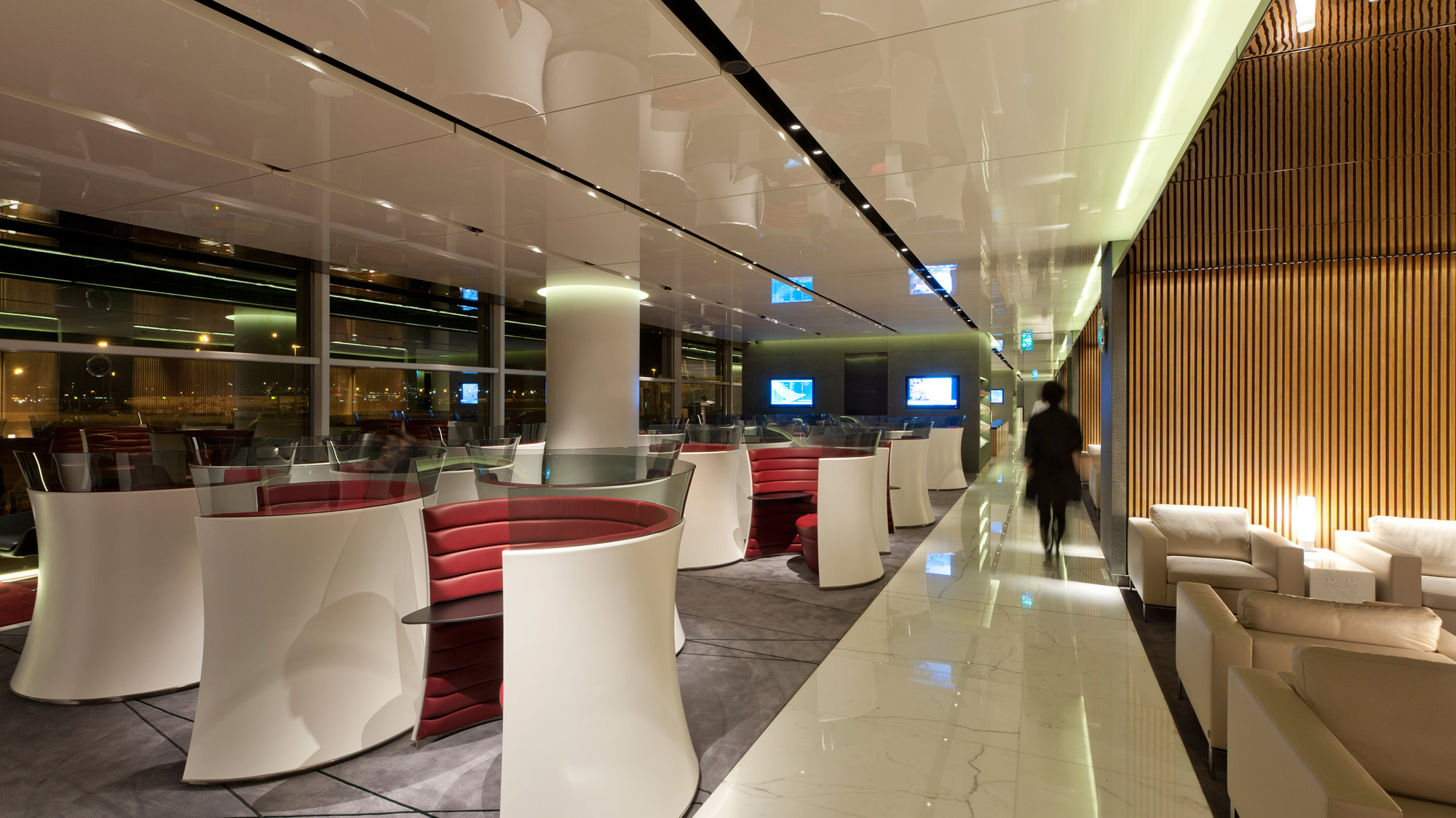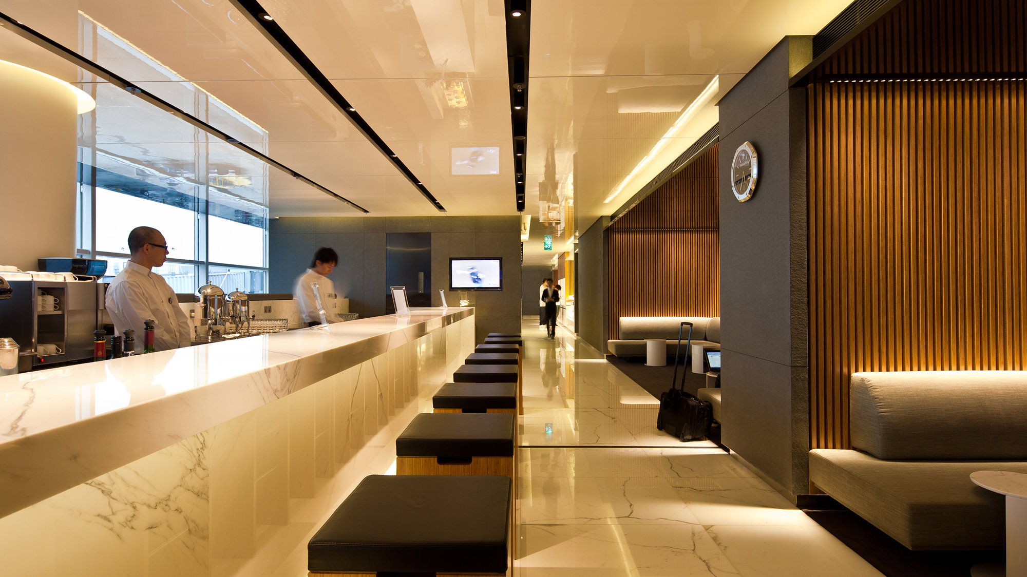 ‘The Cabin’, the first lounge to be completed, is located close to the airline’s departure gates. The linear arrangement of its spaces echoes the principles of transparency, natural light and clarity of movement, which guided the design of the terminal itself. Within easy reach of the reception is a drop-in IT zone, followed by a delicatessen, a health bar and more private relaxation areas, all with airside views. A reflective ceiling projects daylight deep into the space, while a rich palette of materials, combining leather upholstery and white marble, is designed to reintroduce a little glamour to international air travel. The second lounge in the series, ‘The Wing’ provides business-class spaces, including the airline’s signature ‘long bar’ – a 23-metre white marble cocktail bar overlooking the runway. First class guests also enjoy a variety of spaces, from a champagne bar to the privacy of quiet reading areas or five ‘cabana’ suites; these exclusive areas are differentiated by a palette of black polished marble, gloss-lacquered eucalyptus and black glass.