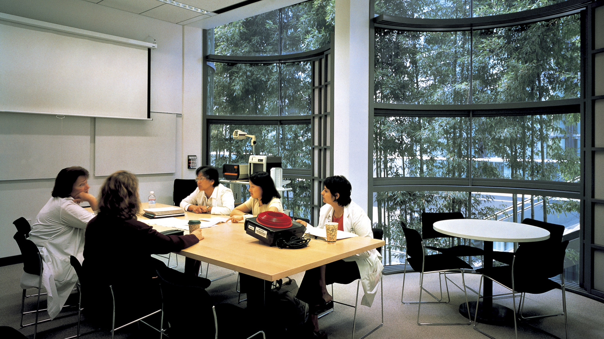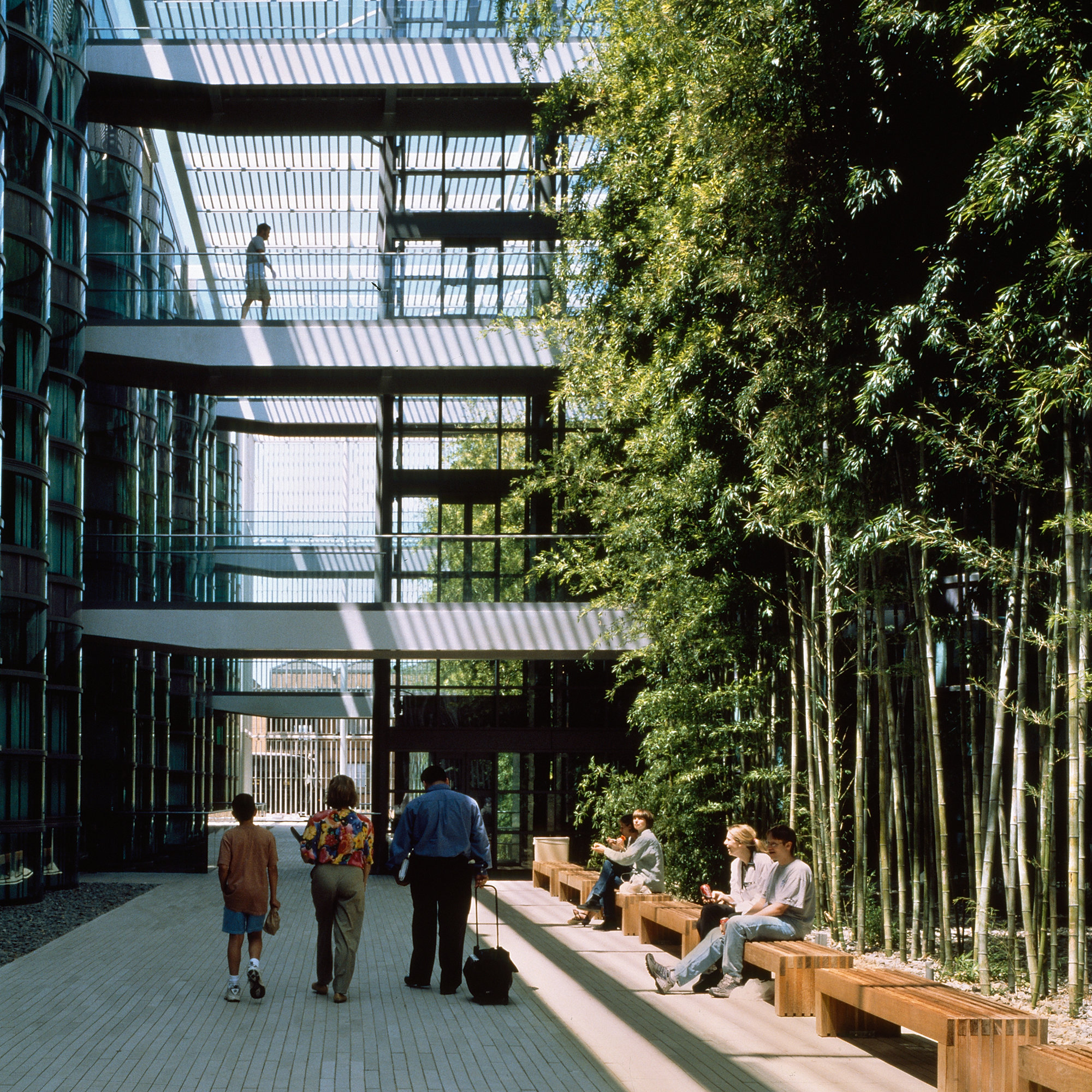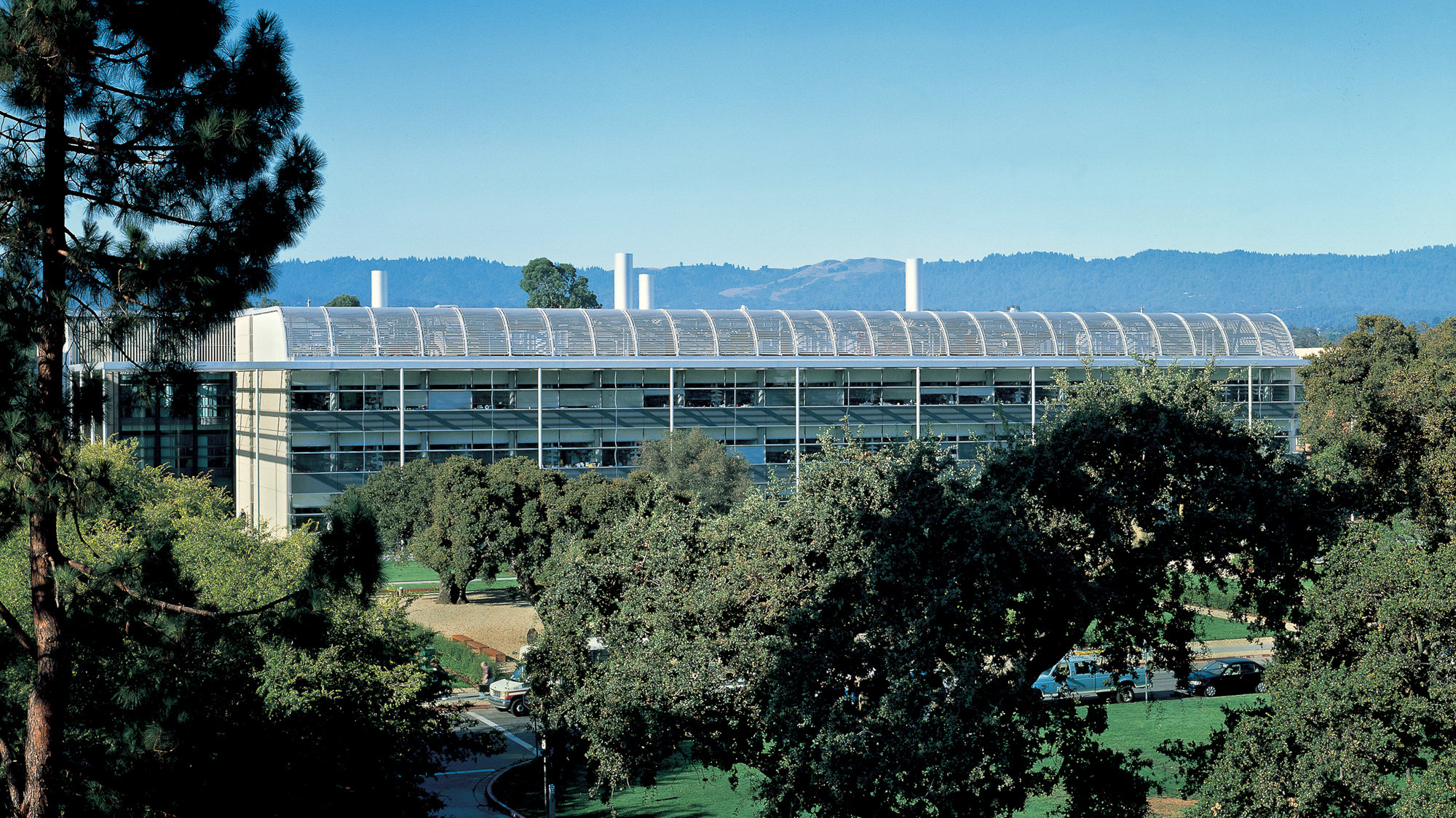 The brief called for close proximity between laboratories, core support areas and offices. Two symmetrical wings frame a shaded courtyard, which provides a comfortable environment for social interaction and has become both the social heart of the building and a popular route through the campus. Offices overlook the courtyard and a stand of bamboo provides occupants with a degree of privacy. Environmental systems take advantage of Palo Alto's benign climate. Offices are naturally ventilated for most of the year, with mechanical assistance only on extremely hot days; and the laboratory and office spaces are predominantly naturally lit. Seismic performance was a key concern: the campus lies close to the San Andreas Fault and the laboratories contain highly sensitive equipment. In response, the building employs a concrete shear-wall structural system and bridges spanning the courtyard rely on friction pendulum bearings to allow for seismic movement between the wings.