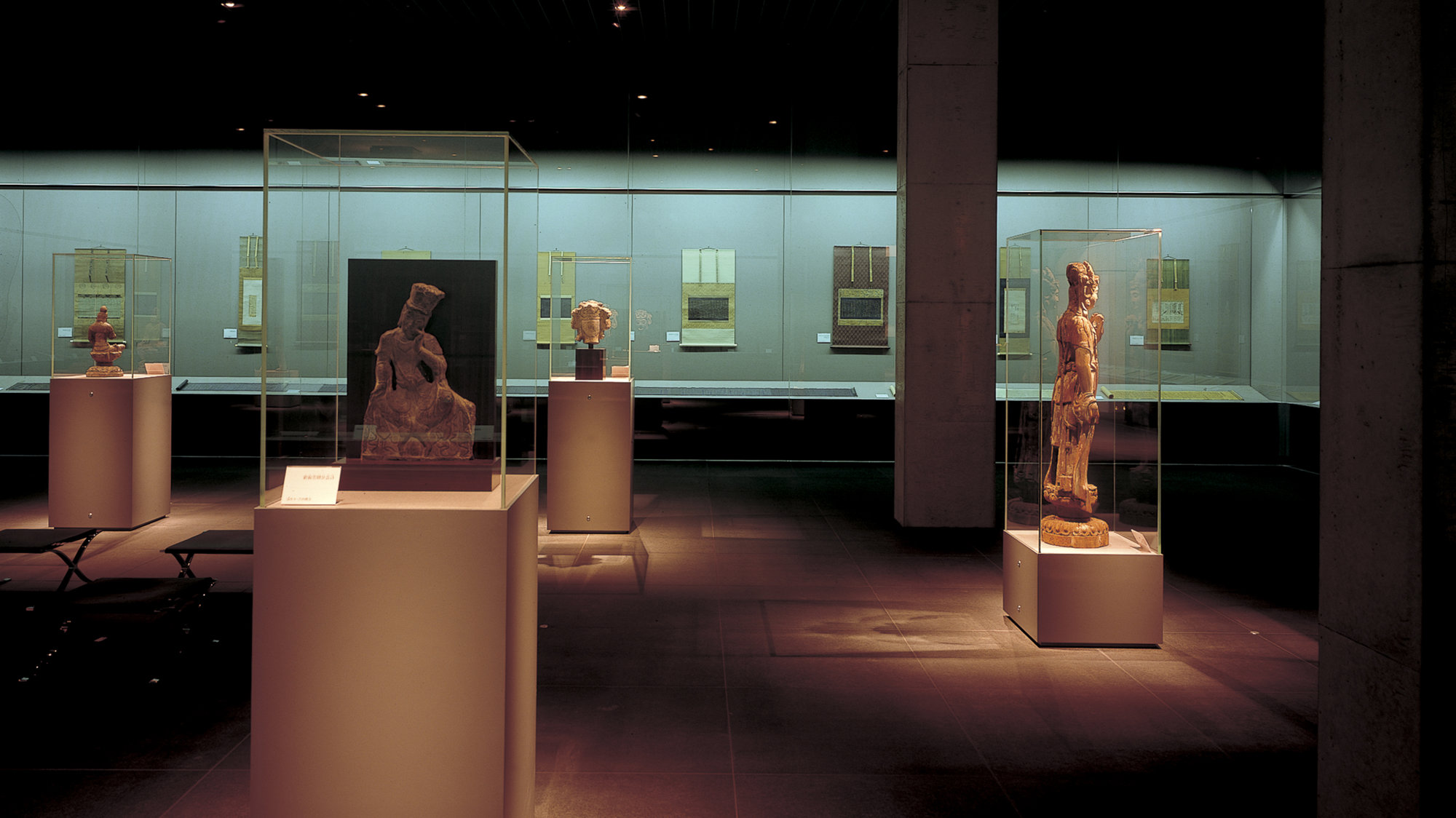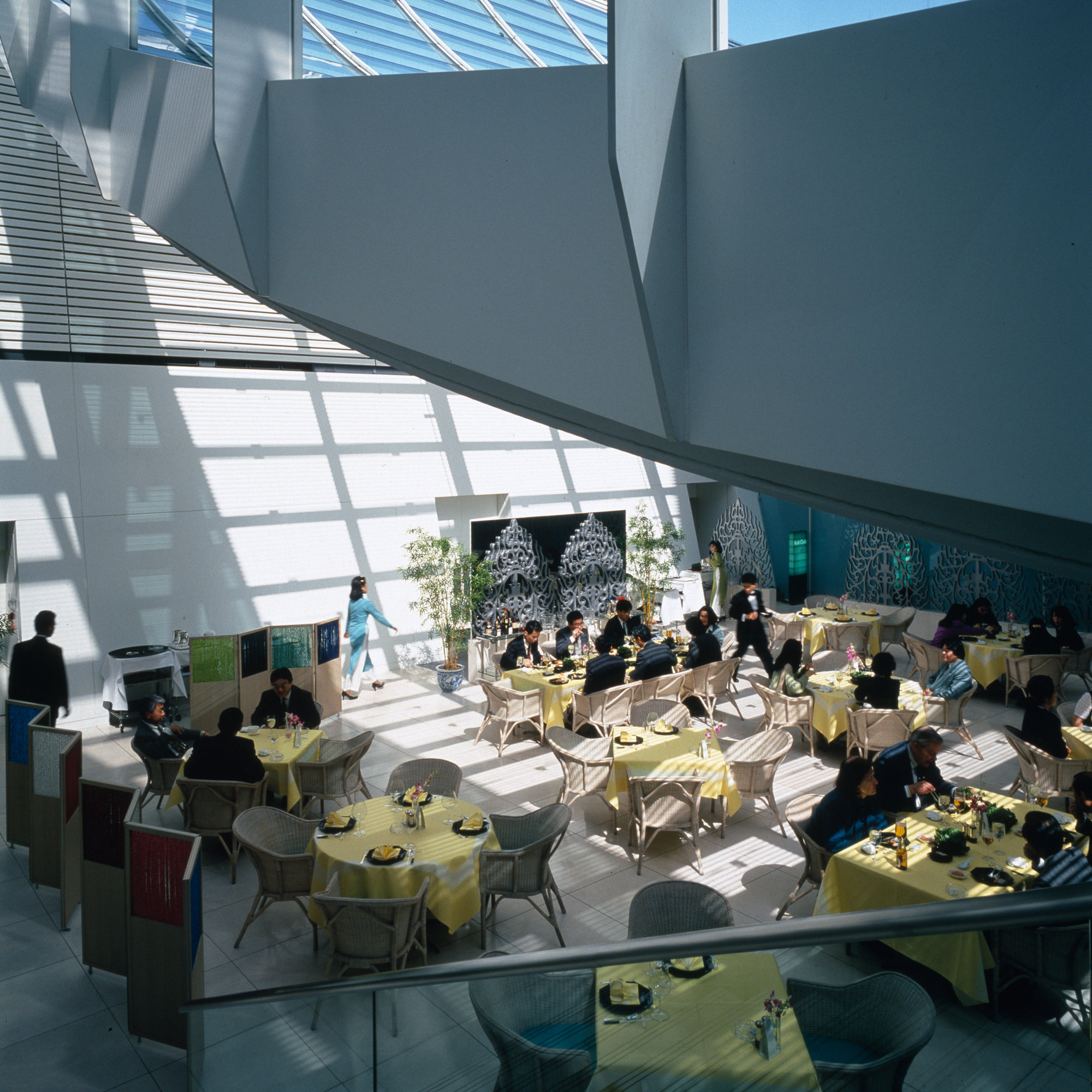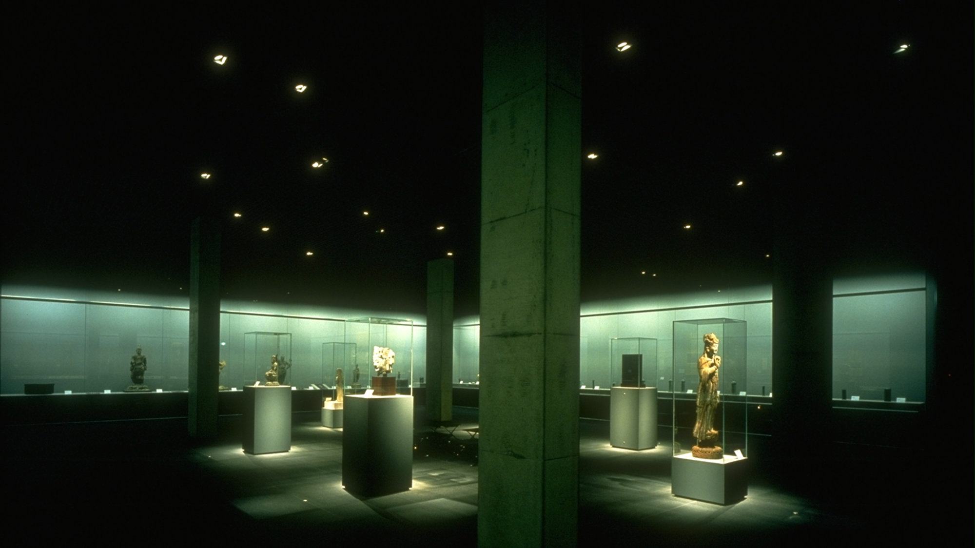 Beyond its technological innovations, Century Tower also sought to harmonise Eastern and Western aesthetic sensibilities, particularly through the use of water. At the foot of the atrium, polished black granite water tables overflow to feed water walls, which in turn frame a staircase that leads to a museum for the clients collection of Oriental antiquities. The juxtaposition of light and dark and the calming effect of the water prepare the visitor for the cave-like museum with its precisely lit objects. Other facilities include a tea house, a restaurant and a health club and pool sheltered beneath a glazed catenary roof.
