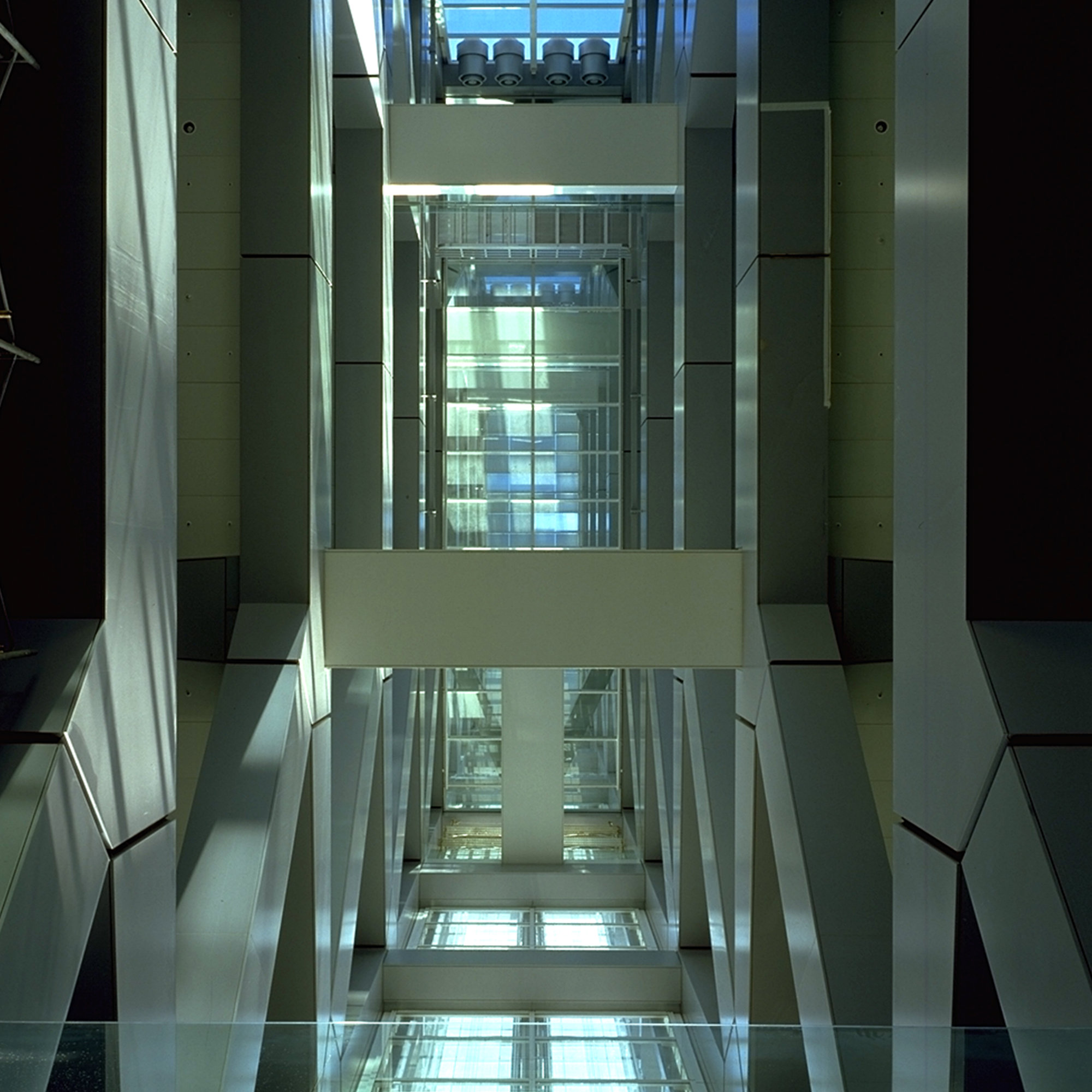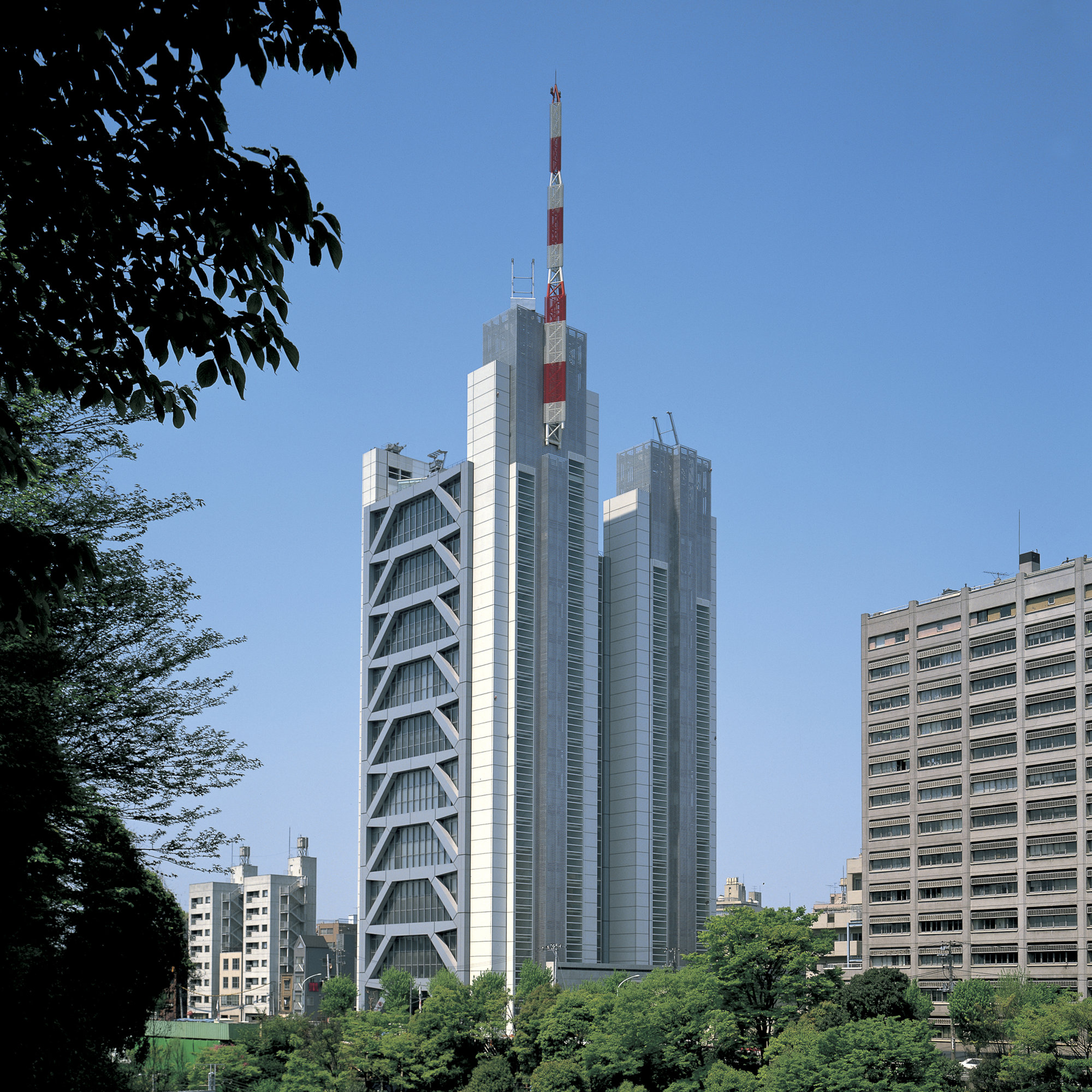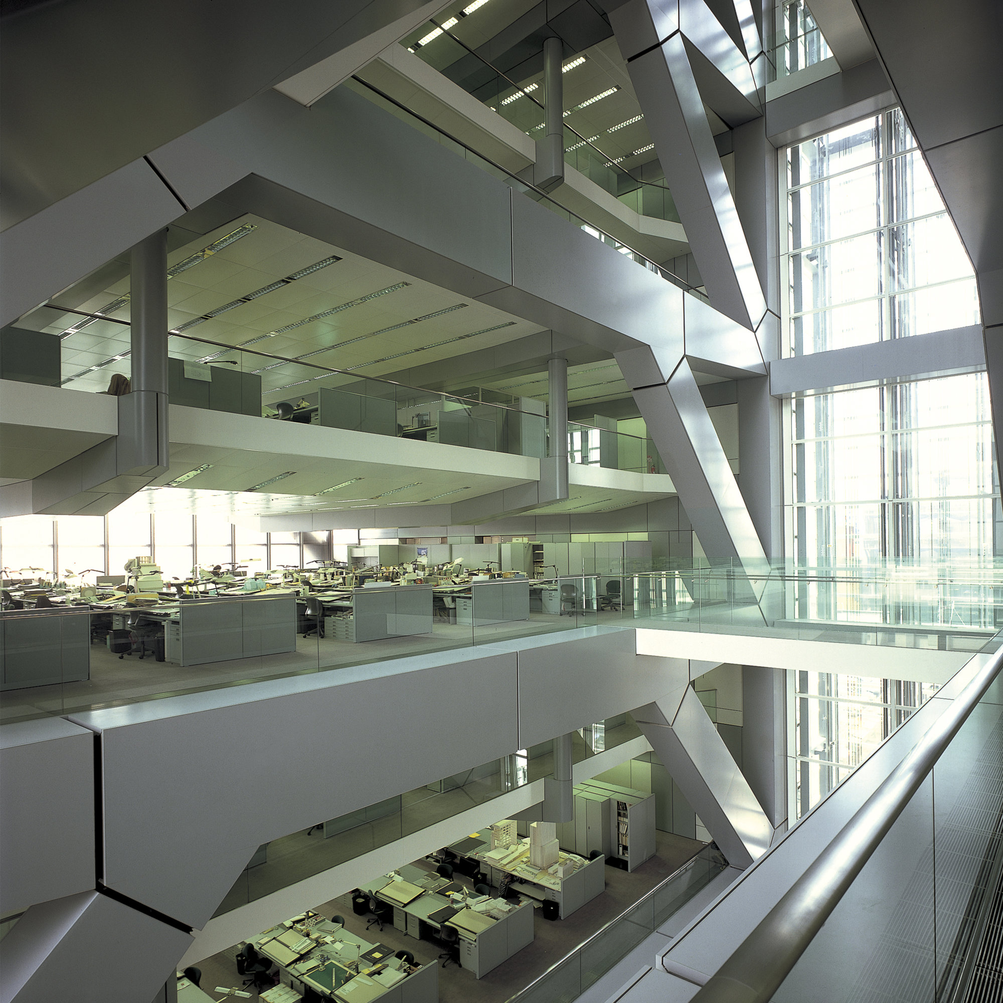 Located in Bunkyo-ku, in the heart of Tokyo, the building occupies a site subject to complex zoning regulations. The design response was to divide the tower into two blocks, nineteen and twenty-one storeys high, linked by a narrow atrium. The outer form of the blocks is defined by eccentrically braced frames, responding to seismic engineering requirements in a city where earthquakes and typhoons are very real threats. Inside, the floors are spaced at double height with suspended mezzanines between them, allowing office spaces to be column-free and to enjoy natural light and views. Narrow bridges span the atrium, enabling tenants to lease entire floors. Previously it had been prohibited in Japan to combine open office atria with open-access floor space, due to fire regulations. These were overcome through the pioneering use of smoke-activated baffles - reminiscent of the flaps on aircraft wings - which, in the event of fire, descend from the main and mezzanine floors to accelerate air-flow from the atrium into the affected floor. Fans then draw smoke across the floor and out of the building to avoid smoke migration.