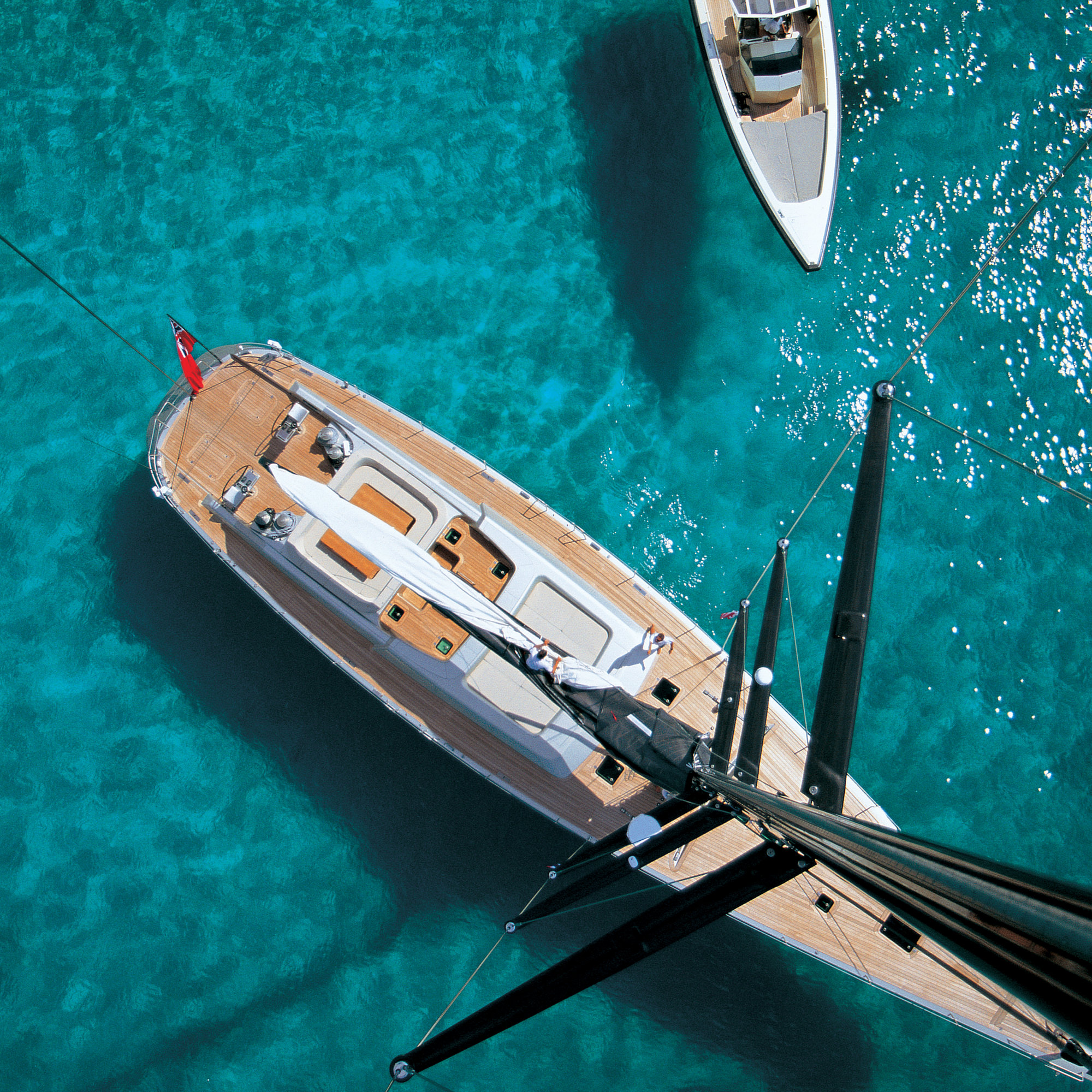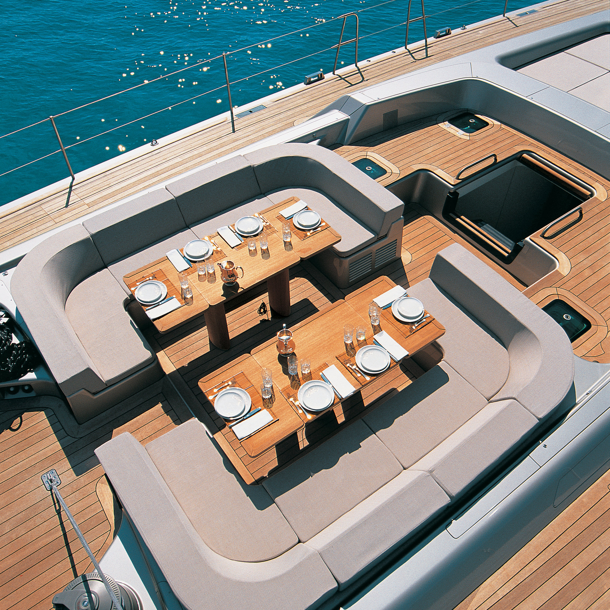The distinctive pale grey colour of the yacht’s hull was selected as a perfect match for ‘Grigio Ingrid’ the colour Ferrari developed at the request of Roberto Rossellini to match the shade of his wife Ingrid Bergman’s eyes. The overall effect is striking, with each of the material elements of the boat, both inside and out, working seamlessly. Ultimately, though, it is the black of the carbon-fibre floors, stairs, helm and sails, that really distinguish the yacht – and which also helped lend the boat its name.