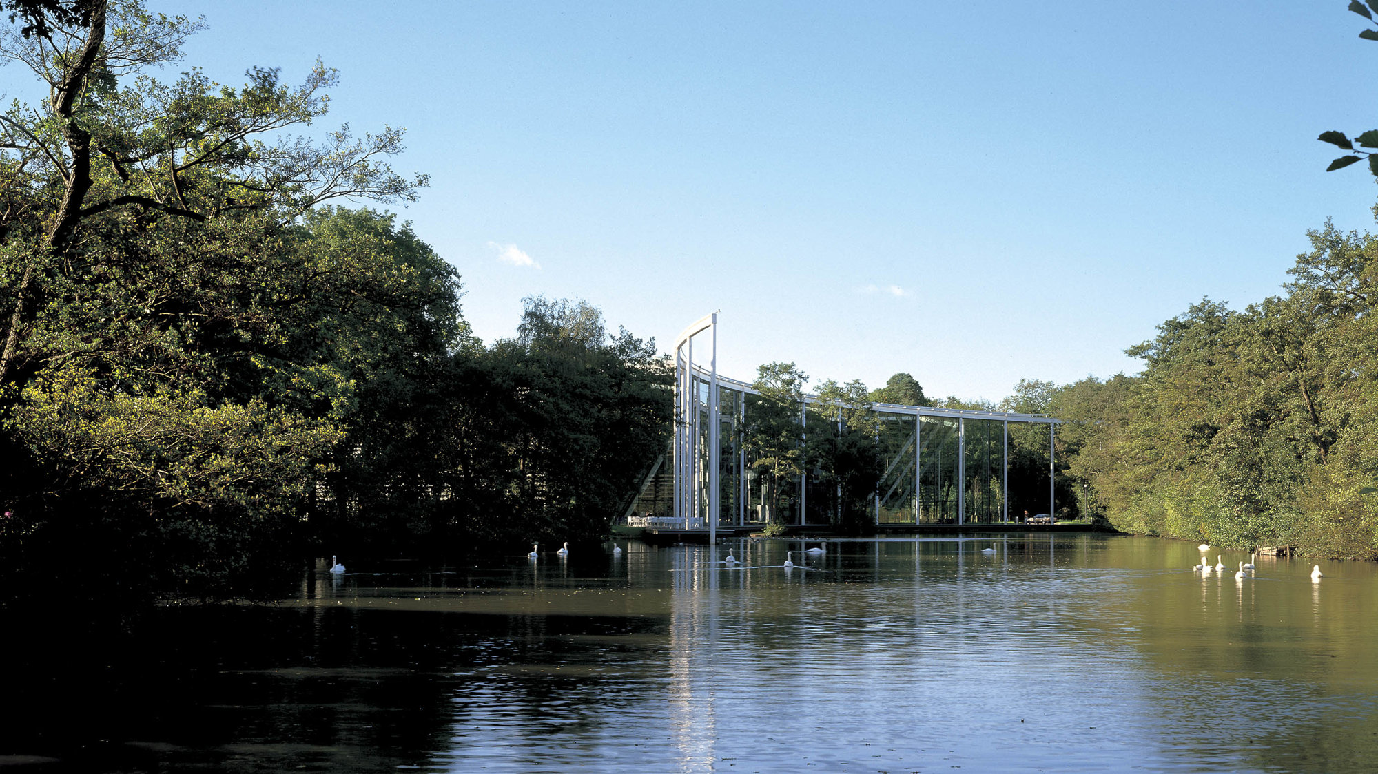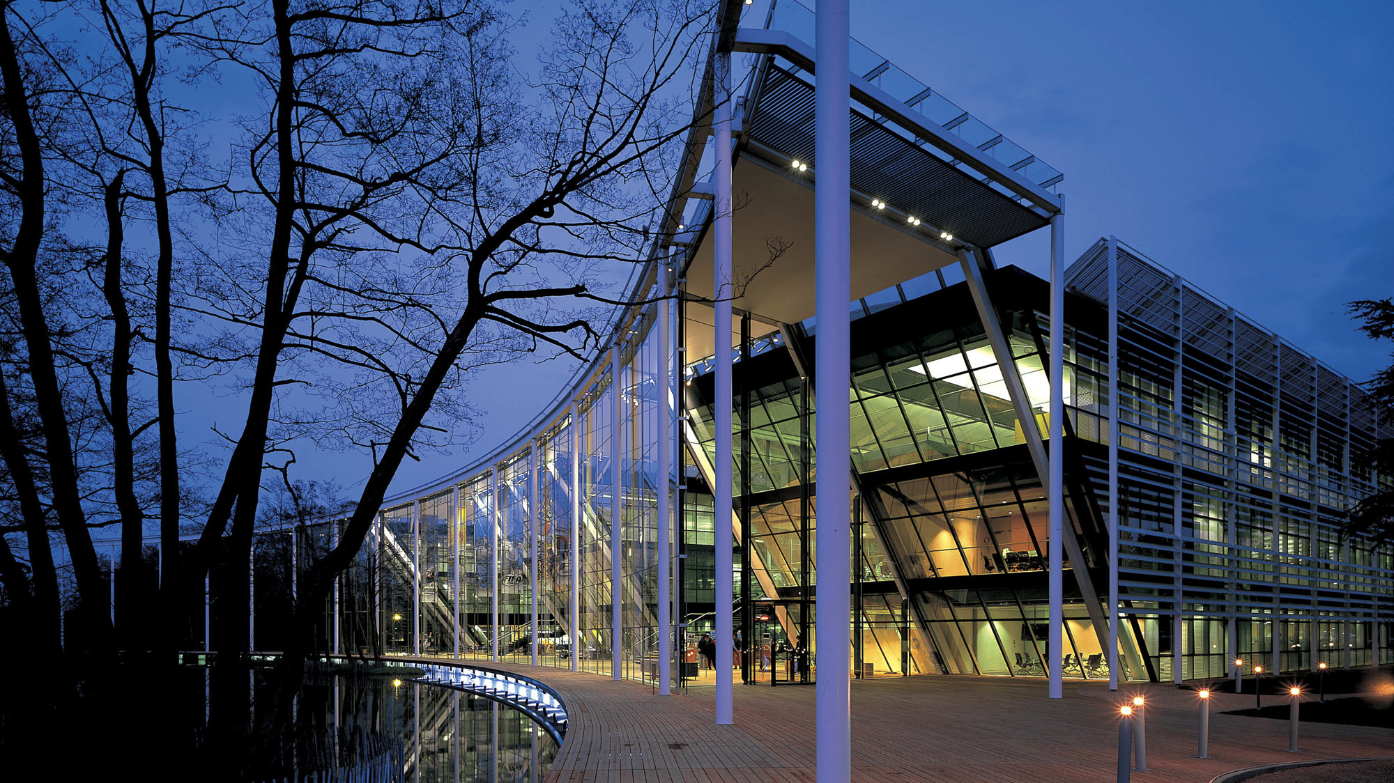 Bound to the north by an eighteenth-century lake, the building comprises a group of three-storey office blocks arranged as ‘fingers’, projecting into the landscape. These fingers are linked by a sweeping glass wall that encloses a street-like atrium. As an animated showcase for Electronic Arts’ work and the social focus of the campus, this atrium provides primary circulation at ground level and forms an environmental buffer between the offices and the landscape beyond. Electronic Arts’ staff takes pride in working as a family with common values. In keeping with this ethos, a huge range of facilities is provided, including games arcades, a gym and sports pitch, a library, a bar and a 140-seat restaurant. With this wealth of leisure options, staff members have joked that the experience is like ‘homing from work’.