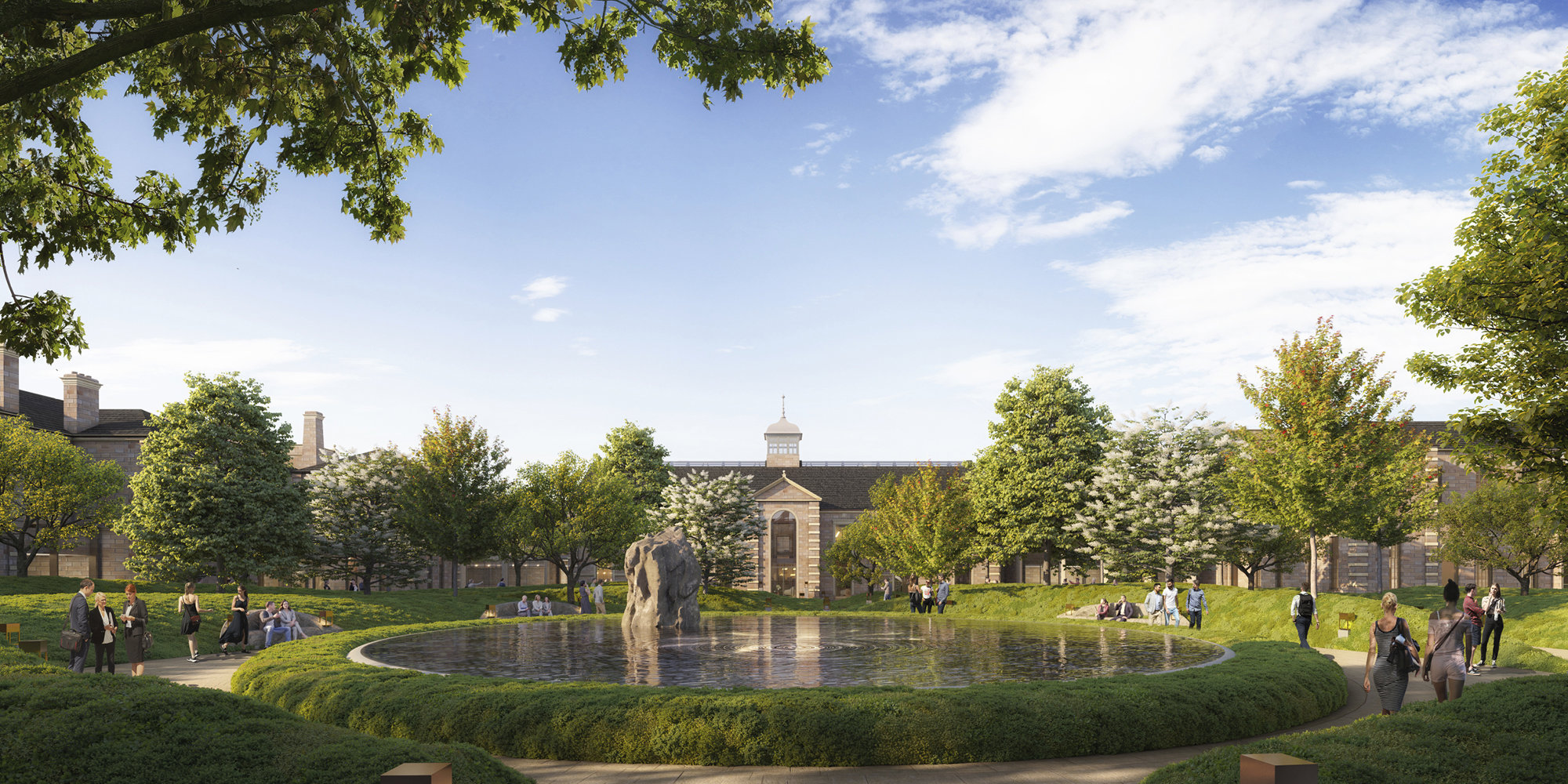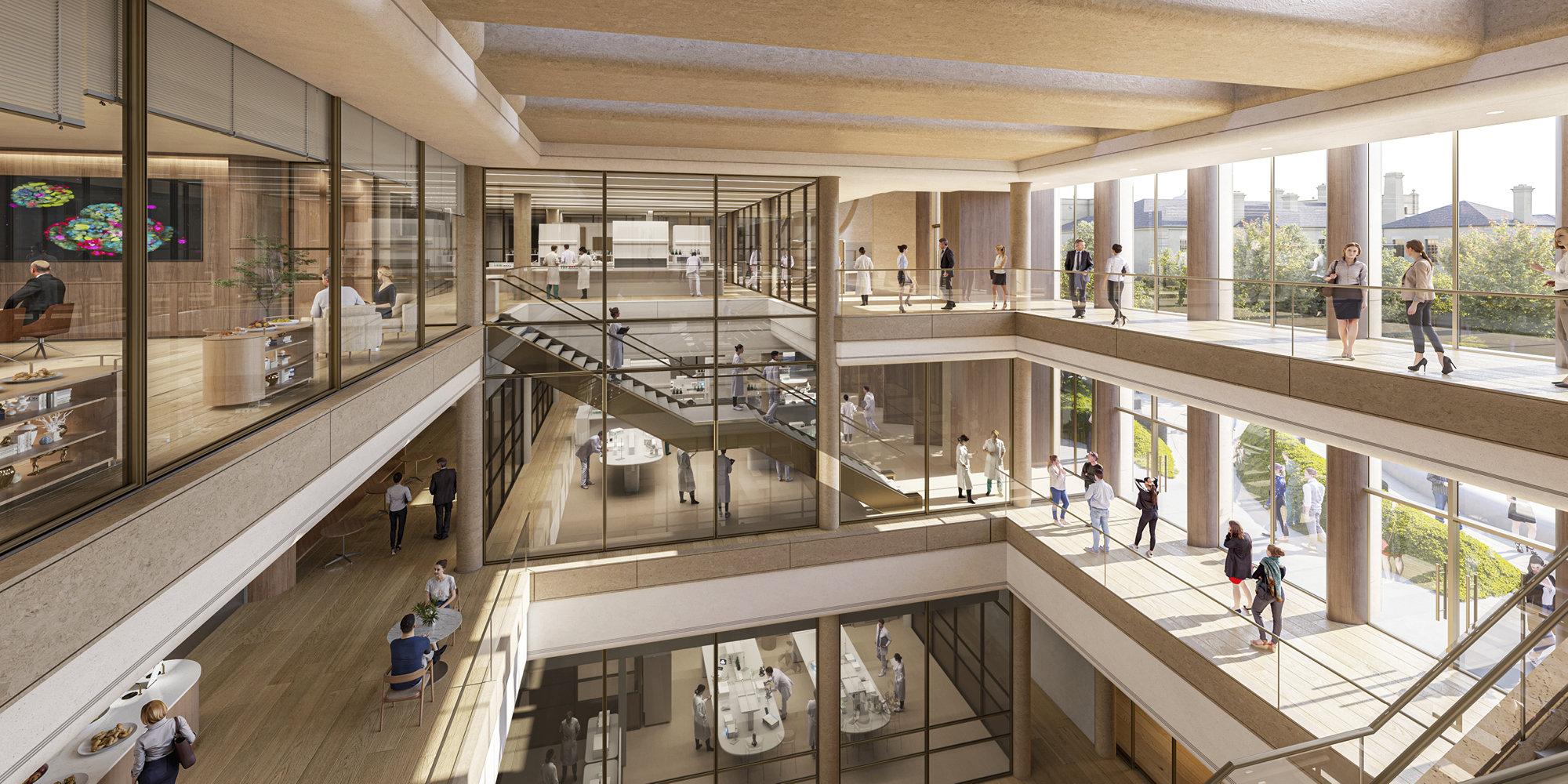 A number of existing buildings, including the historic Littlemore House, are being restored and connected to new pavilions along the eastern edge of the site. The new additions create a C-shaped configuration with a green courtyard at its heart. The courtyard is a landscaped outdoor area - with a circular water feature and seasonal planting - for patients, scientists, researchers and clinicians to enjoy together. Spaces between the buildings visually connect the courtyard with the surrounding streets, while sculptural fins on the façades of the new buildings provide shading, climate control and privacy.