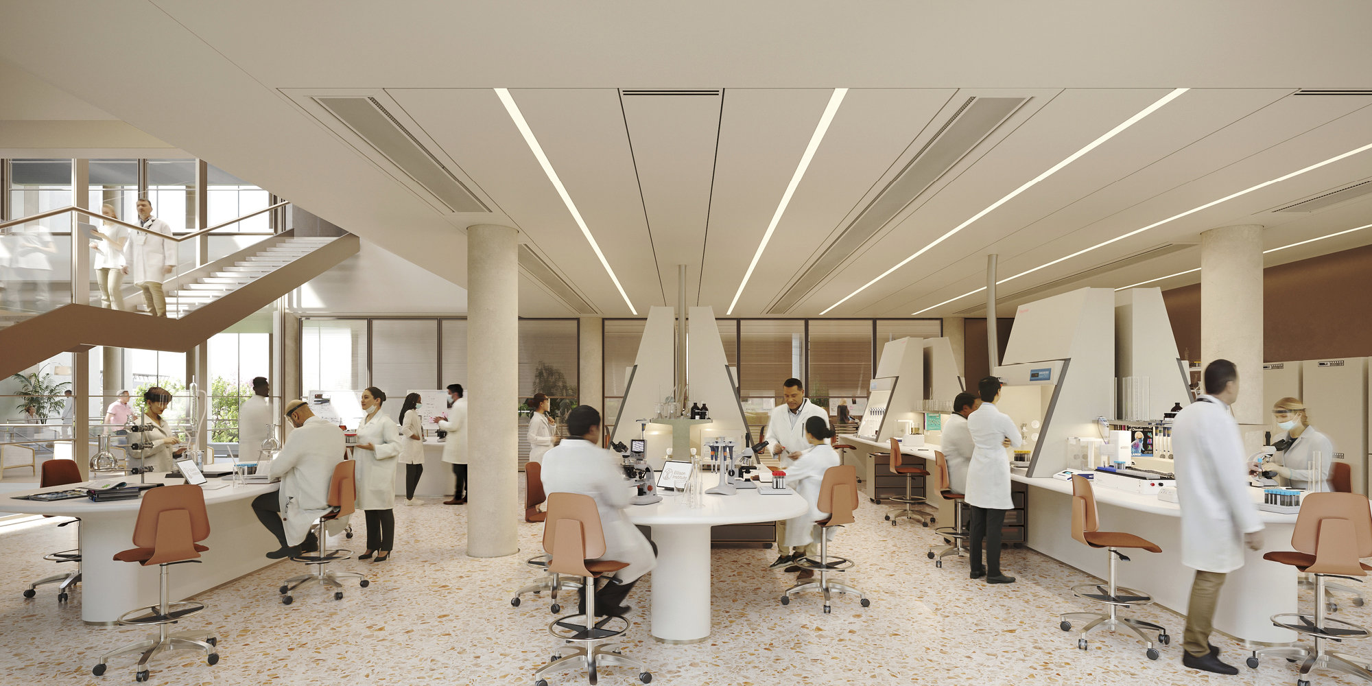 The functional spaces are arranged in a nonlinear way, to encourage chance encounters and collaboration between disciplines. Littlemore House has been restored and transformed into a single volume space, containing a library and study area that can also be adapted for informal meetings and events. Flexible laboratories can be adapted easily to meet the Institute’s changing needs over time.