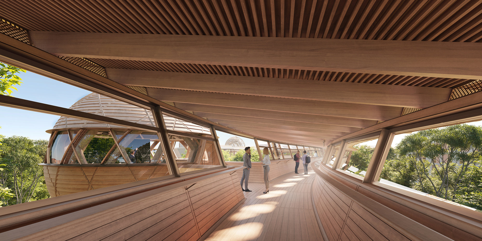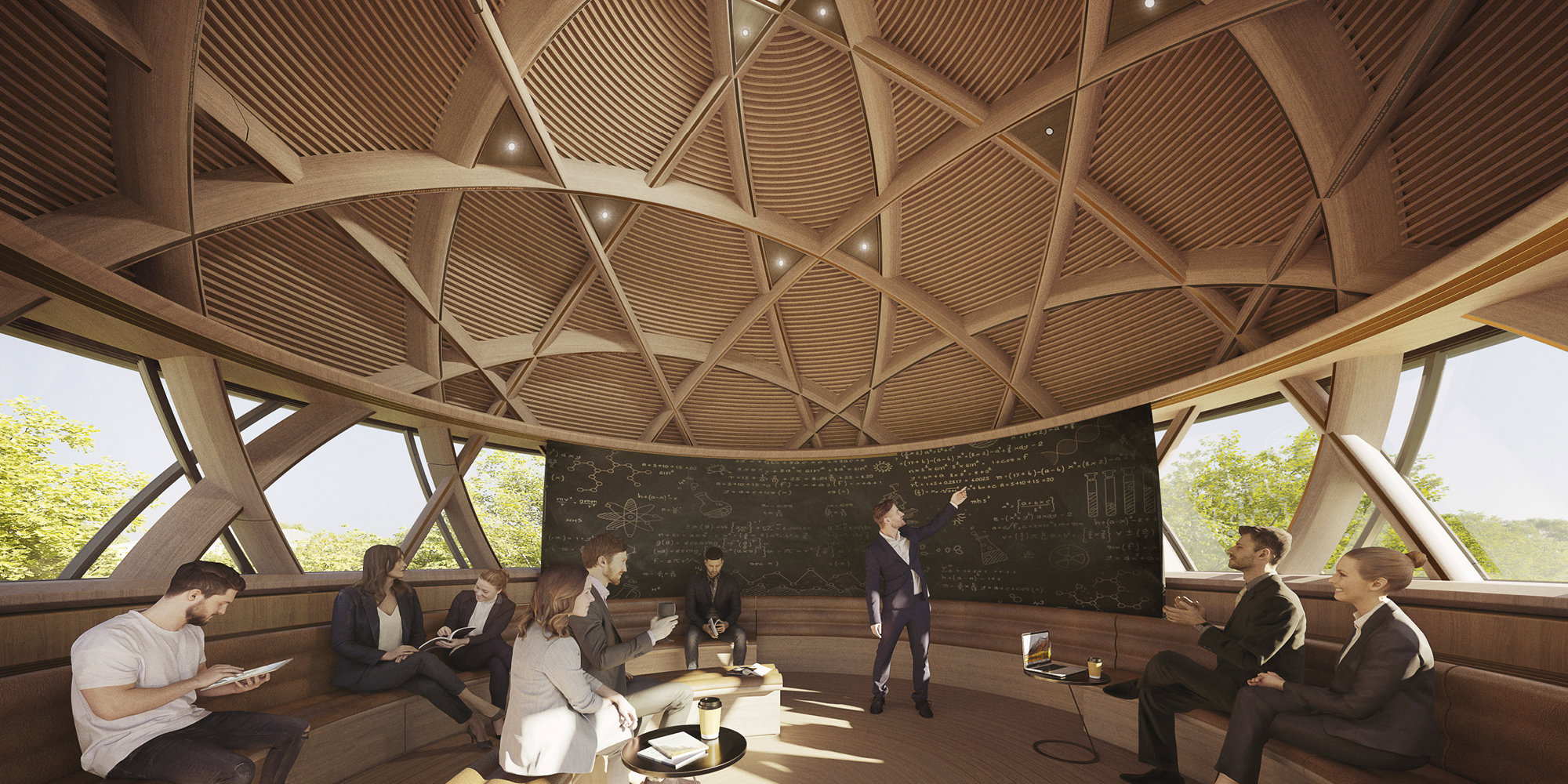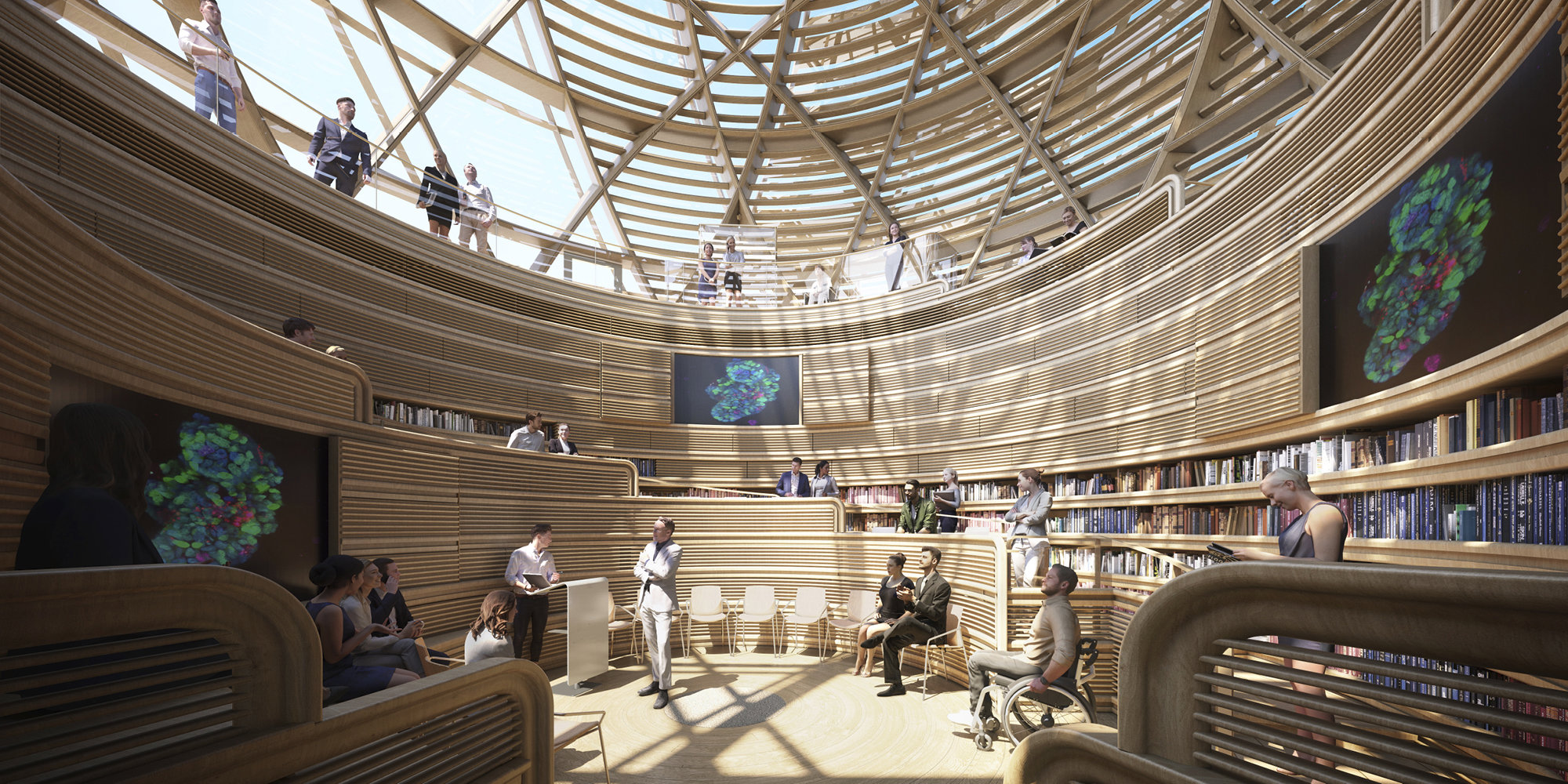 A new building with additional laboratories and educational spaces is located on the Oxford Science Park plot, one of Europe’s leading science parks. The building is lifted up on stilts - due to the adjacent Littlemore Brook - allowing landscaping and fresh air to flow directly underneath it. A wooden geodesic dome, with rotating solar shading, provides another striking forum for events, lectures and collaborative endeavours at the top of the building.