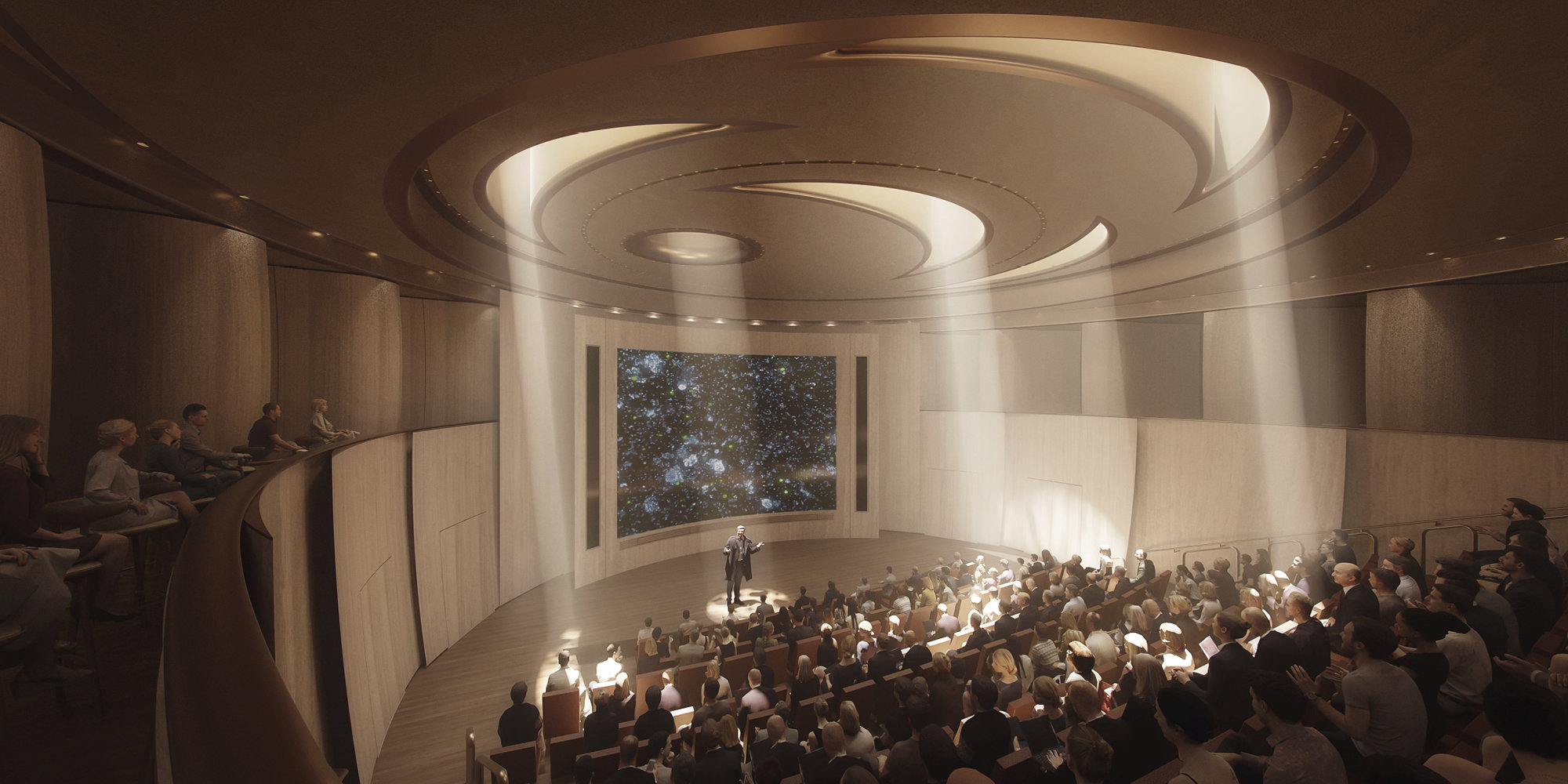 A sunken 250-seat auditorium, located beneath the courtyard, serves as a central meeting space for lectures and large-scale events. Light filters through the water feature above and dances on the walls of the auditorium.