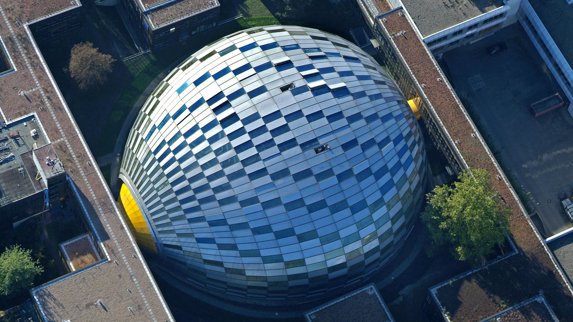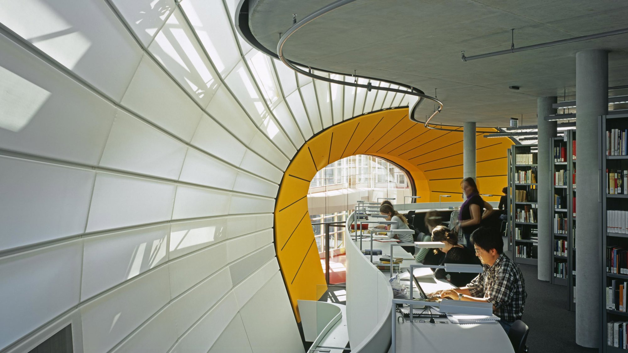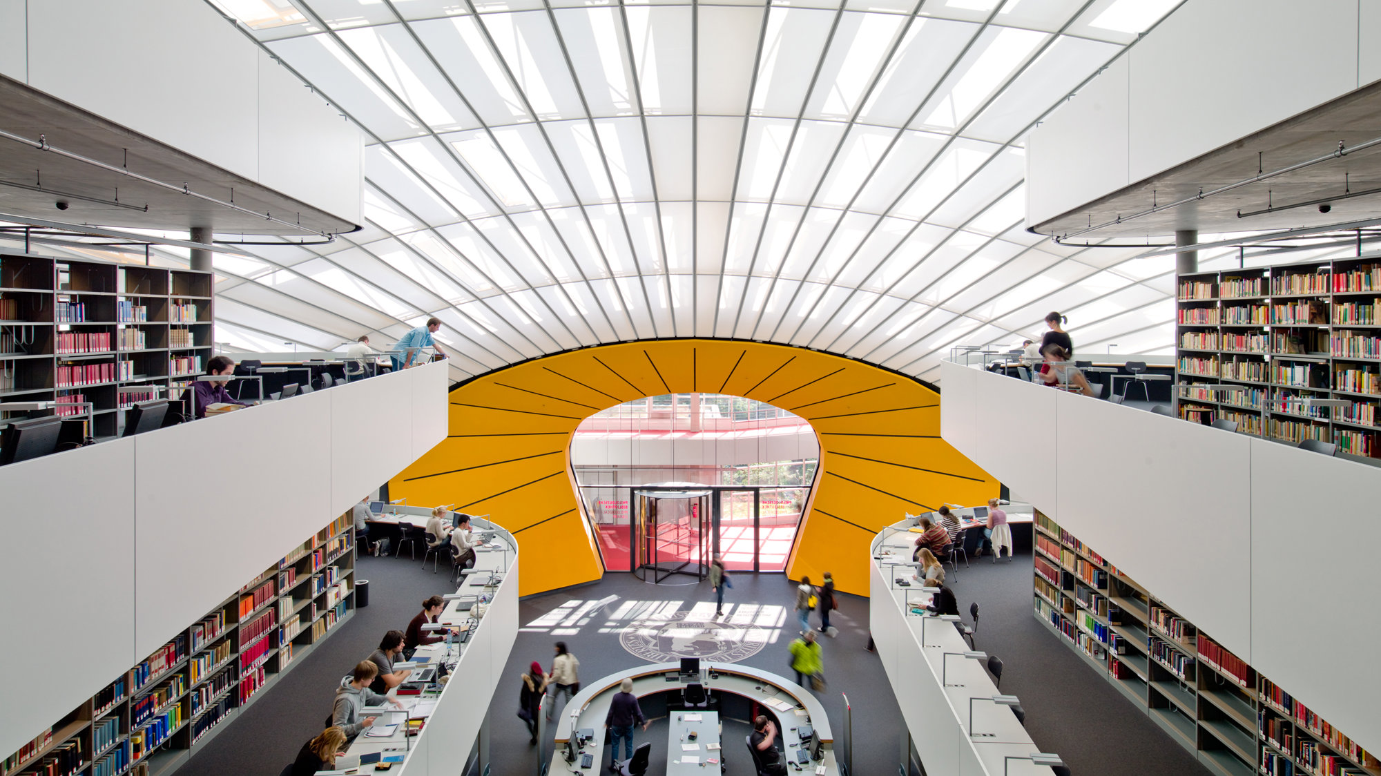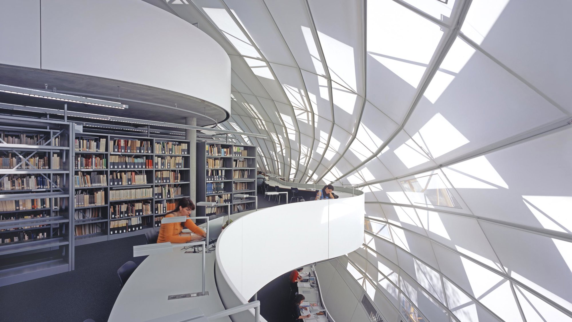 The new library occupies a site created by uniting six of the university’s courtyards. Its four floors are contained within a naturally ventilated, bubble-like enclosure, which is clad in aluminium and glazed panels and supported on a tubular steel frame with a radial geometry. A translucent inner membrane filters daylight and creates an atmosphere of concentration, while occasional transparent openings allow glimpses of sunlight. The bookstacks are located at the centre of each floor, with reading desks arranged around the perimeter. The serpentine profile of the floors creates a pattern in which each floor swells or recedes with respect to the one above or below it, generating a sequence of generous, light-filled spaces in which to work. Interestingly, the library’s cranial form has earned it a nickname of its own – ‘The Berlin Brain’.
