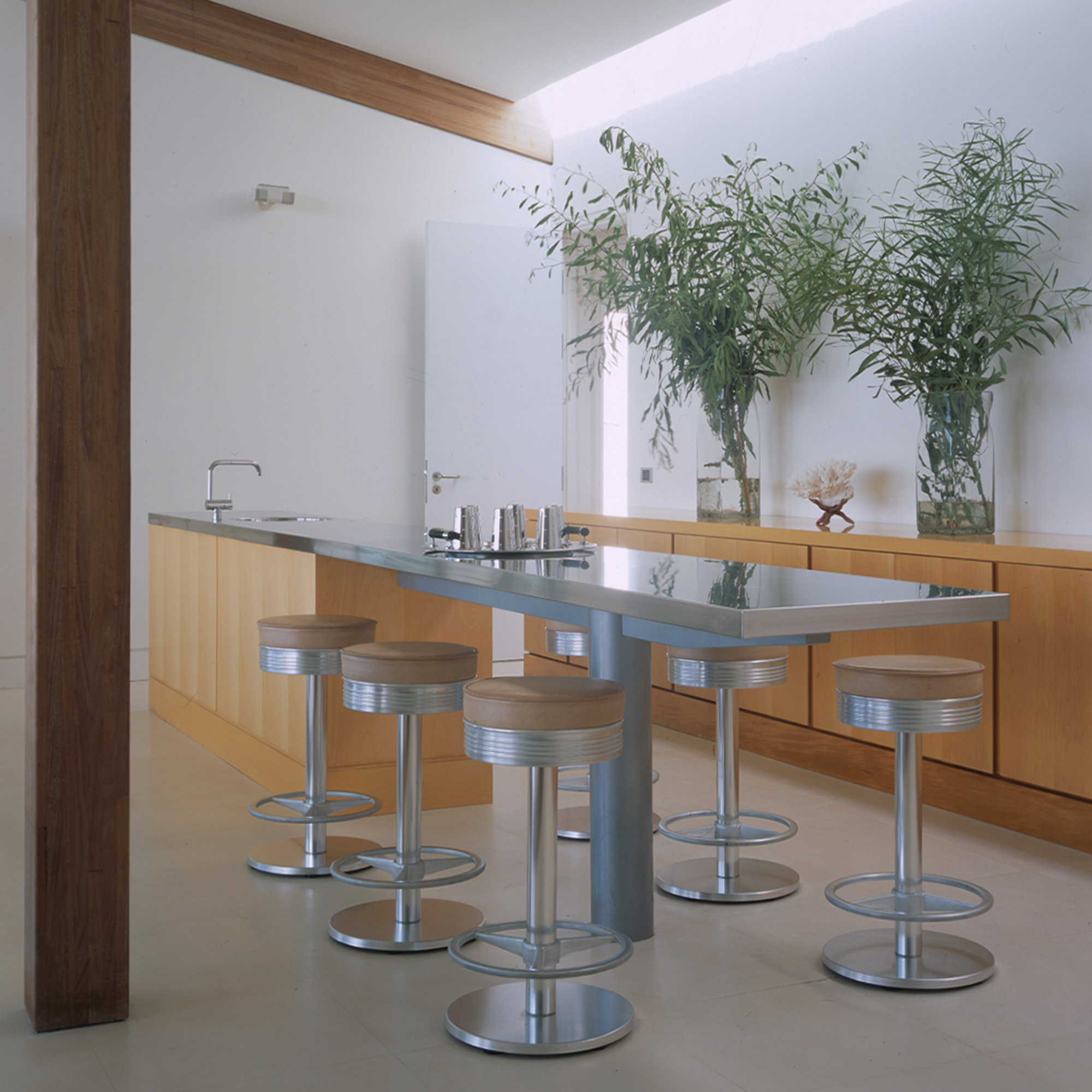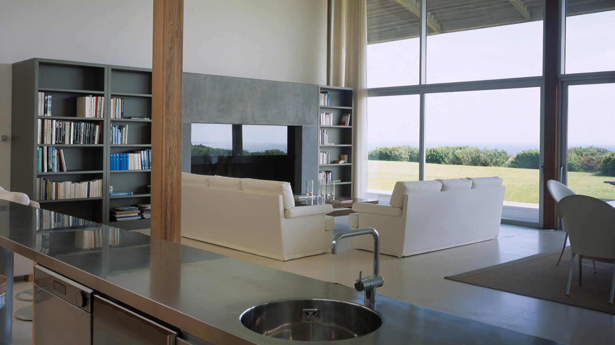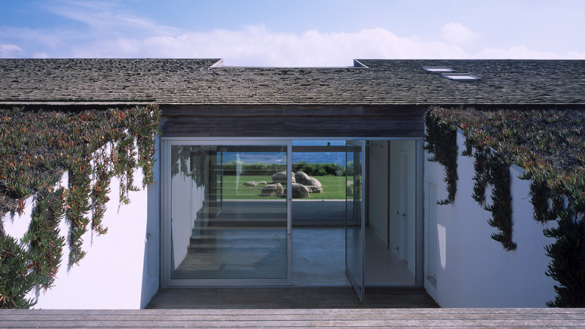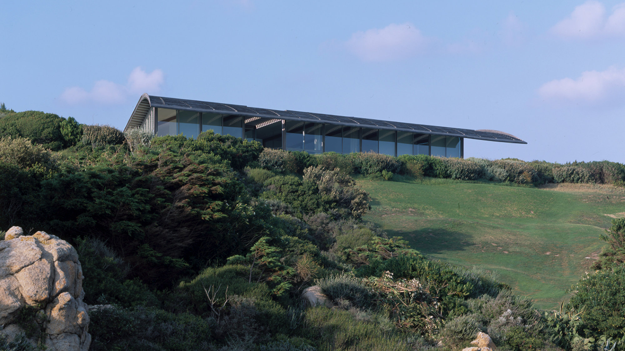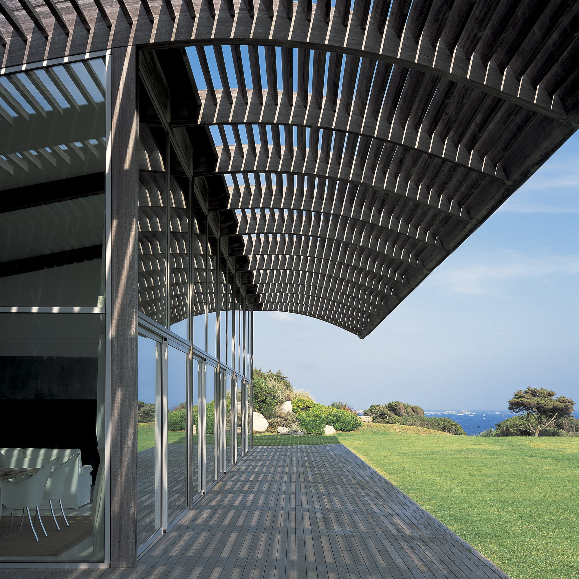 Glazed on three sides, with sliding doors that dematerialise the boundary between house and terrace, the outdoor spaces form a natural and fluid extension of the interiors, in the Mediterranean tradition. Responding to the Spérone context, the house is timber-framed. The most prominent structural members are the long, glue-laminated beams that support the cedar shingle roof. These tapering, rib-like beams cantilever out on the southern side to form a brise-soleil canopy, which attenuates the roof in an aerodynamic curve.