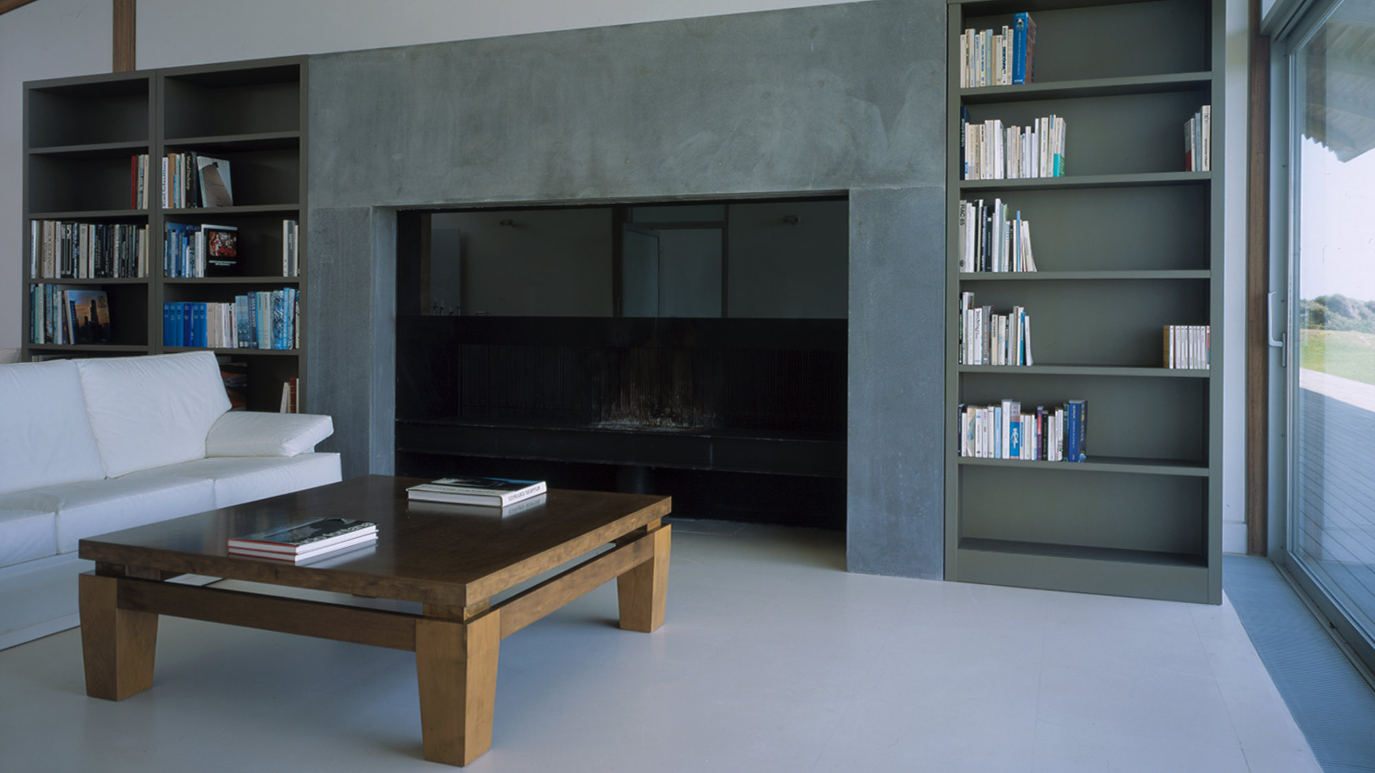 Approached from the landward side, the house offers a discreet presence. It is dug into the contours of the site and sheltered by a monopitch roof, which spreads out like a protective bird’s wing. Organised on a single level, the house is wedge-shaped in both plan and section. Ancillary functions, such as kitchen and bathrooms, line the northern edge of the plan, where the roof is lowest, while the grander communal spaces, main bedrooms and study are placed on the southern side to take advantage of the soaring double-height volume created by the roof as it rises. Closed to the north, the house opens up dramatically to the south to take advantage of the Mediterranean light and breathtaking views. The plan is bisected on the short cross axis by a circulation core, which separates the children’s bedrooms from the communal spaces and extends northwards to create a formal sequence of approach and entry. On the southern side, this route culminates in a broad shaded terrace.