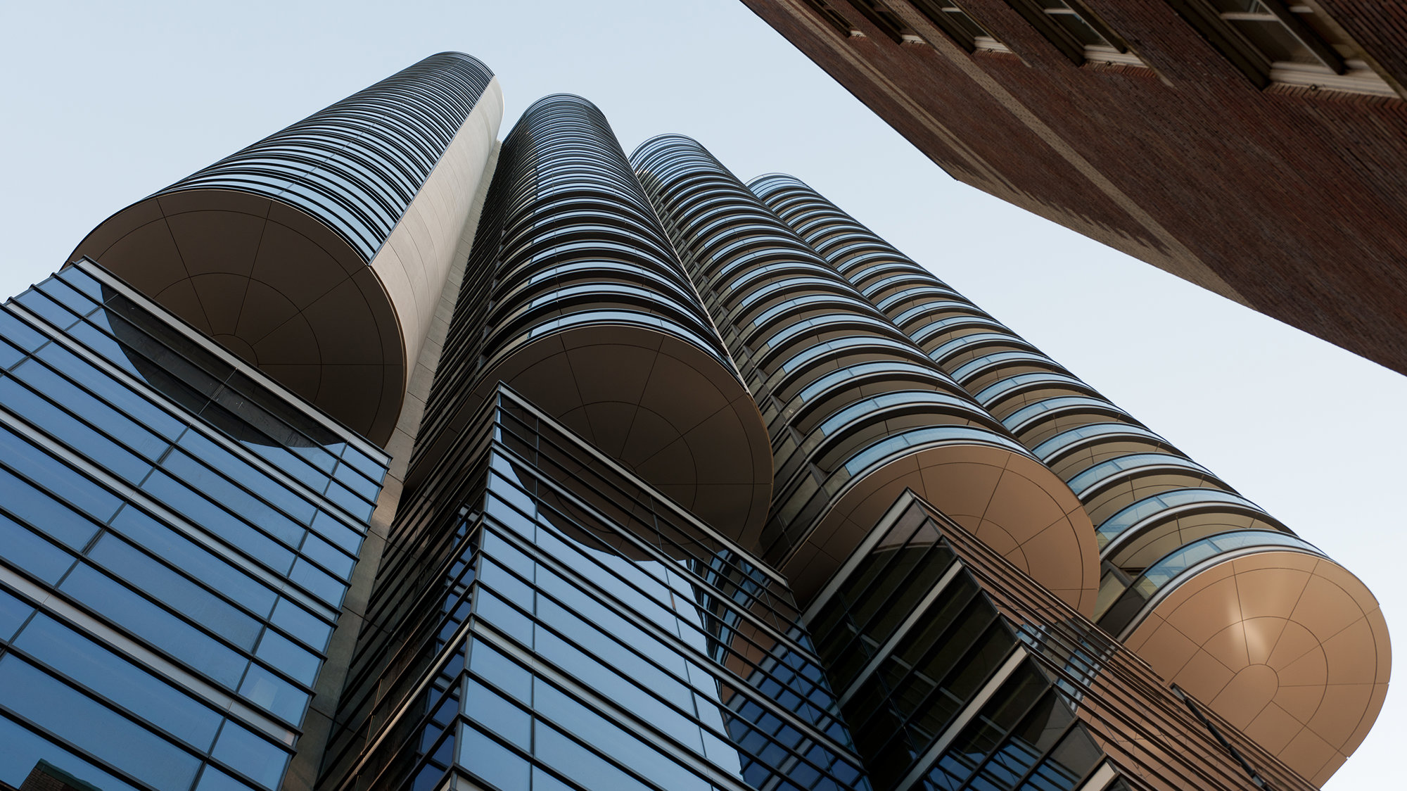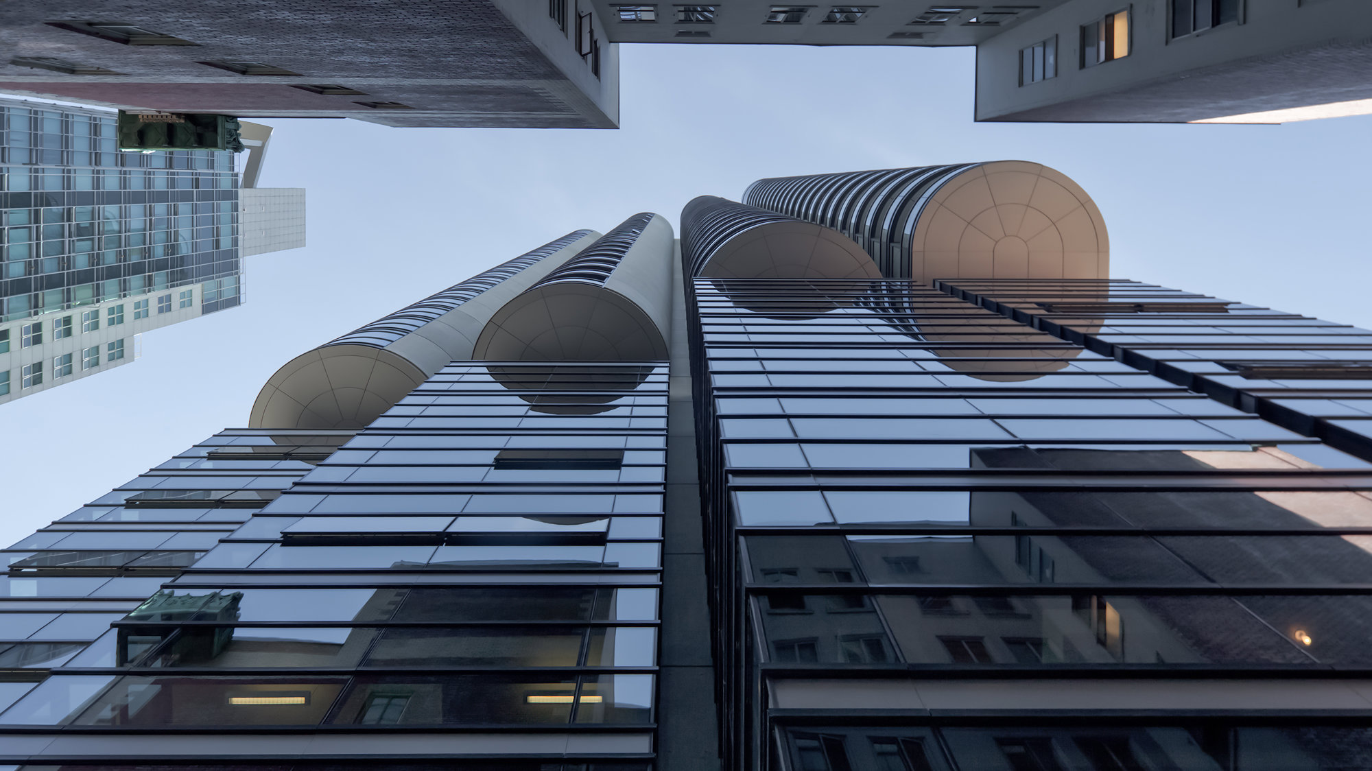The project involves the restoration of the A-listed Ceperley Rounsfell Building of 1921- returning the entire internal double-height volume to its original configuration - and the retention of the facade of the B-listed Royal Financial Building, which dates from1929. The new tower comprises eight storeys of offices above shops and twenty-six storeys of apartments. The tower's form articulates the different functions that the scheme brings together. The first two storeys continue the row of shop units at street level, while the uppermost office floor aligns with the cornice line of the adjacent building. In contrast to the smooth facade of the offices, the apartment floors curve outwards in four wide bays, which are stepped vertically to provide shade and uninterrupted mountain views. The plan supports a variety of apartment types and spatial arrangements, with the living spaces focused on the deep curve of the window bays. All the apartment interiors have been designed by the practice, with variations of Foster kitchen and bathroom fittings. At the top of the tower, penthouse apartments are arranged over two storeys and feature landscaped roof terraces.