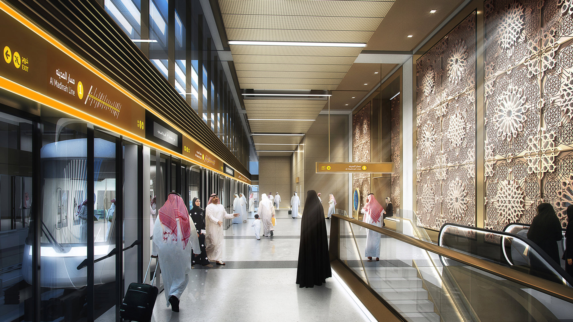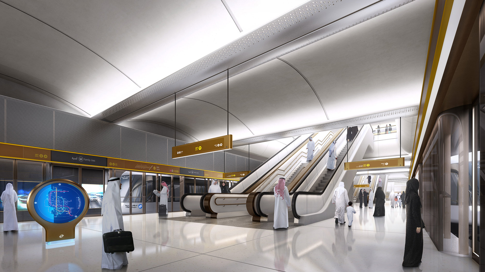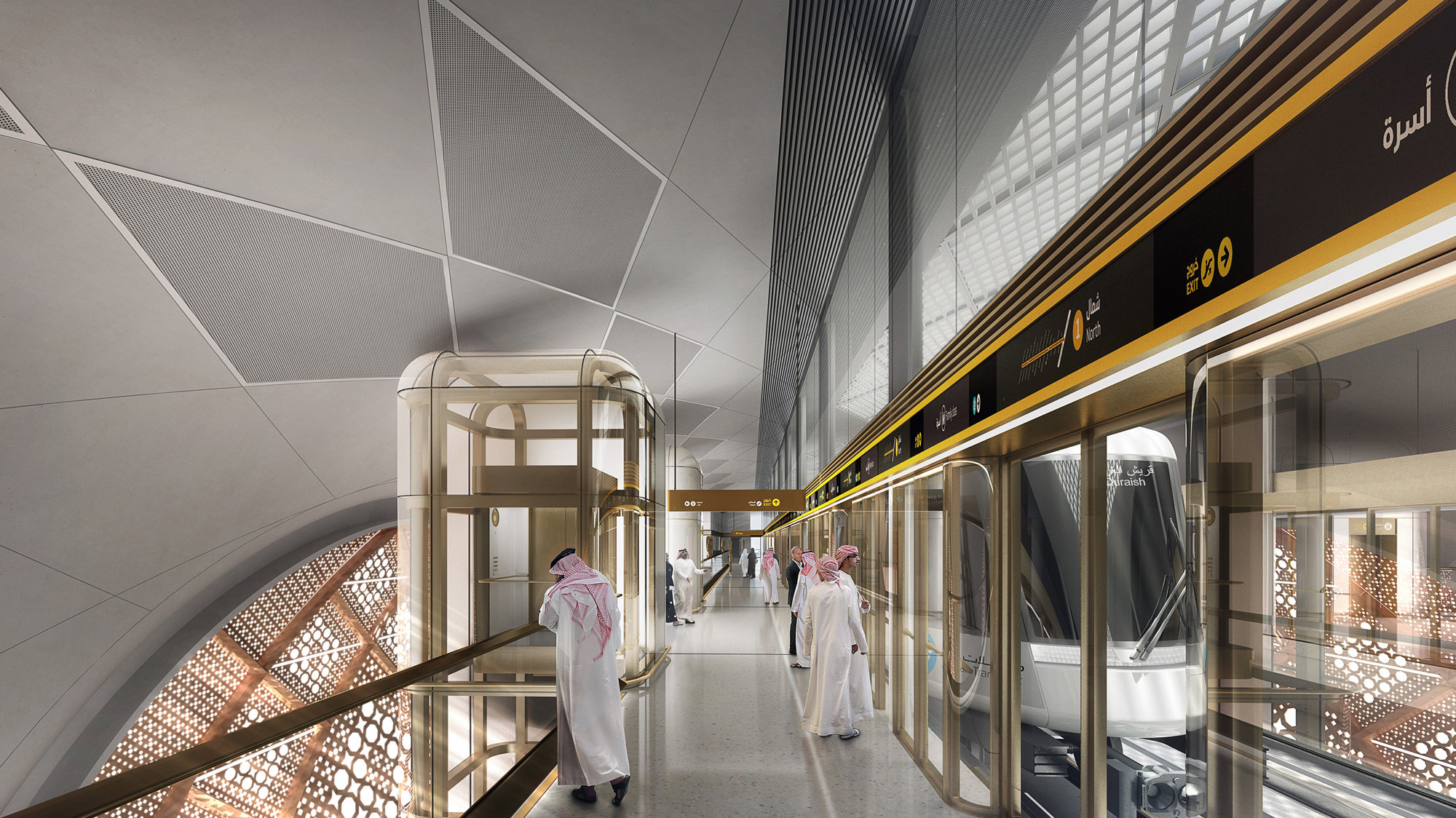 Working with Space Syntax, the practice has conducted extensive urban analysis to create better pedestrian connections throughout the new masterplan. The stations are therefore designed as efficient intermodal hubs, allowing passengers to transfer easily between different modes of transport, from high-speed rail, metro, bus and tram to water taxi and a network of shaded cycle routes and pedestrian walkways. Architecturally, the challenge was to create a coherent identity for the whole metro system, while expressing the individual character of each site. The distinctive white concrete arches tie the entire network together visually, while providing a flexible, modular unit for development and expansion. Each station also has shading screens contained within these arches, designed in collaboration with Saudi artists Ahmed Angawi and Dana Awartani, which express the local character – both materially and aesthetically.