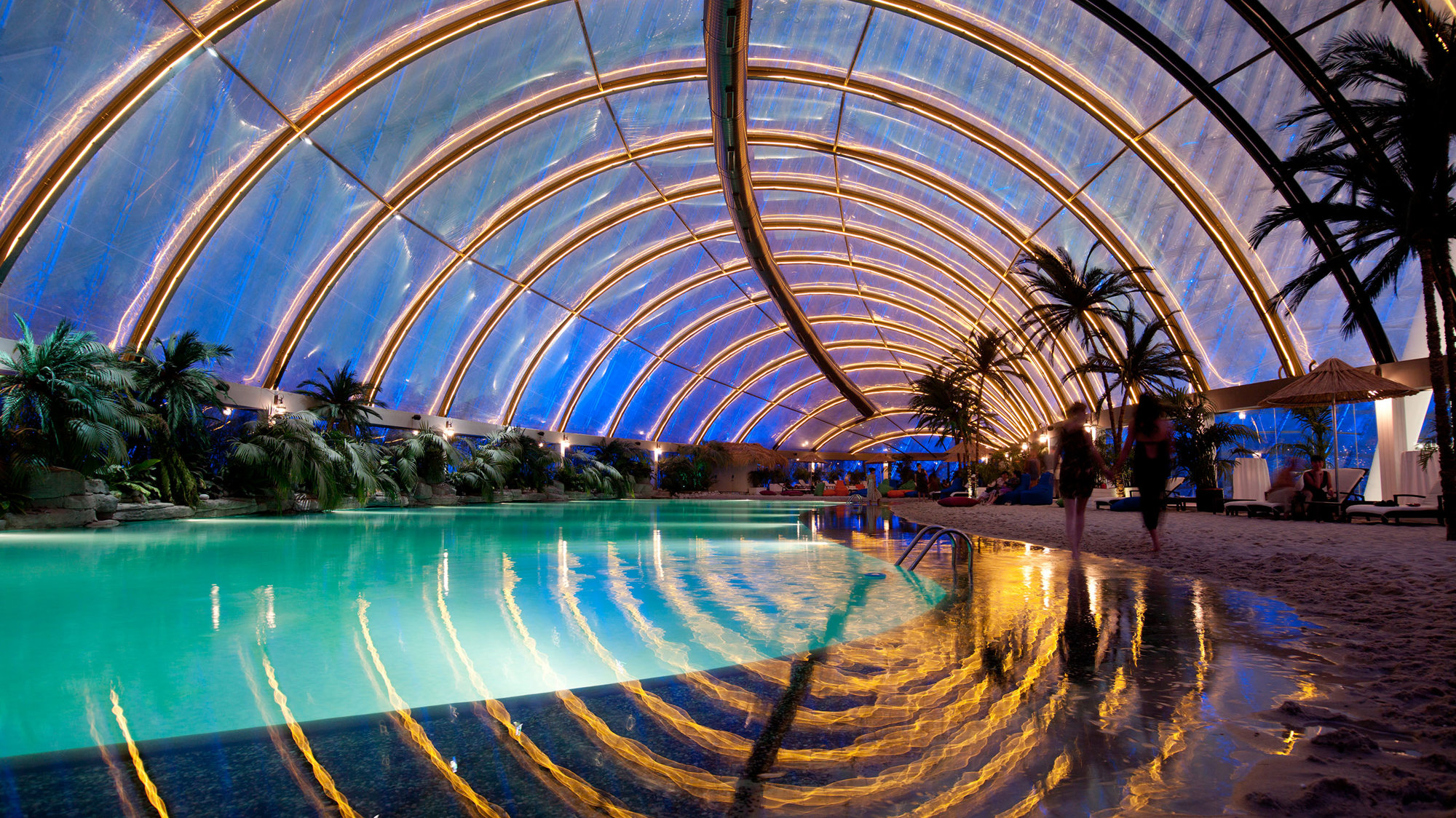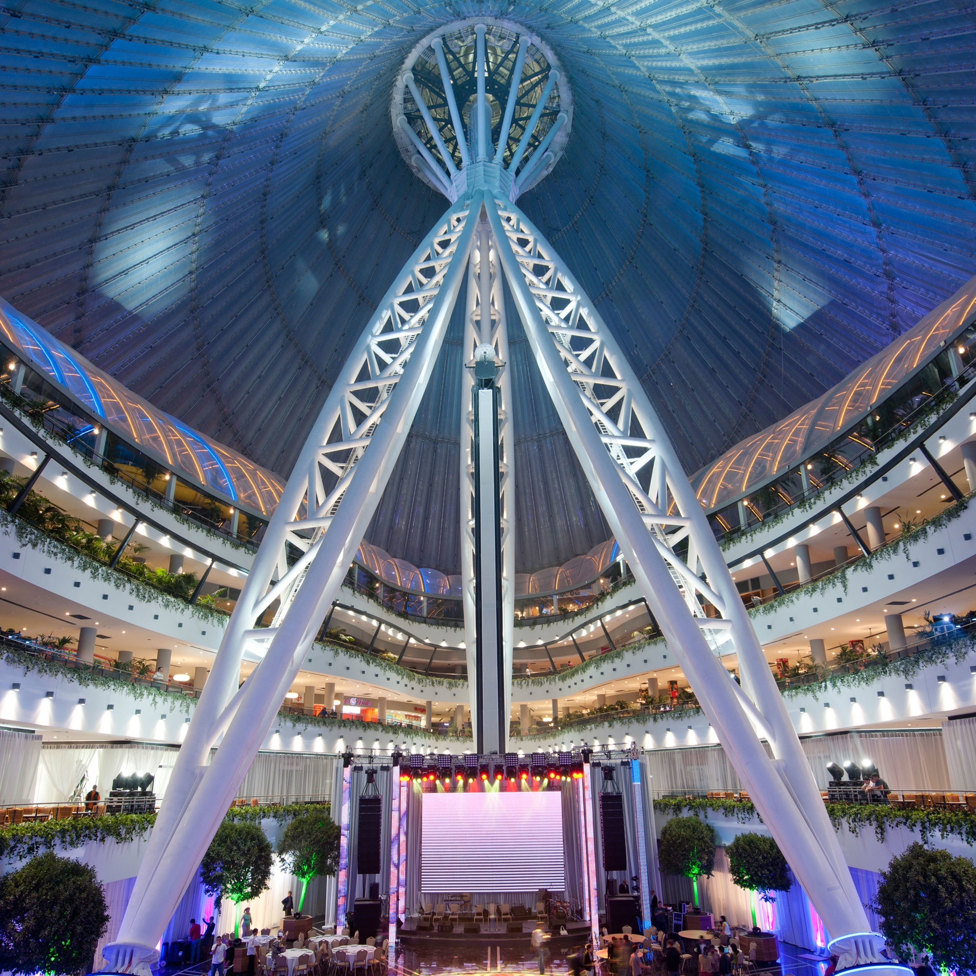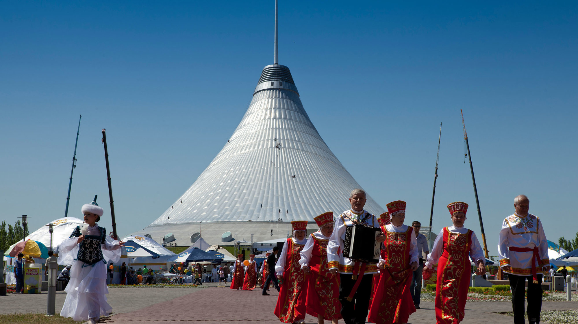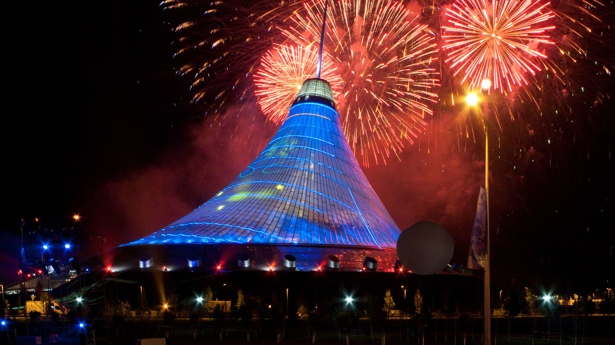 Located at the northern end of the city's formal axis, the masted structure soars 150 metres from a 200 x 195-metre elliptical base to form one of the highest peaks on the Astana skyline. Enclosing an area in excess of 100,000 square metres it comprises an urban-scaled park, with a 450-metre jogging track, along with a wide variety of shopping and leisure facilities, including restaurants, cinemas and entertainment spaces that can accommodate a varied programme of events and exhibitions. The park steps up the height of the building in undulating terraces and a water park, with wave pools and slides, weaves its way through the landscape.