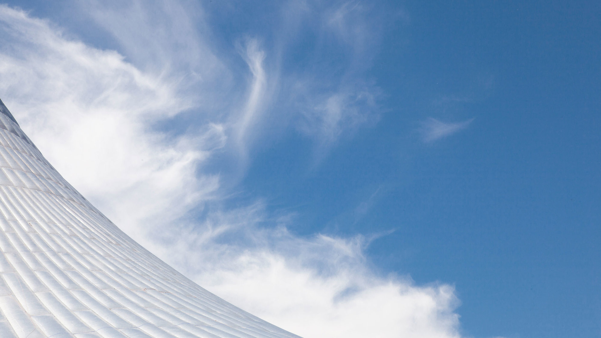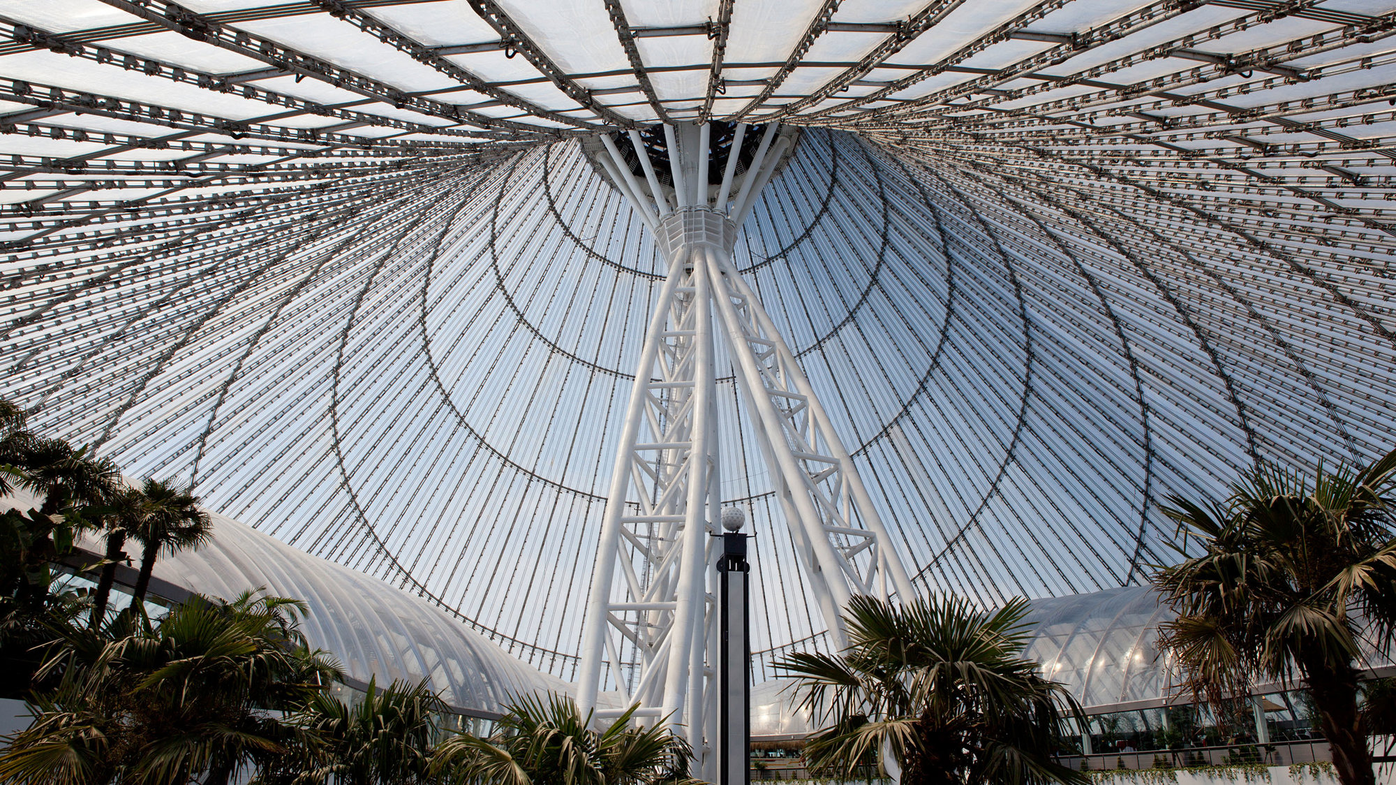 The tubular-steel tripod structure supports a suspended net of steel radial and circumferential cables, which is clad with a three-layer ETFE envelope, formed as 3.5 x 30-metre cushions - a very light, economical and thermally efficient solution. The translucent material allows daylight to wash the interiors while sheltering them from weather extremes. Specific enclosures within the envelope are air conditioned, but the open circulation areas are environmentally tempered, with target temperatures of +14 degrees Celsius in winter and +29 degrees in summer. Low-level jets direct cool air across the space, while vents at the apex induce natural stack-effect ventilation. The challenge in winter is to prevent ice forming on the inside of the envelope. This is achieved by a combination of temperature control and directing warm air currents up the inner fabric surface, a strategy that also prevents downdraughts.