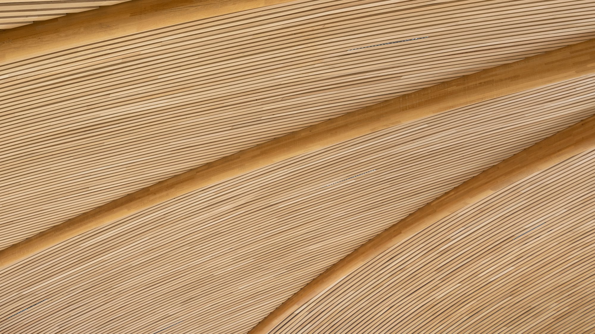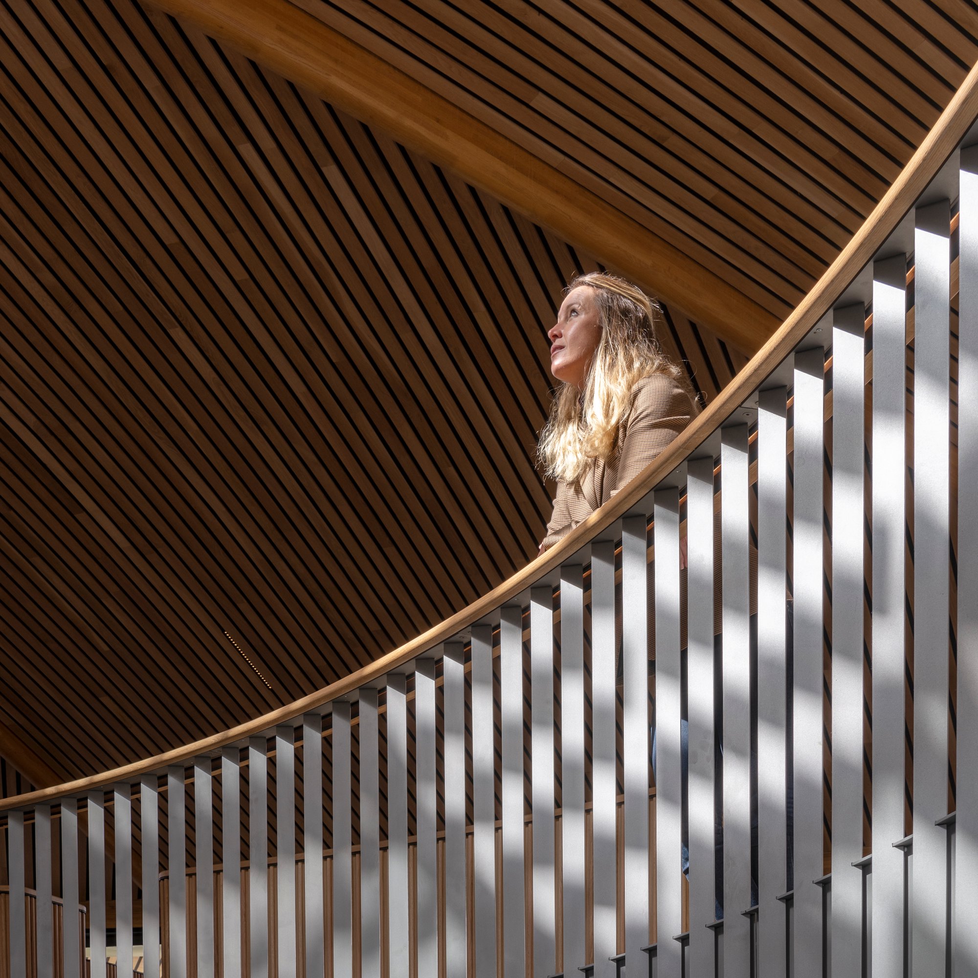 The 40-metre diameter timber roof is a unique reciprocal structure consisting of mutually supporting sloping beams that spans over large column-free space. The structure naturally creates a 6-metre-wide oculus at its centre, which allows daylight to flood the upper level. The roof is clad with recycled local terracotta tiles, while the base of the building – made with concrete using aggregate from the region – is covered with timber slats and partially buried into the ground to reduce its visual impact on the terrain and increase thermal mass performance. The building to reinforces the landscape by creating a hill-like form that echoes the gentle slopes that surround it.