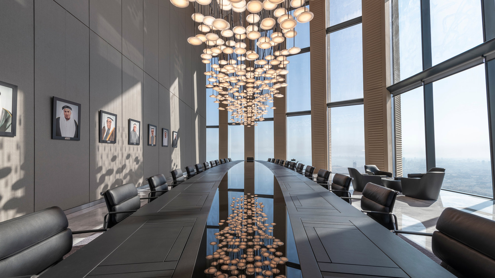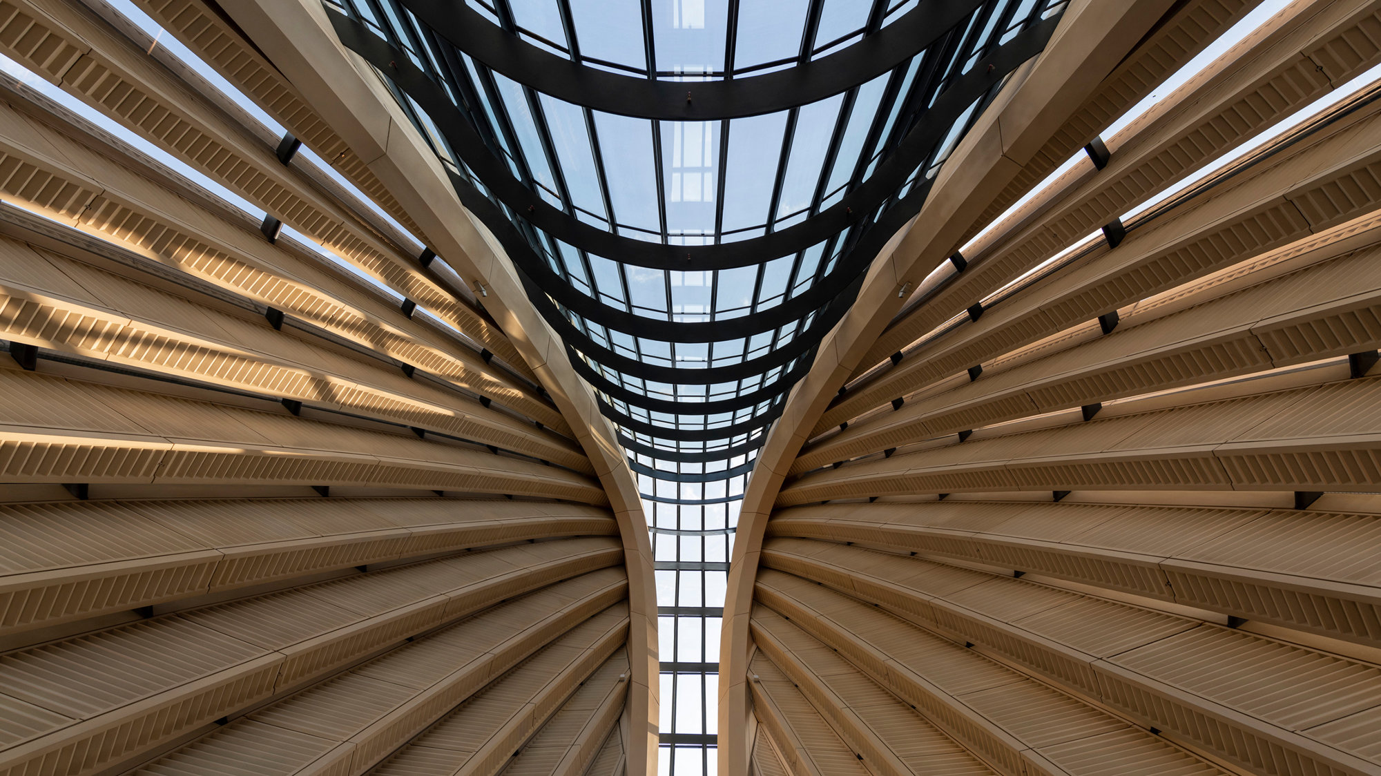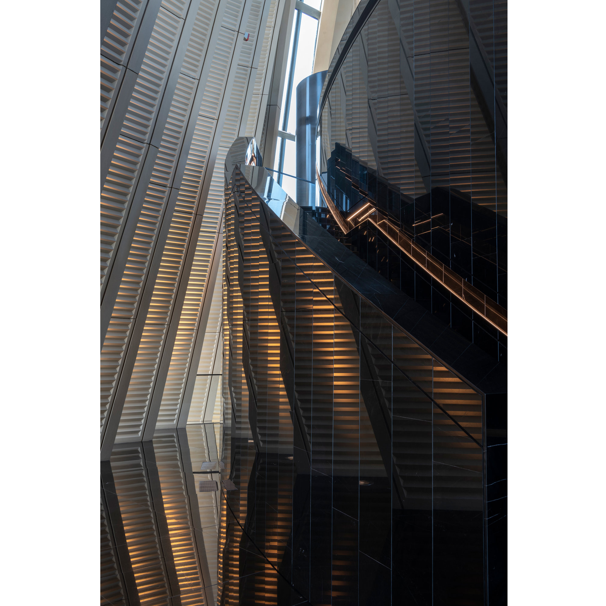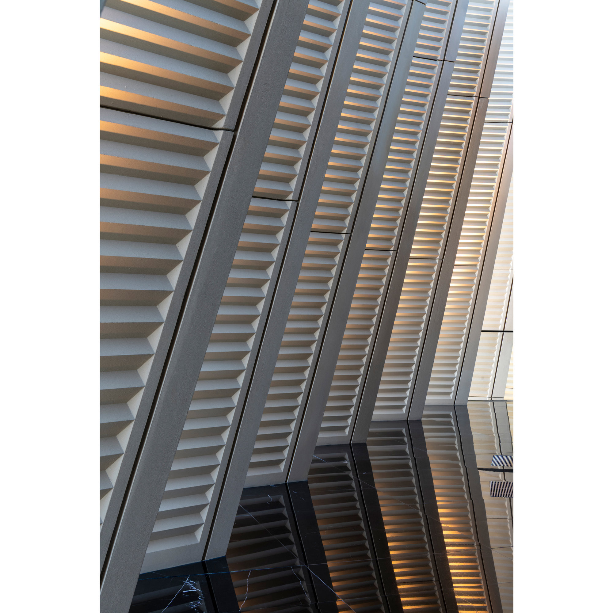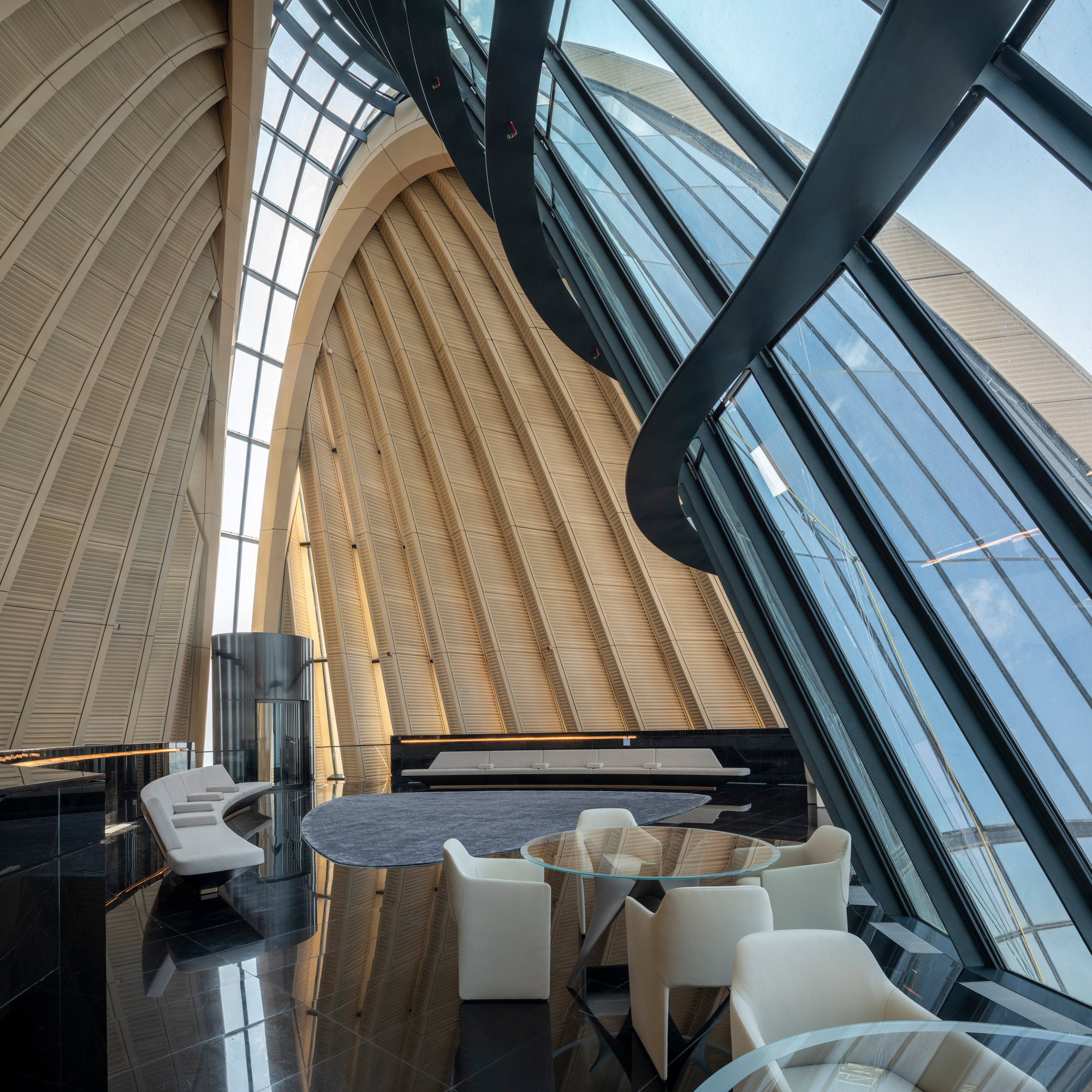 The tower’s cylindrical form opens like a shell to the north to avoid solar gain, while revealing views of the Arabian Gulf. The southern façade is shaded by a series of concrete fins, which extend the full height of the tower to provide structural support. As well as contributing to the environmental strategy, these ribs help to evoke a sense of place in echoing the form of the dhow sailing boat – a reference to the city’s roots in international trade. By tapering towards the base, the design maximises floor space in the upper levels and promotes self-shading, as the overhanging floor plates shelter the offices below. Utilising both passive and active measures to reduce water and energy consumption, the project targets a LEED Gold rating.