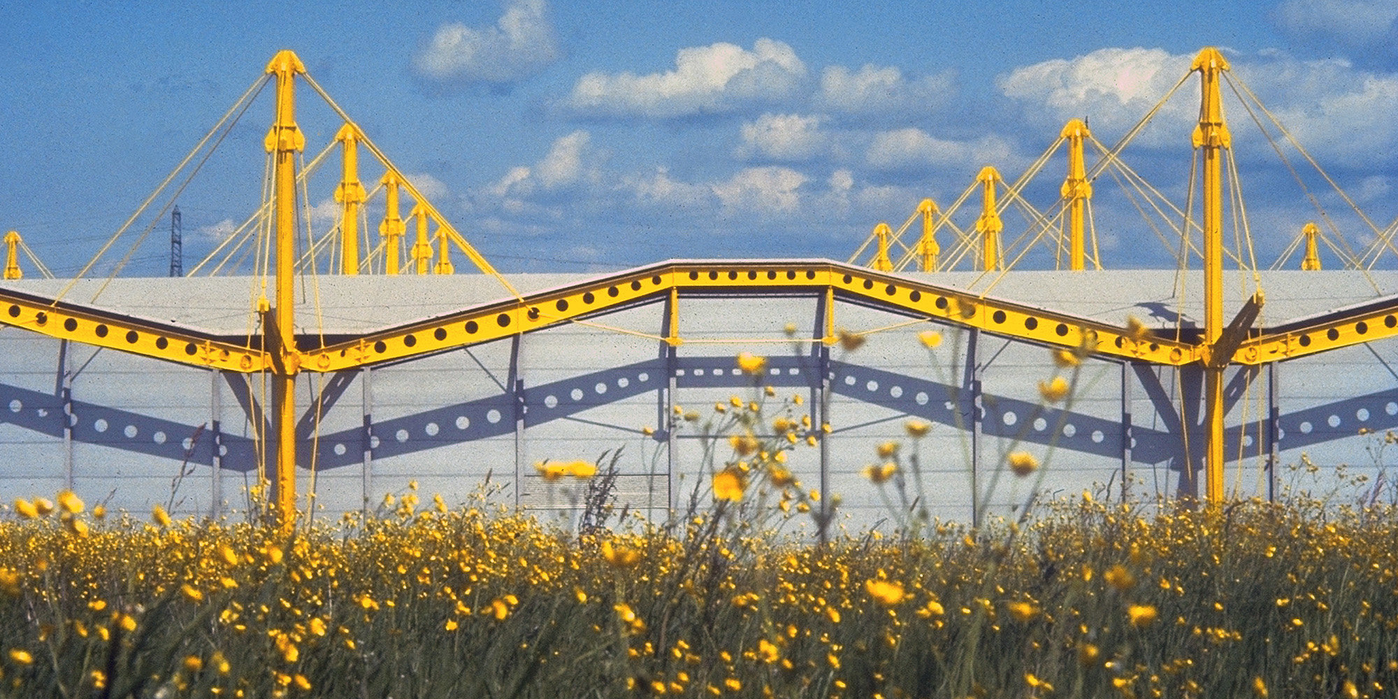 The structural system that repeats itself to form this external outline is based around a 24 by 24 metre bay a much larger than usual planning module developed so as to maximise the planning flexibility of the internal spaces. This expansive horizontal span is combined with an internal clear height of 7.5 metres, allowing the Centre to accommodate a range of uses from industrial warehouse racking to its subdivision into office floors. Enveloped by a continuous PVC membrane roof, pierced by glass panels at each mast, the building is also stepped at one end, narrowing to a single, open bay that forms a porte-cochre alongside a double-height gallery. Primarily a showroom - as signified by suspended car body shells - the gallery was used by Renault as a popular venue for arts and social events, encouraging wider community involvement in the building.