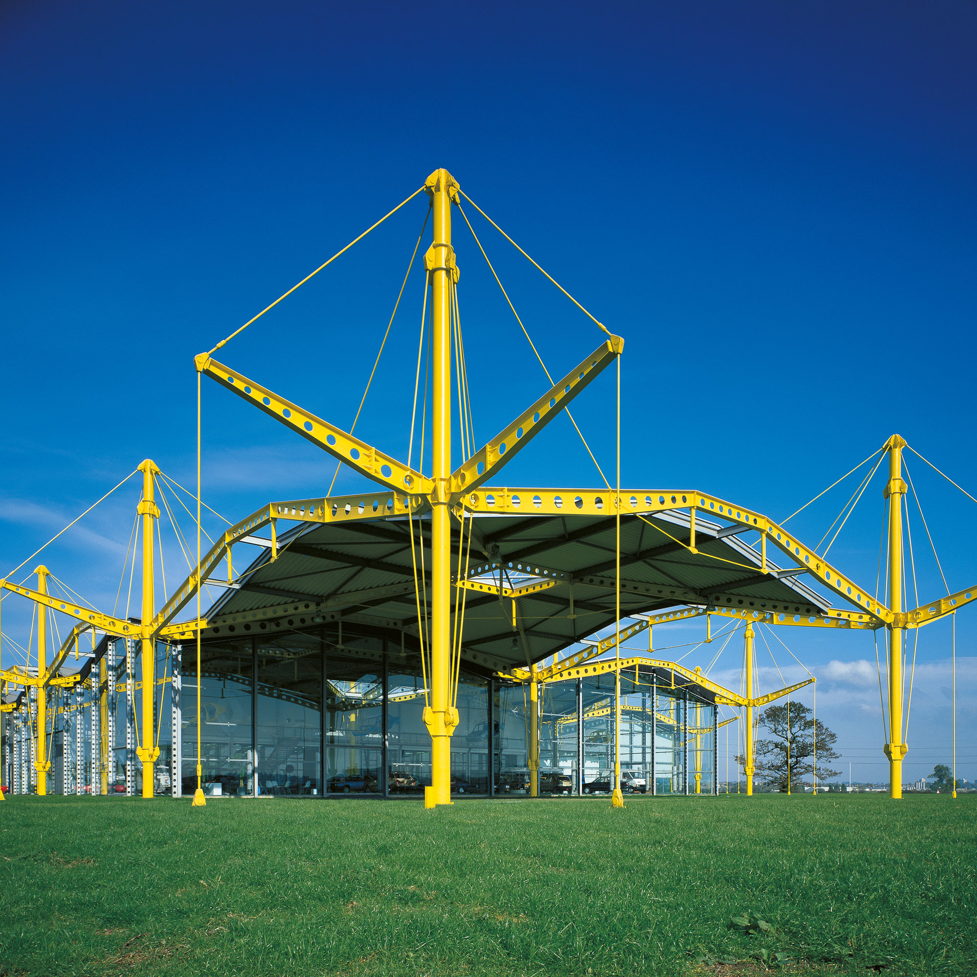 The Renault Centre has been described as the practices most playful structure. However, its development owes much to earlier, perhaps more reticent schemes for clients such as Reliance Controls and Fred Olsen, which delivered inexpensive, flexible buildings to tight schedules. The Centre was commissioned as the French car manufacturers main UK distribution facility. In addition to warehousing, it includes a showroom, training school, workshops, offices and a staff restaurant. The notion that good design pays has almost become a clich, but in this case it is quantifiable: on the strength of the design, supportive local planners increased their site development limit from 50 to 67 per cent, allowing a floor area of 25,000 square metres. This is housed within a single enclosure supported by brightly coloured tubular masts and arched steel beams, forming a striking silhouette within its surrounding landscape.