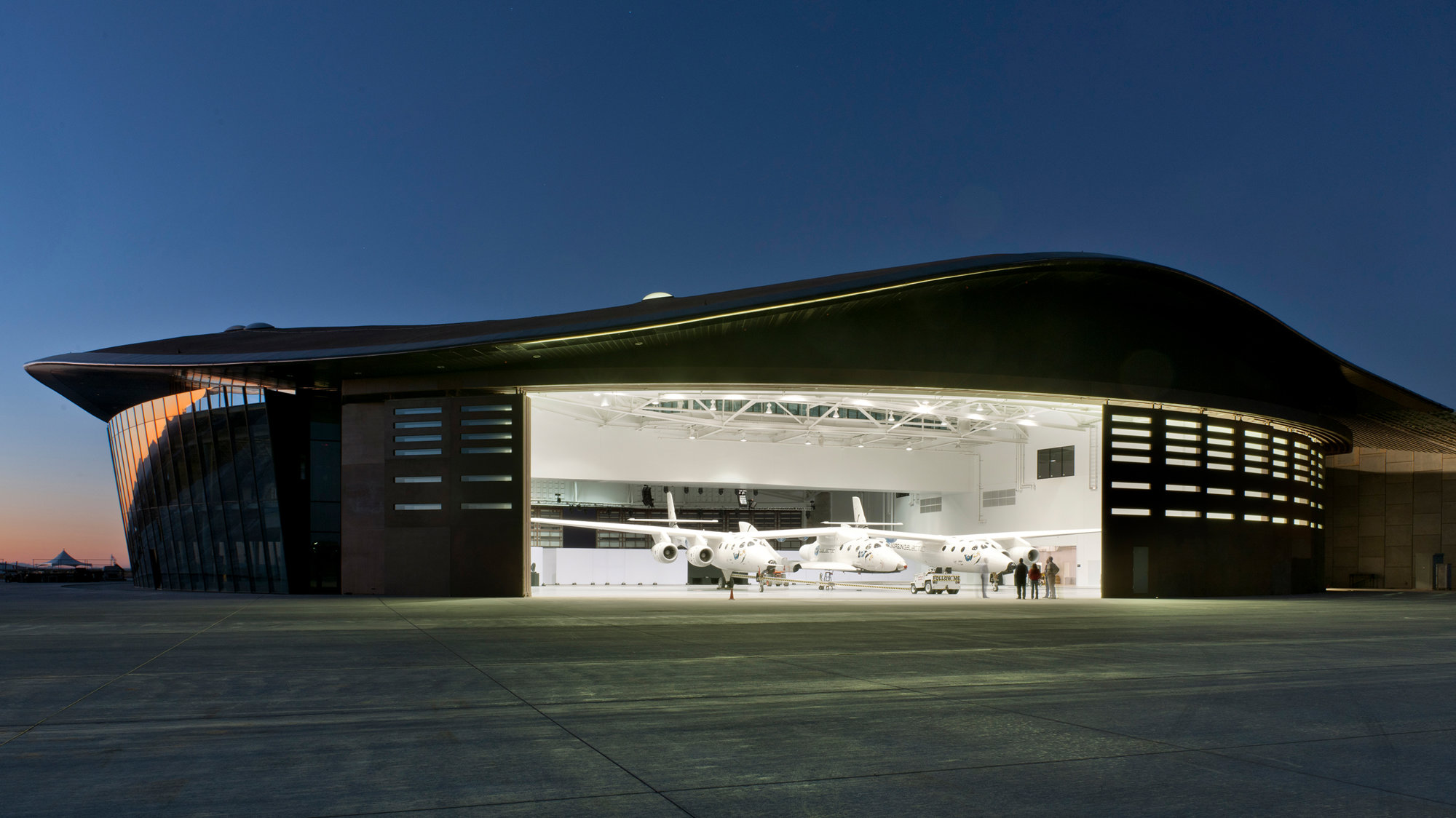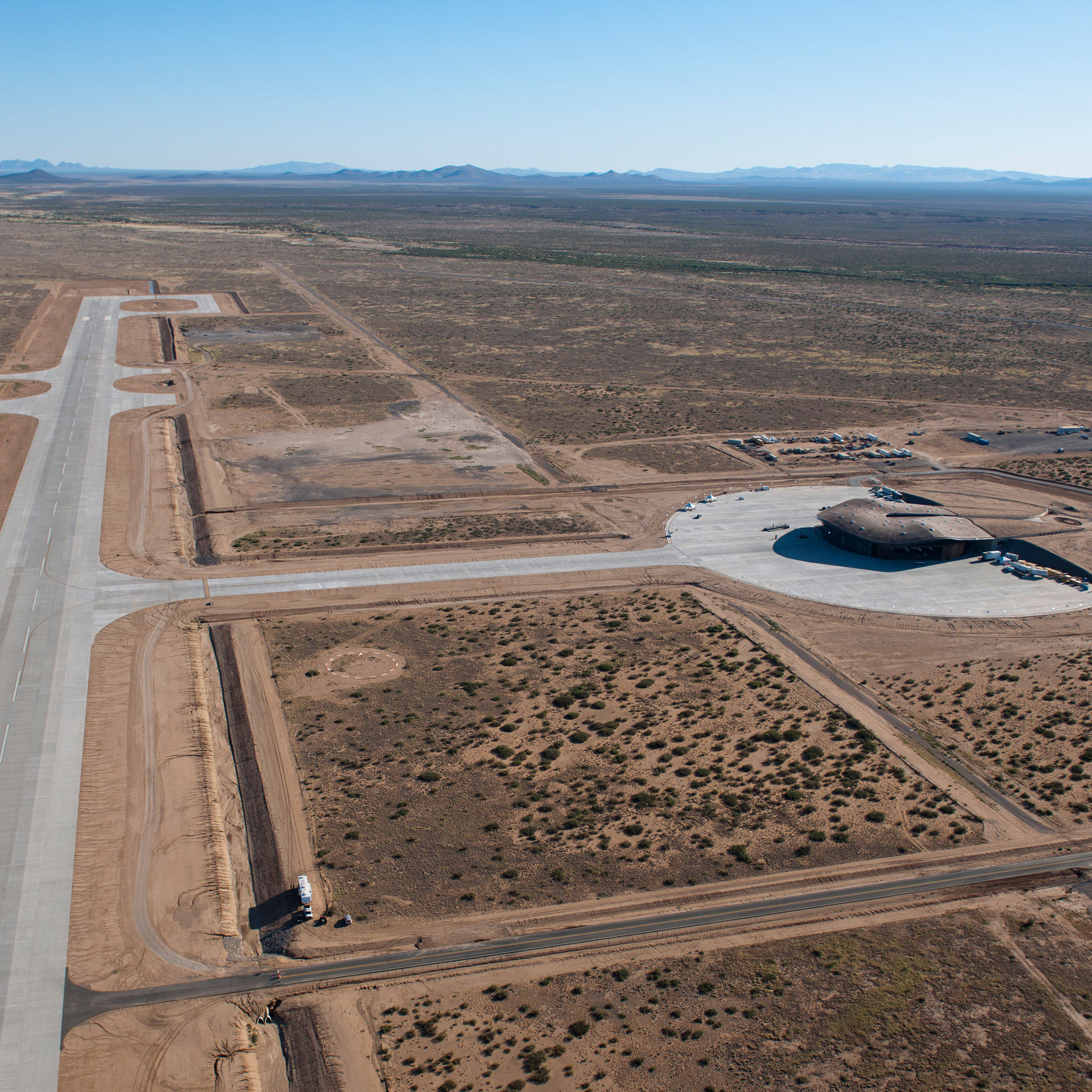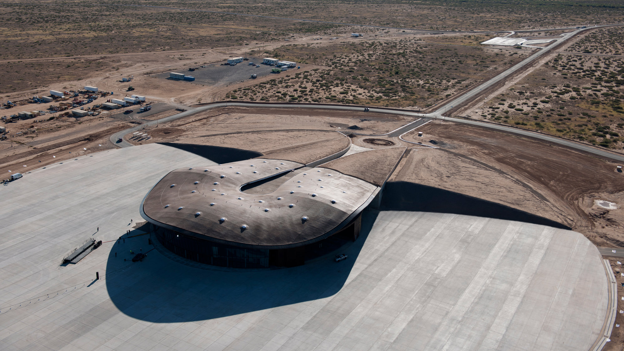 Located in the desert-like landscape of New Mexico, Spaceport is the first building of its kind in the world. Its design aims to articulate the thrill of space travel for the first space tourists while making a minimal impact on the environment. Viewed from space, the terminal evokes Virgin Galactic’s¬ brand logo of the eye, and is suggestive of an elongated pupil, with the apron completing the iris. Approached from the historic El Camino Real trail, the terminal’s organic form appears as a subtle rise in the landscape.