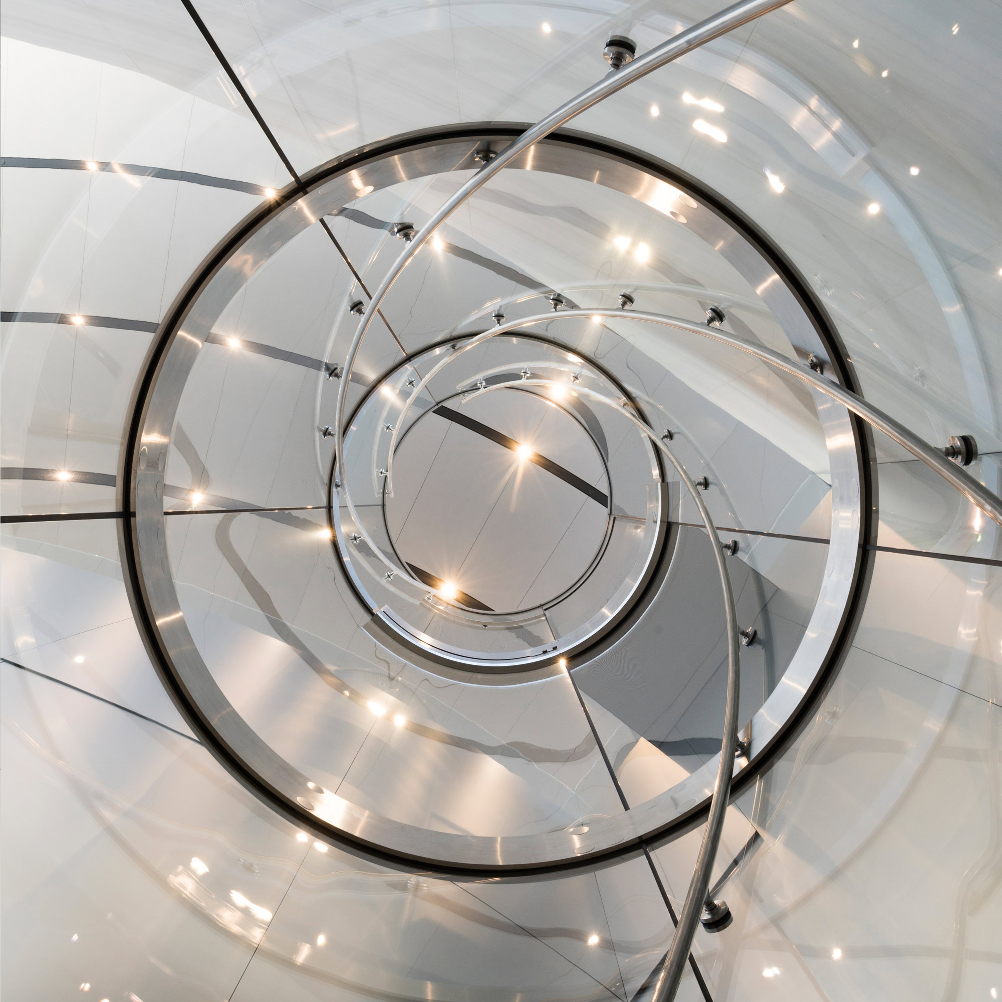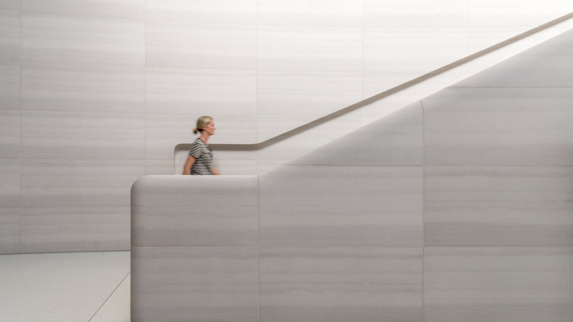 The purity of the lobby finds resonance in the ambitious custom glass elevator. In a world-first, it uses helical guide rails to rotate the car 171 degrees between levels. Two sculpted-stone stairways provide a slower descent into the belly of the Theater. The stairways culminate in a tight, compressed space, surrounded by three stone walls and a stainless-steel drum made of sliding panels.