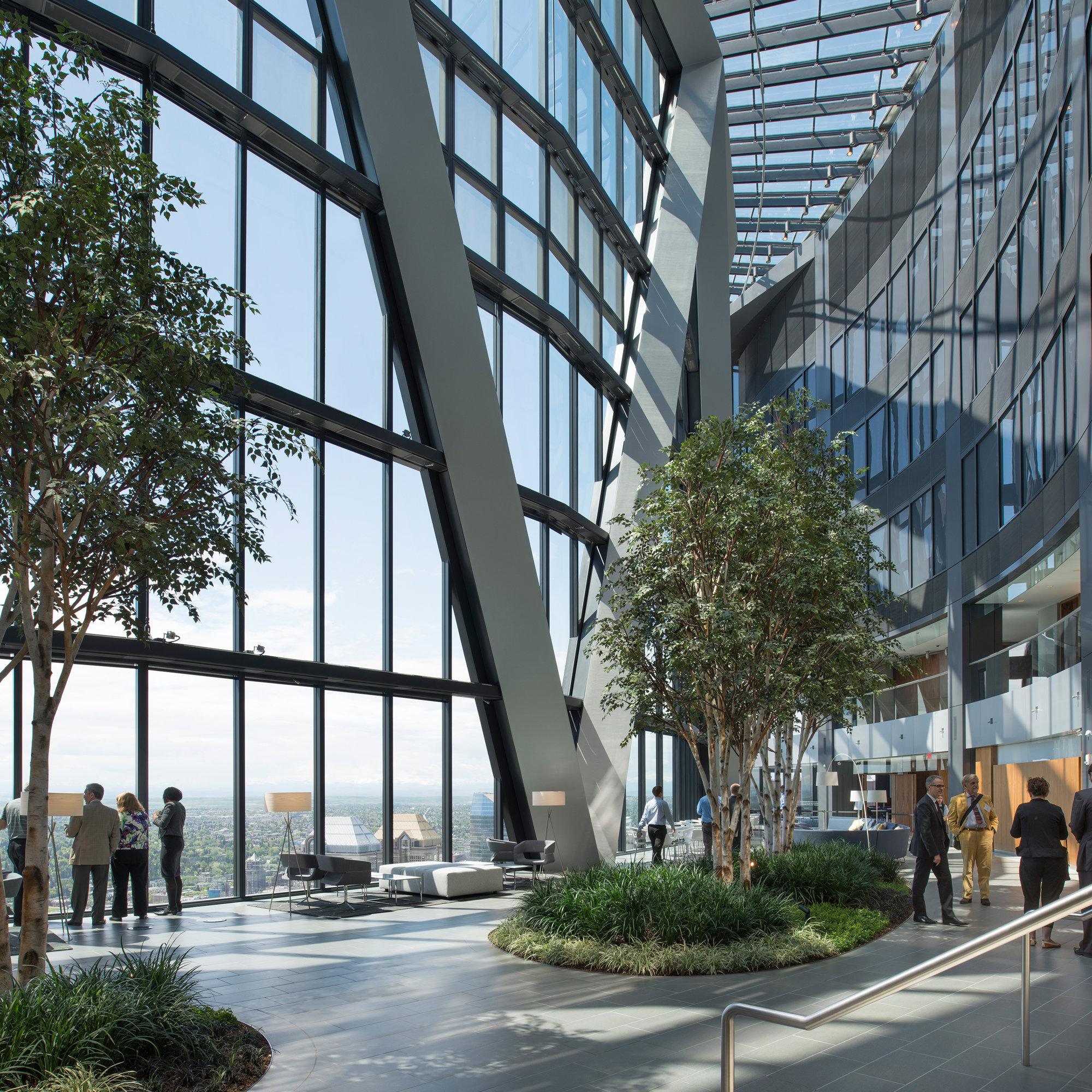 By turning the convex facade into the prevailing wind, the structural loading is minimised, so reducing the amount of steel required for the inherently efficient diagrid structural system. The diagrid structure, in which each triangulated section unifies six storeys, also helps to break down the scale of the building visually. Where the building curves inwards, the glazed facade is pulled forward to create a series of atria that run the full height of the tower. These spaces act as climatic buffer zones, insulating the building and helping to reduce energy consumption by approximately 30 per cent. As each floor plate has been sized to accommodate a whole business unit, there was a need to promote collaboration and bring a social dimension to the office spaces. Vertical access to the office floors is therefore directed through three sky gardens, which project into the atria at levels 24, 42 and 54. These communal spaces feature mature trees, seating, meeting rooms and local lift cores. Staff facilities in the atria are complemented by an auditorium at the very top of the building.