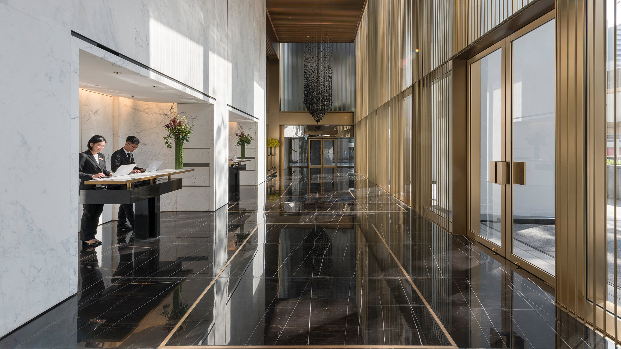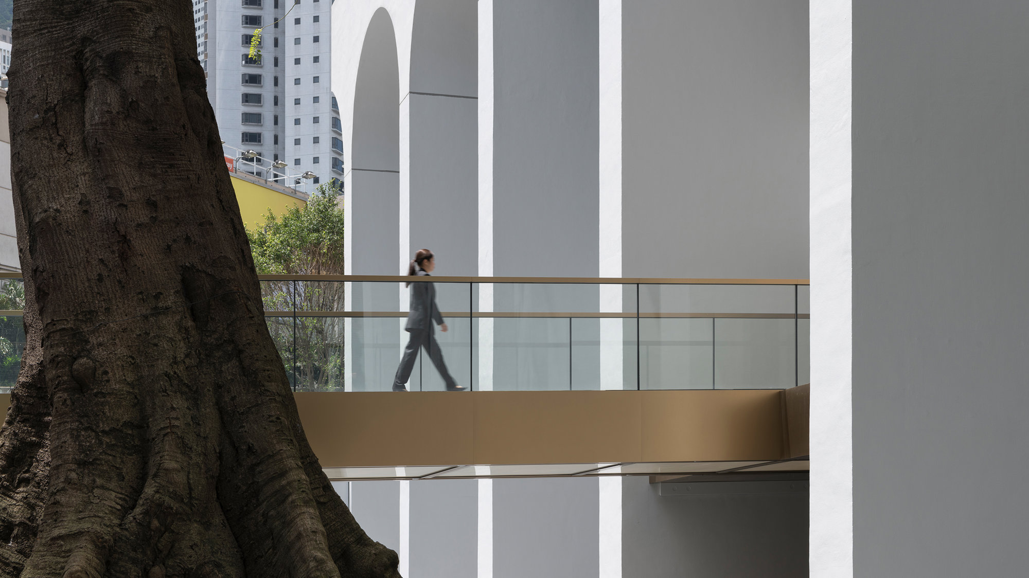 A former government headquarters tower, the Murray Building was originally designed at a time when the city was planned around the car, and consequently stands on an island site, surrounded by roads making it impermeable for pedestrians. One of the central aims of the project is to reconnect the building with the city at ground level, creating a new street frontage on Garden Road, transparent and welcoming ground floor spaces, and enhancing and extending the landscaped grounds to incorporate a public tai chi area. At the tower’s base is a sequence of four-storey high arches intersected by a podium, and a vehicle ramp, which is a distinctive feature of the original building. A large Old and Valuable tree, which rises up through a void in the parking slab of the podium has been liberated and conserved as the centrepiece of the arrivals sequence for guests.