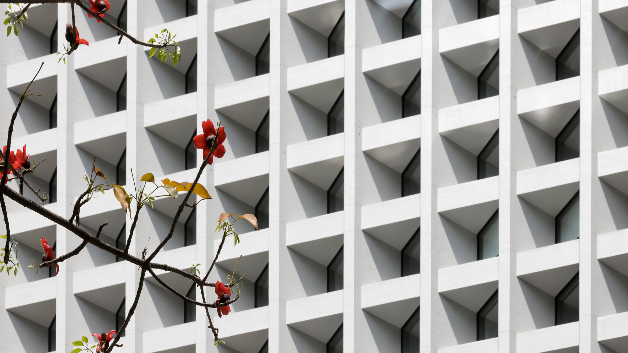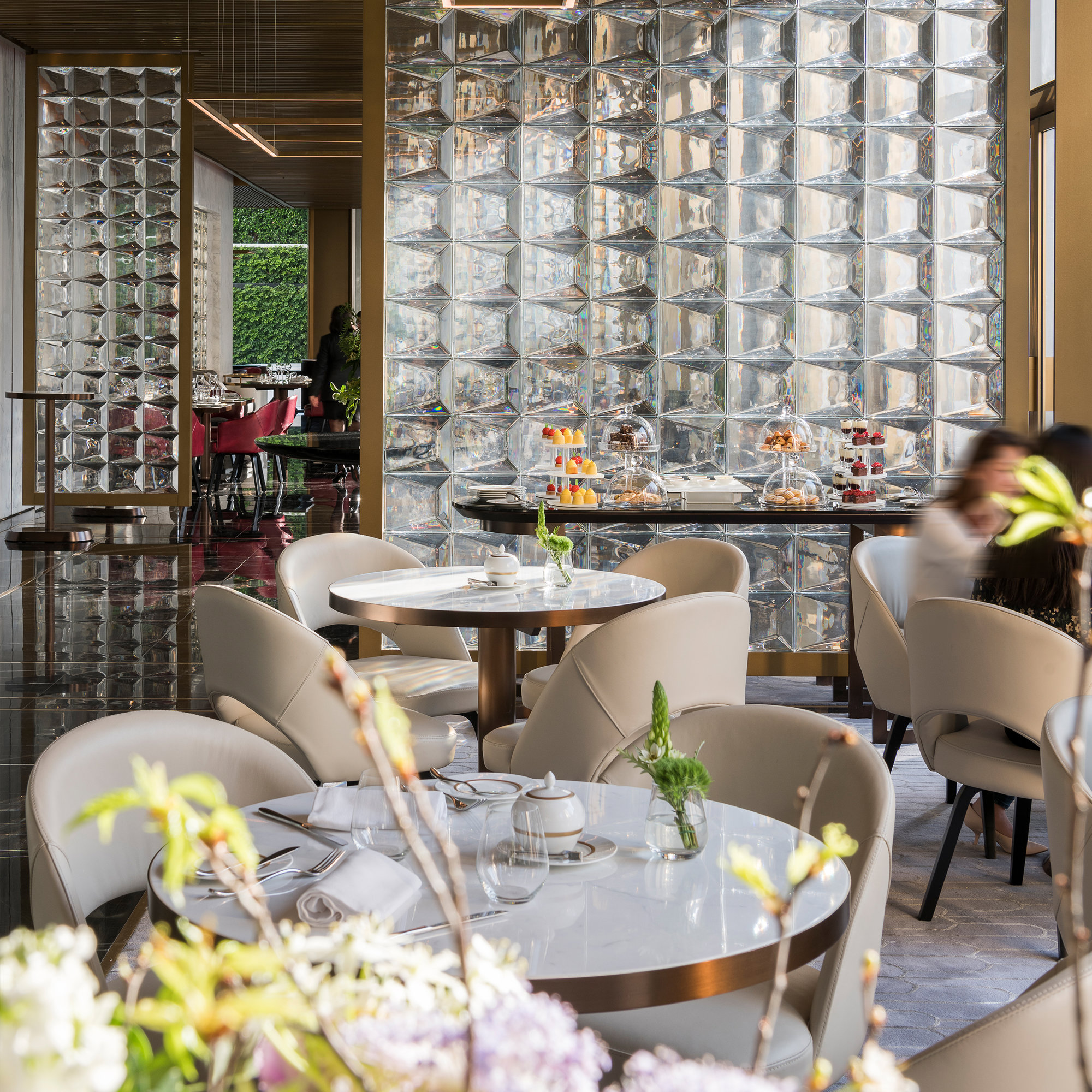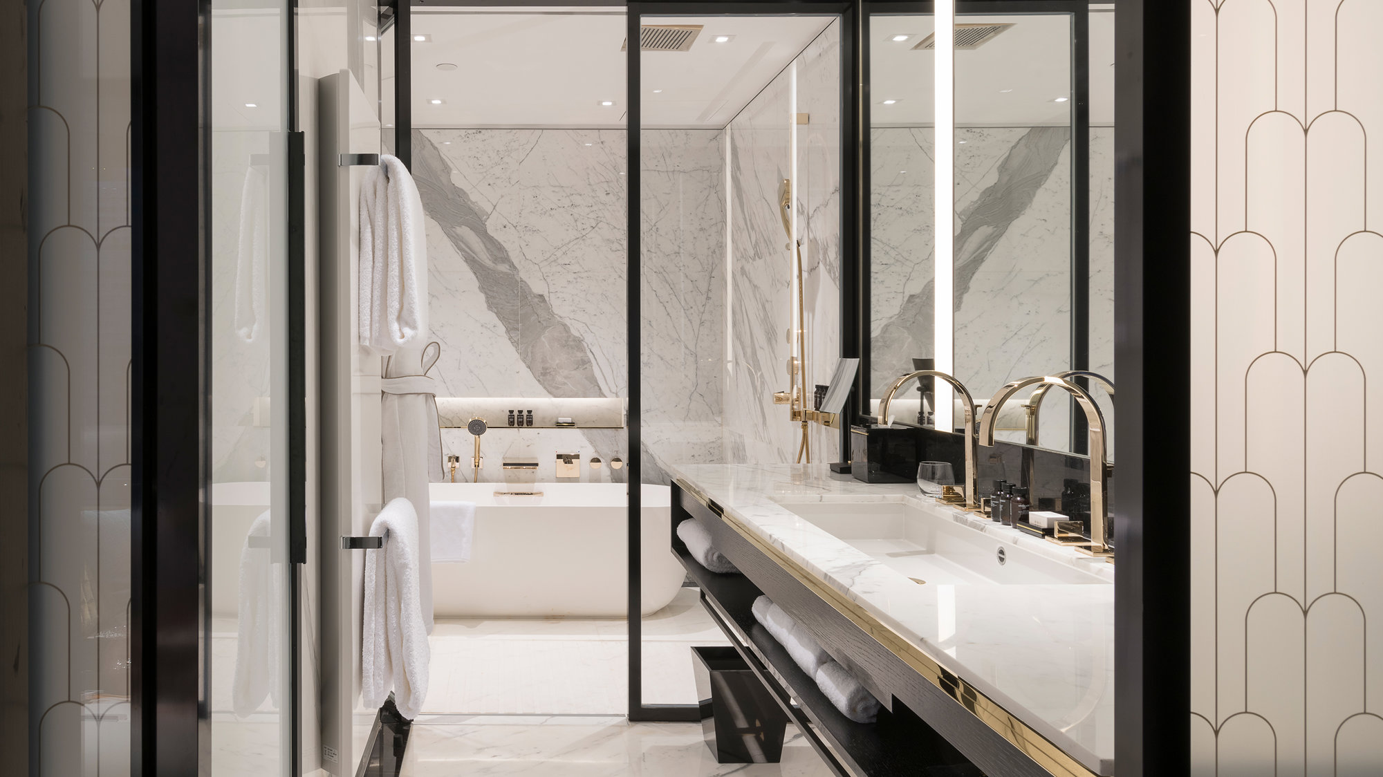 The tower is characterised by the distinctive pattern of its white façade, which is made up of a grid of square windows. In a fusion of interior and exterior, the inset bays provide a modular unit and organising principle for the hotel rooms, allowing for a variety of planning options. The upper level suites are angled to create a generous central living space. Luxurious corner suites benefit from spectacular dual-aspect views of the harbour and the peaks and gardens.
