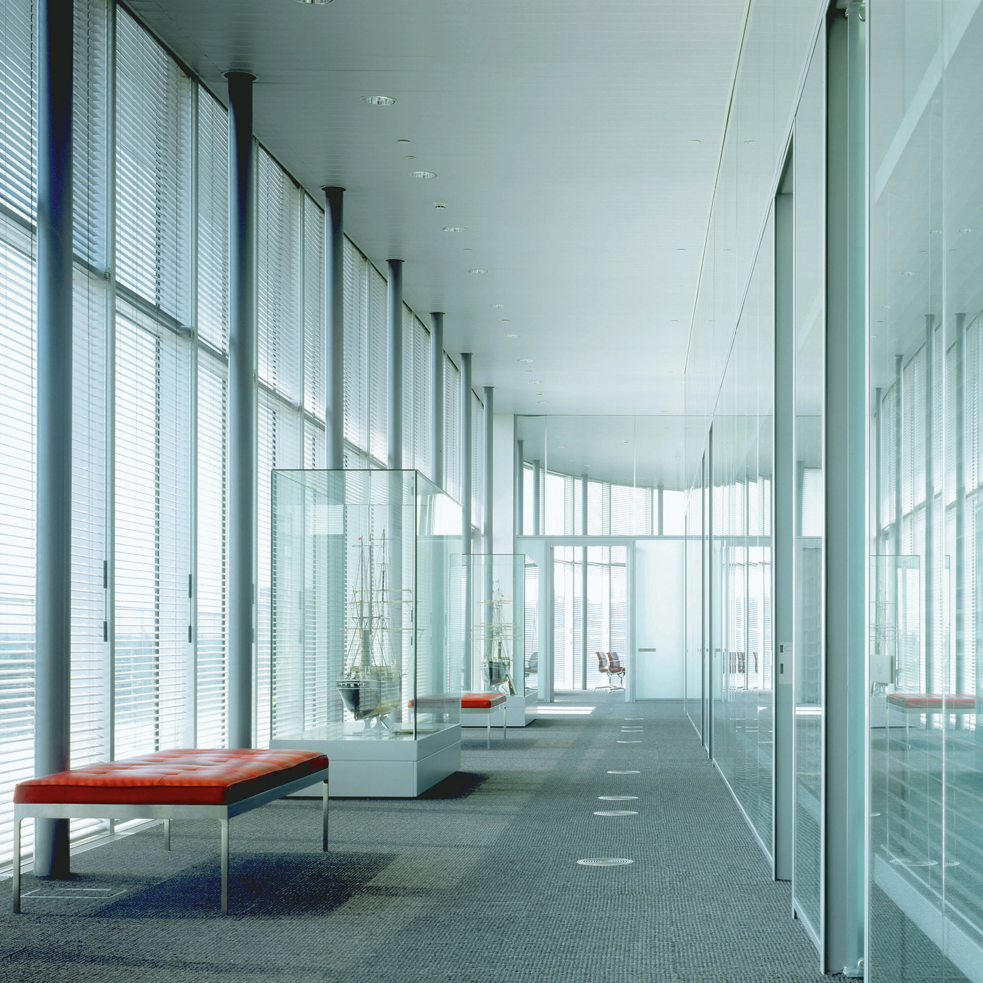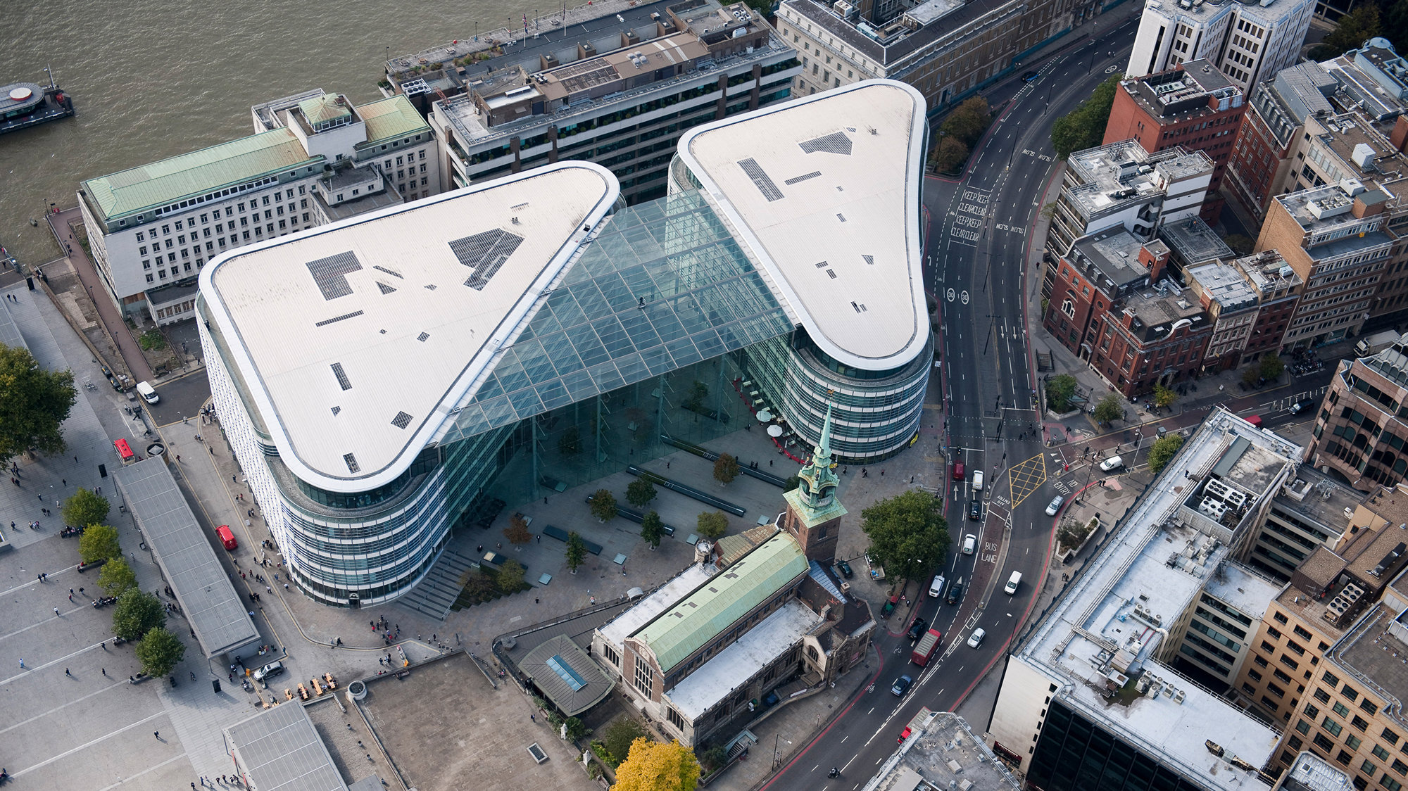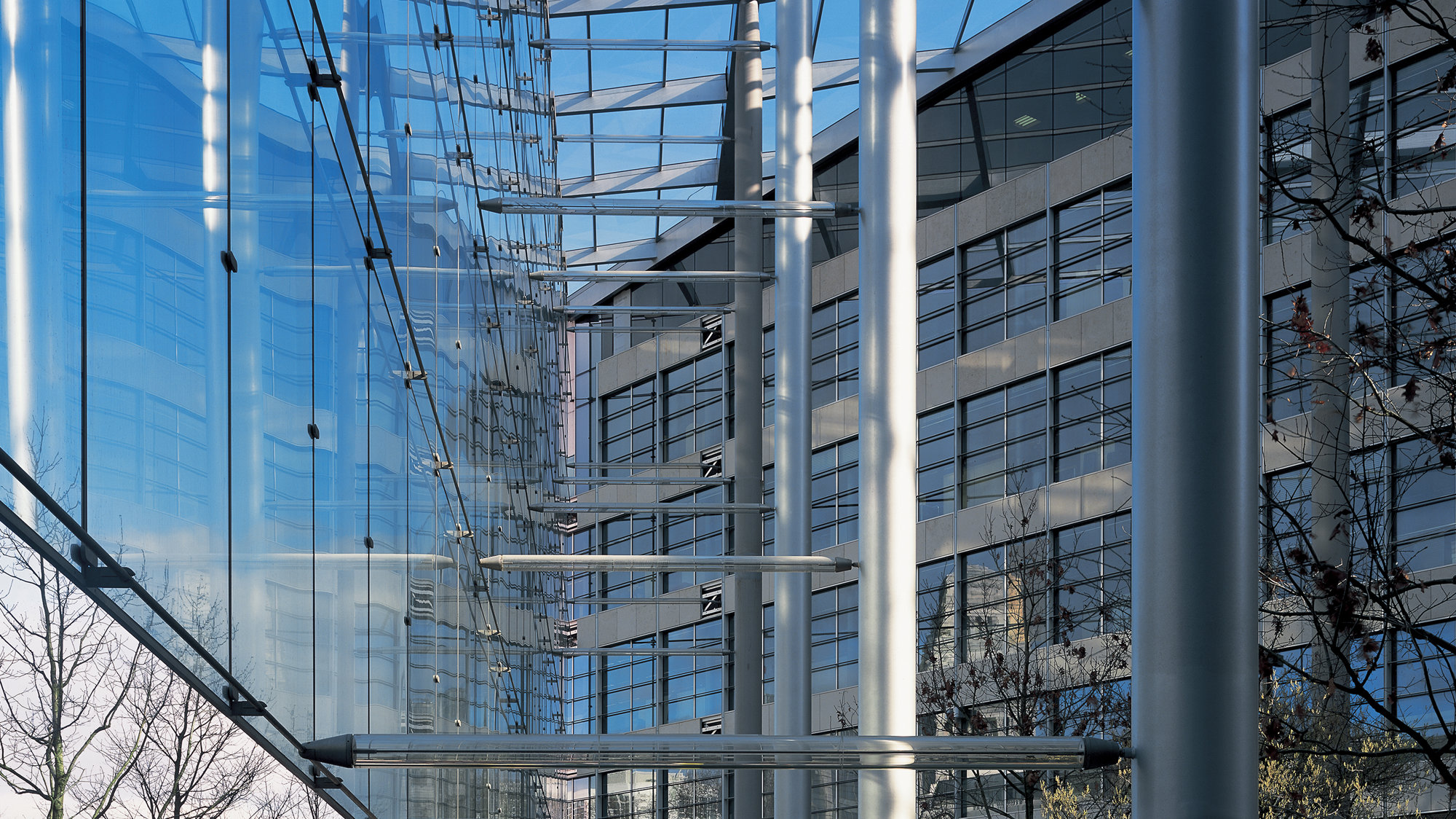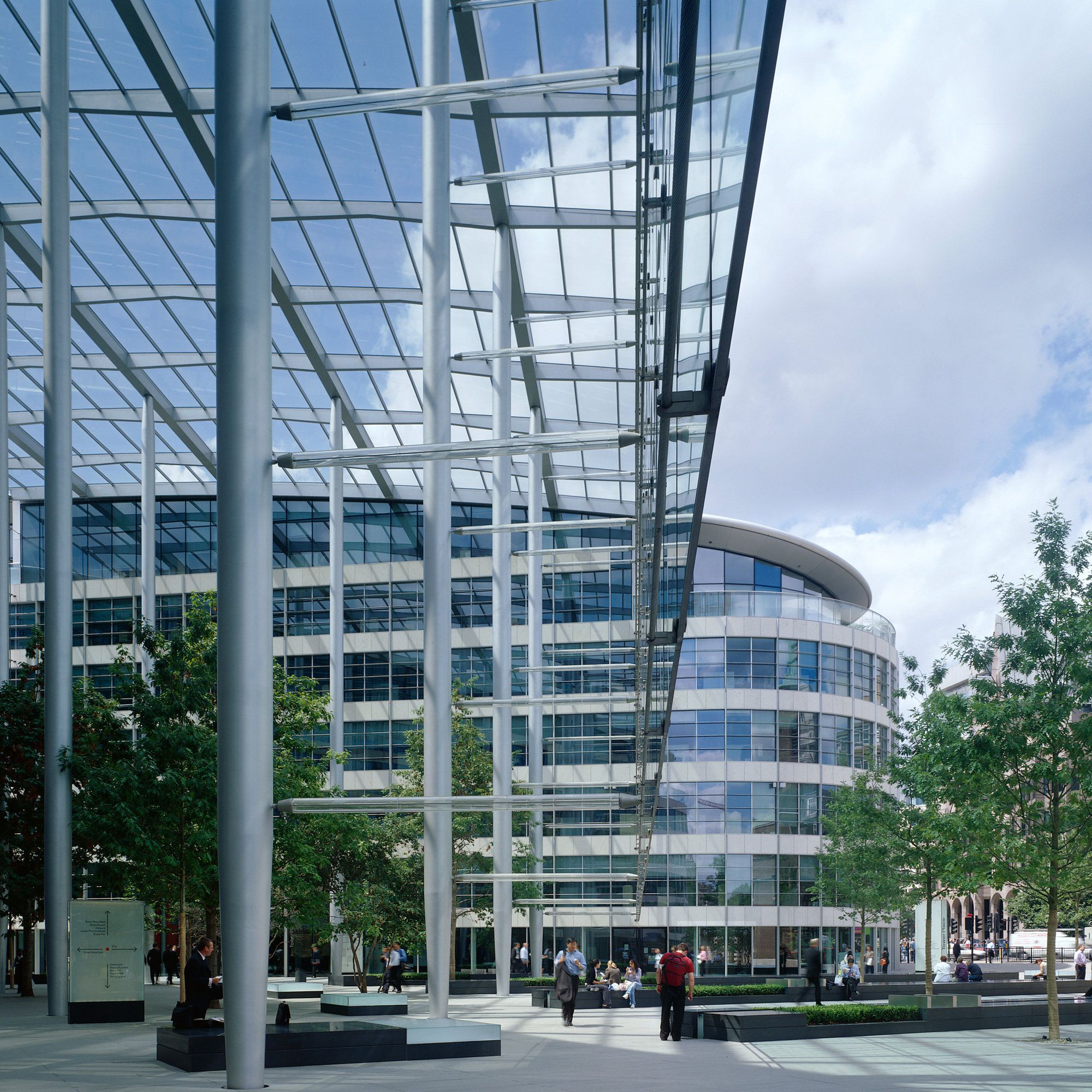 The development is configured in two blocks, broadly triangular in plan. The stone and glass cladding system is designed to allow maximum daylight penetration, while blade-like aluminium louvres provide solar shading and add a shifting textural layer to the facades. Linking the two blocks is a glazed atrium - one of the largest such spaces in Europe. The engineering of the atrium's glass walls is highly advanced. Glass panels are hung like curtains from tension cables stretched between the two buildings; they terminate a storey above ground level to define a naturally ventilated space that forms a covered extension of the piazza outside. The space incorporates two designated City Walkways, inviting people to use it as a thoroughfare or as a place to meet friends and colleagues throughout the day.