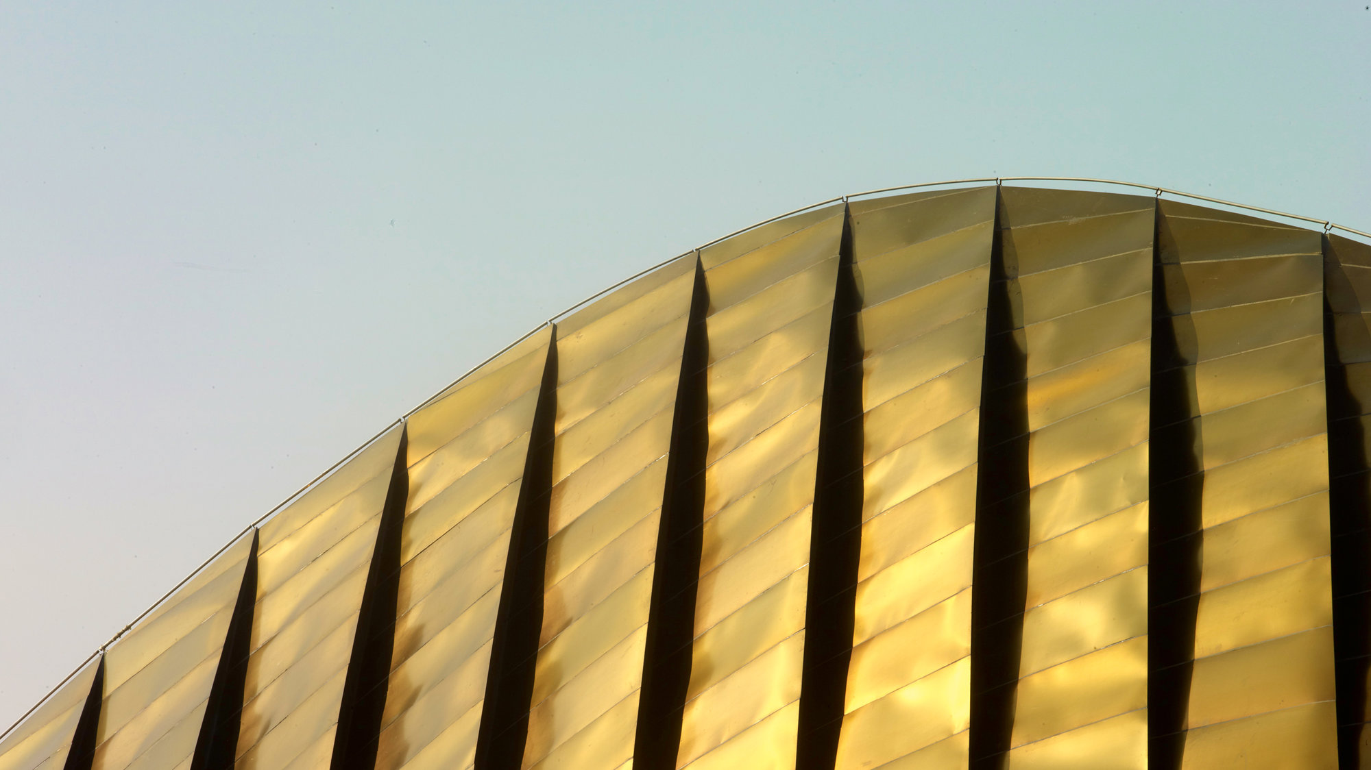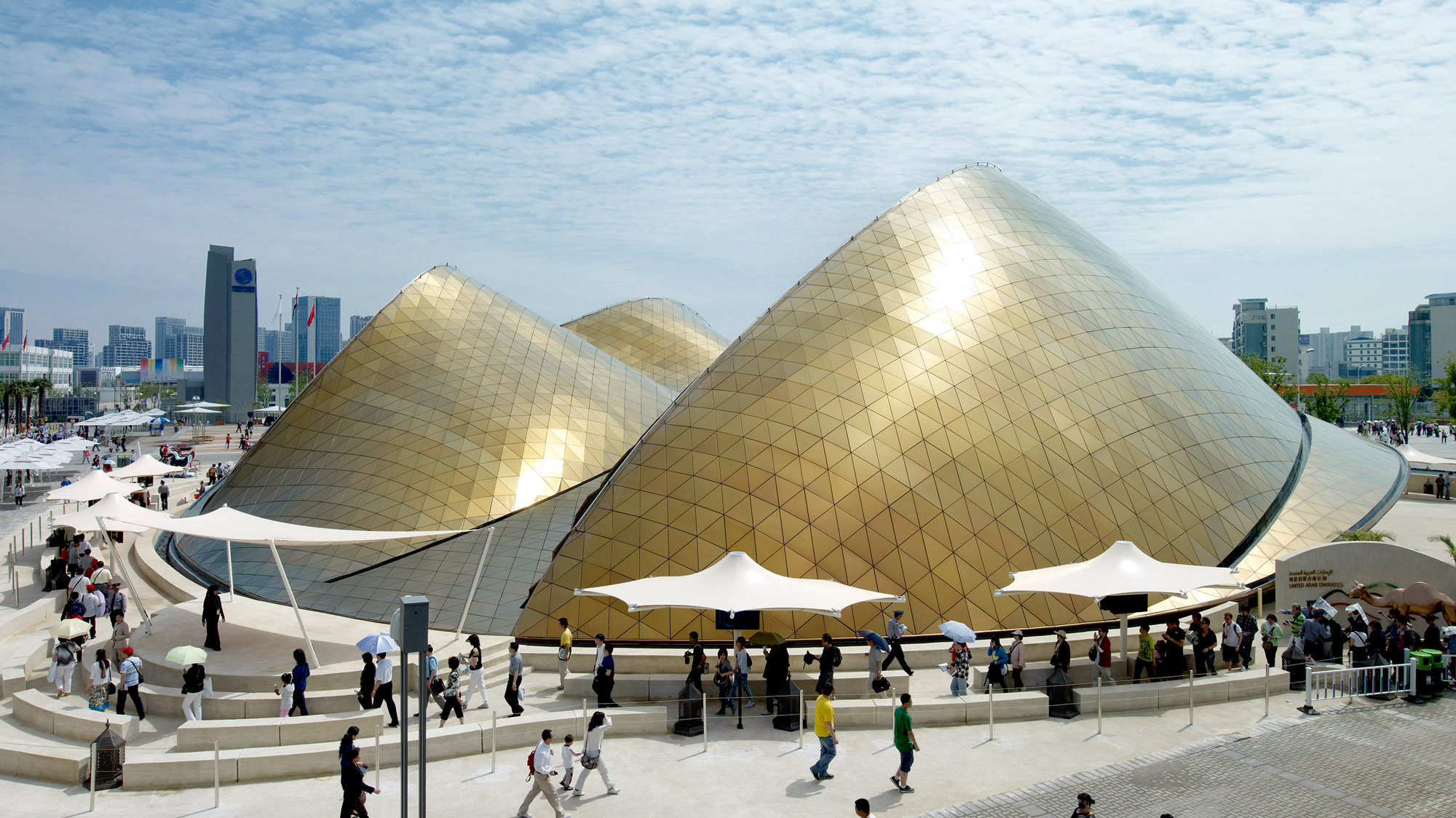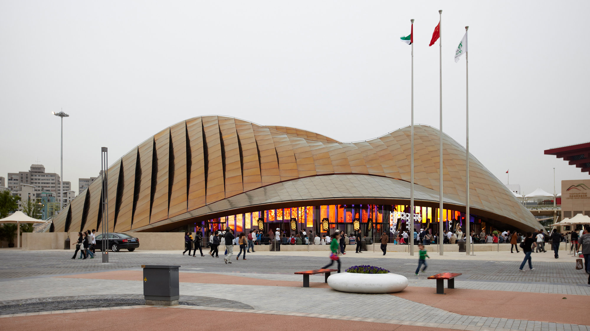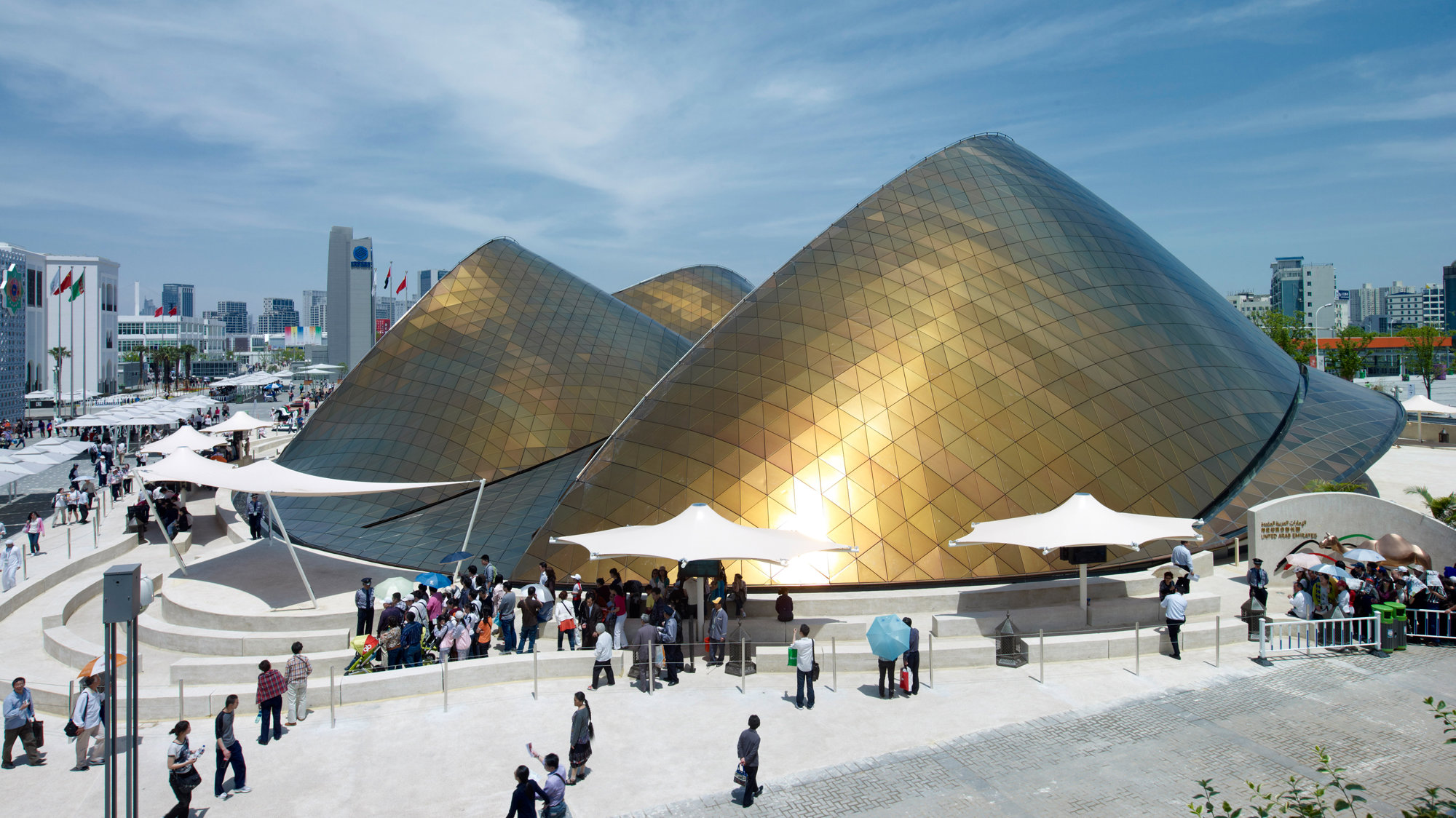 The landscape and climate of the United Arab Emirates (UAE) are an elemental part of Emirati culture. The form of the UAE Pavilion for the 2010 Shanghai Expo naturally drew inspiration from the vast rolling sand dunes that are a common feature of all seven emirates. The changing light and colours of the desert were further evoked in the building's reflective skin of gold-coloured stainless steel.