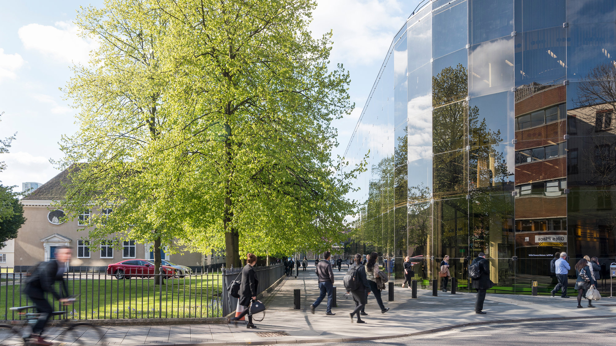 Externally, the building reinforces rather than confronts the urban grain. Low-rise, with a free-form plan, it responds to the scale of surrounding buildings, while its facade curves in response to the irregular medieval street pattern, flowing to the edges of its site like a pancake in a pan.