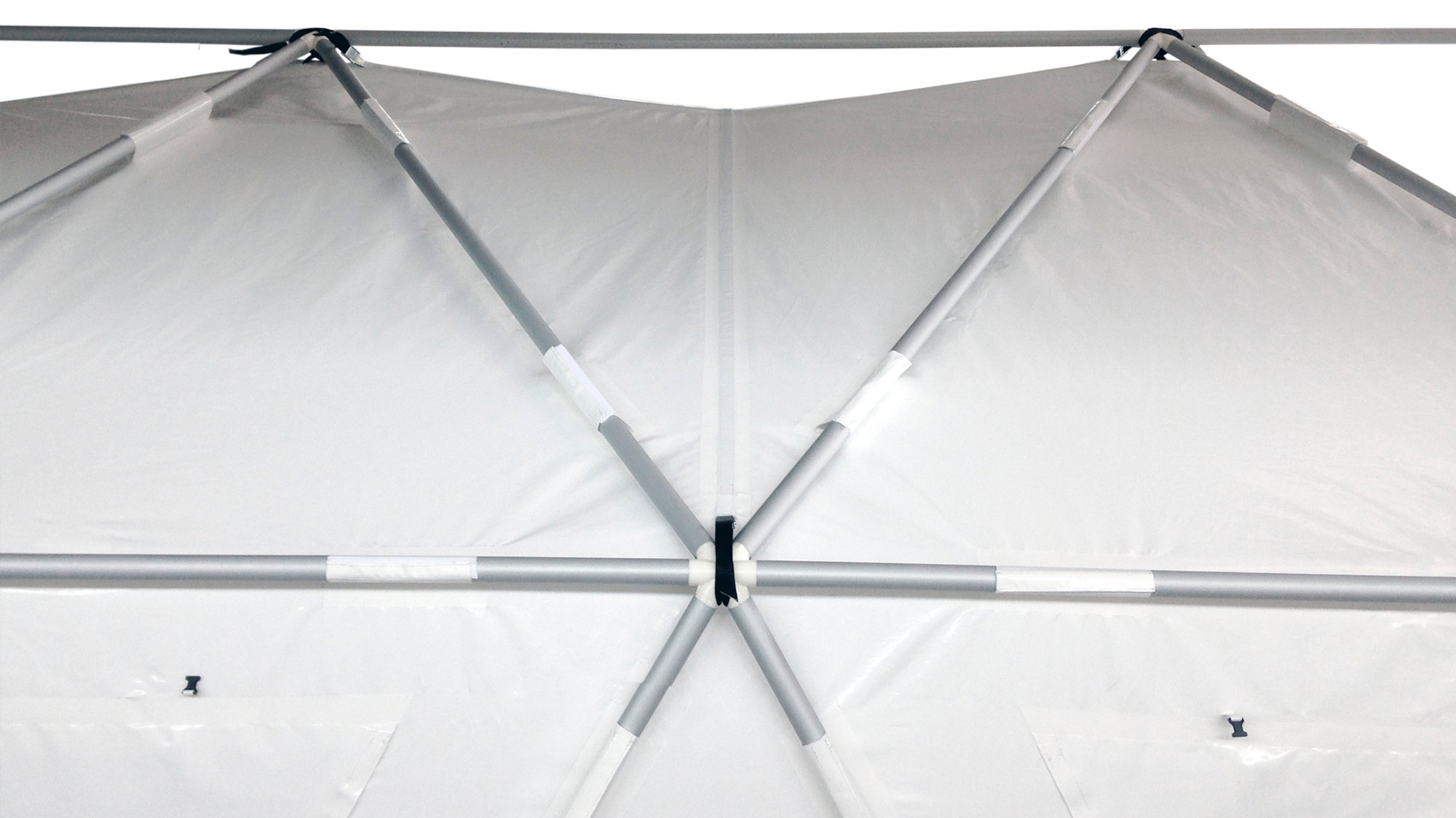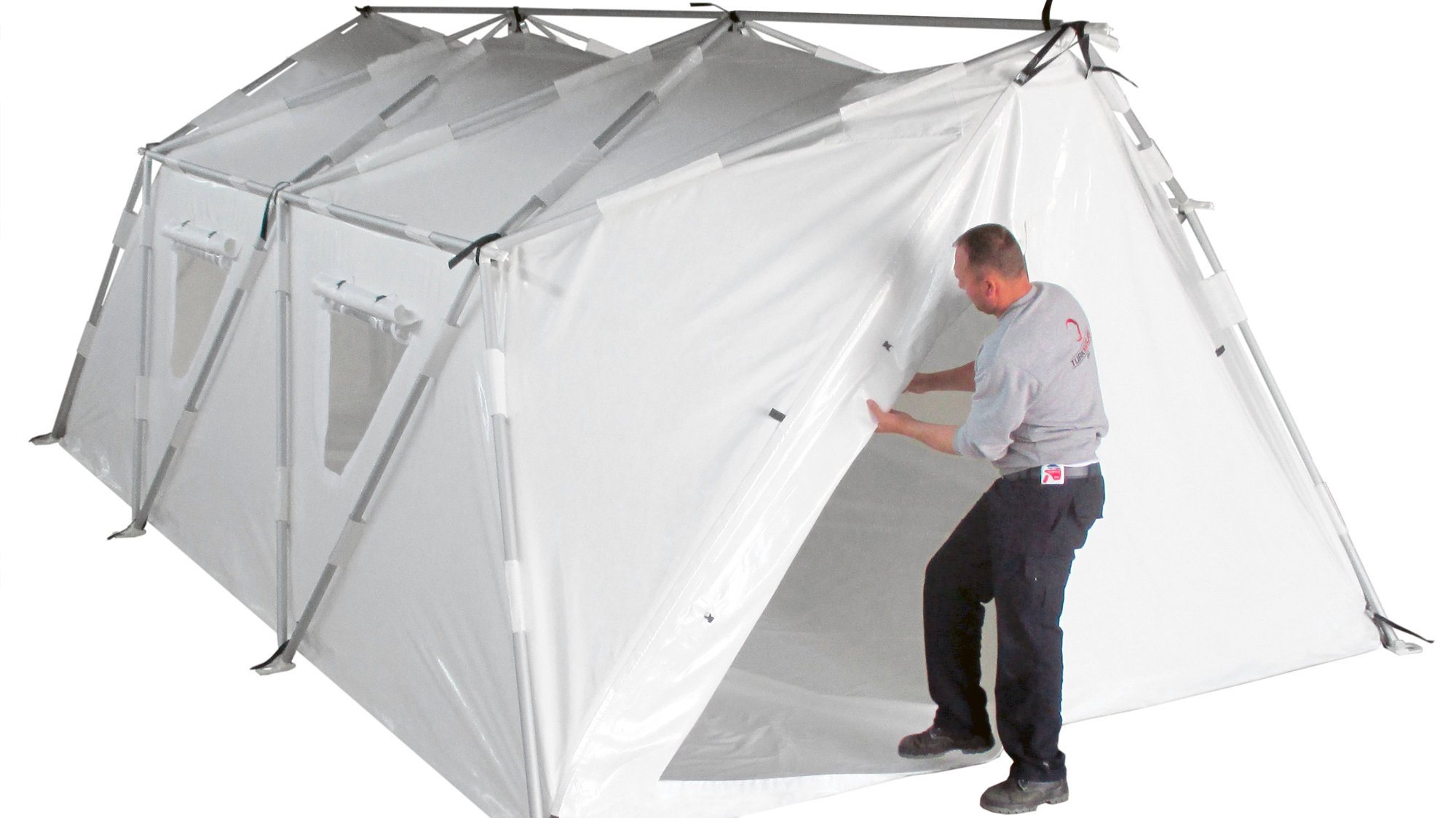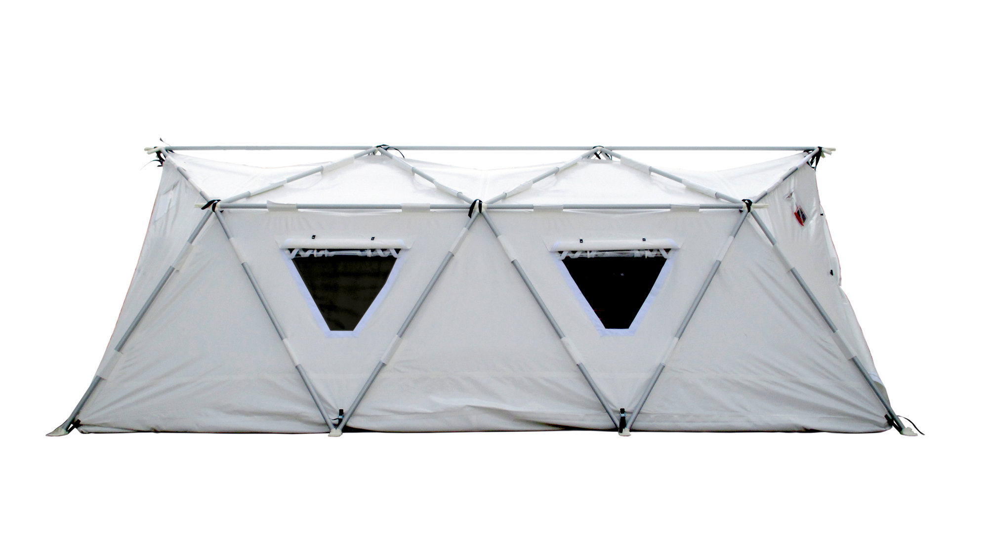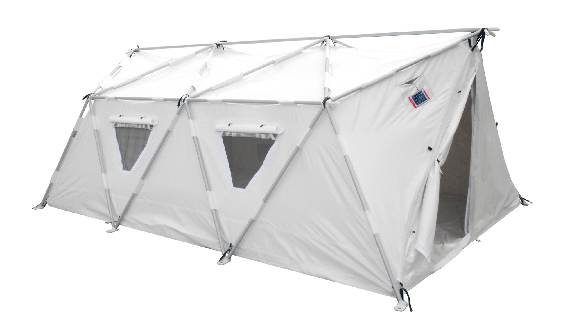 The design also incorporates an innovative enclosing solution. The inner and outer layers of a traditional tents are separate components, leading to time delays and mistakes during erection as well as inefficient thermal performance. The new tent is a single foldable composite shell made of an inner-layer of PET recycled felt, a controlled air gap mid-layer and an outer-layer of PVC, which allows for faster installation and better thermal insulation.