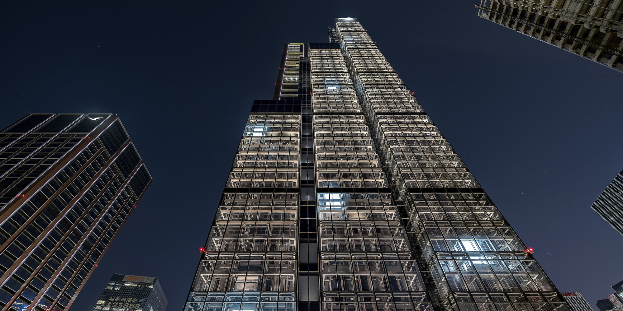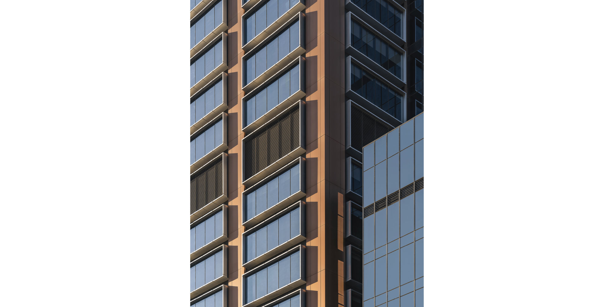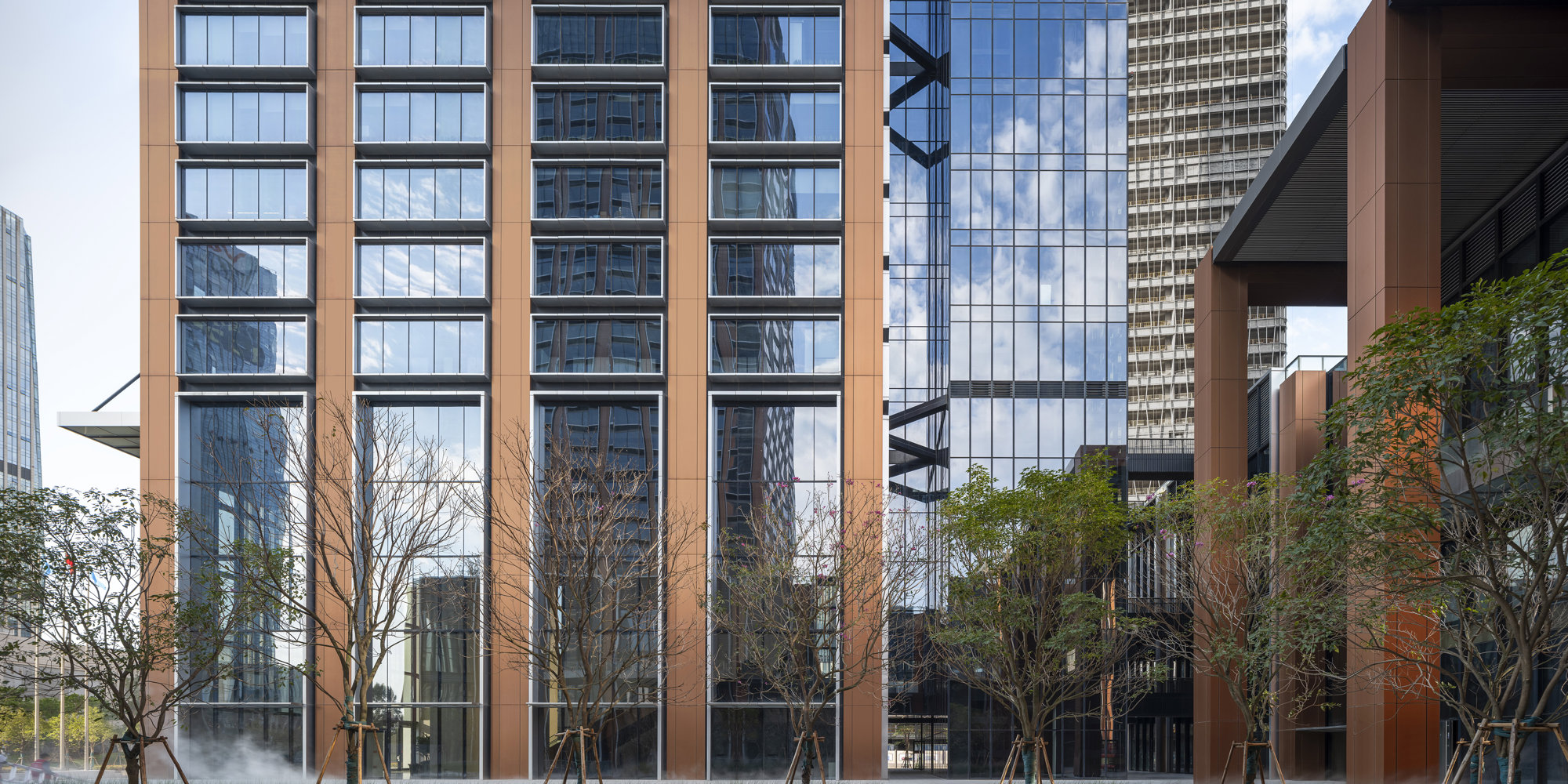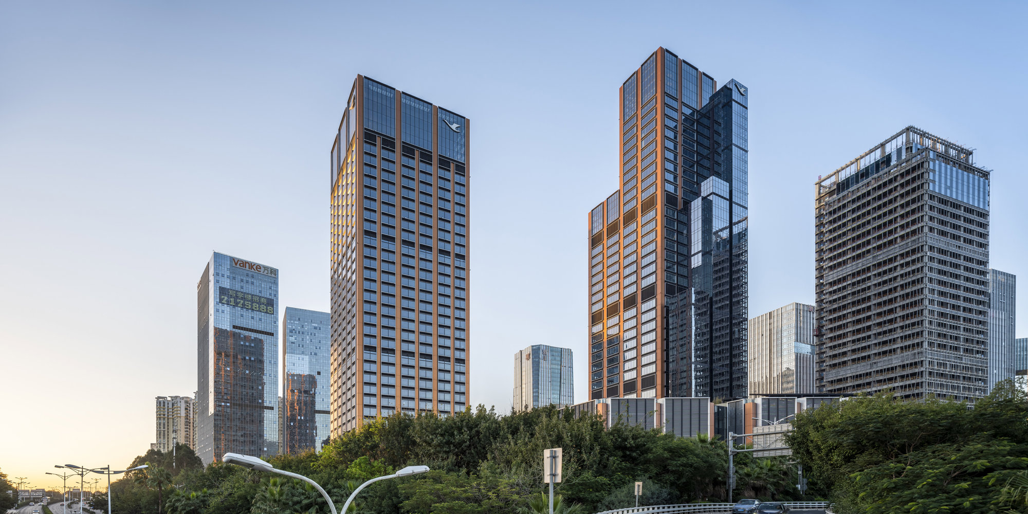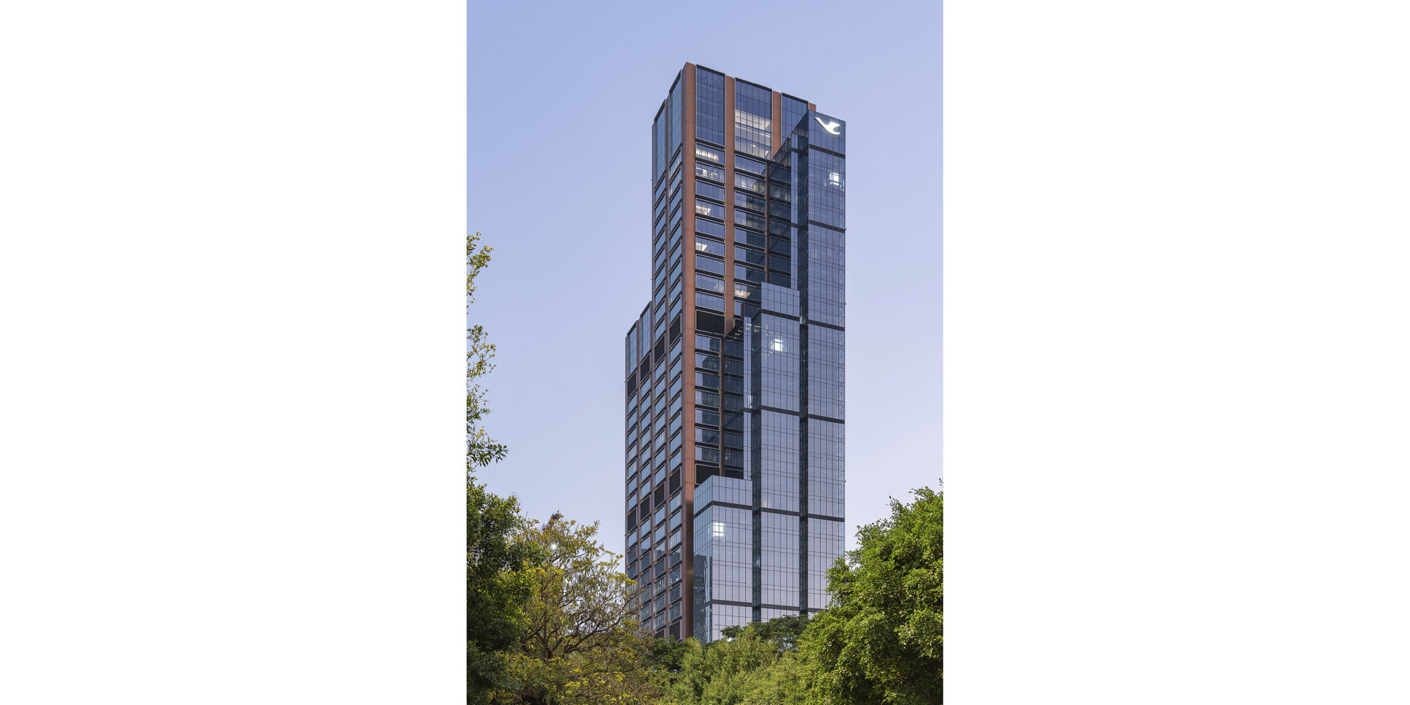 Inspired by the Wuyi Mountains and iconic paintings of the Chinese rock mountains, the new headquarters rises vertically through the landscape, creating a dynamic composition that is instantly recognisable. The tower’s split form conveys movement, and its materiality is strongly expressed. Metal panelling reflects varying light conditions, while anodised aluminium adds texture and depth. The building’s expressed glass lift shafts animate the north-western elevation, making the tower a dynamic focal point from the highway.